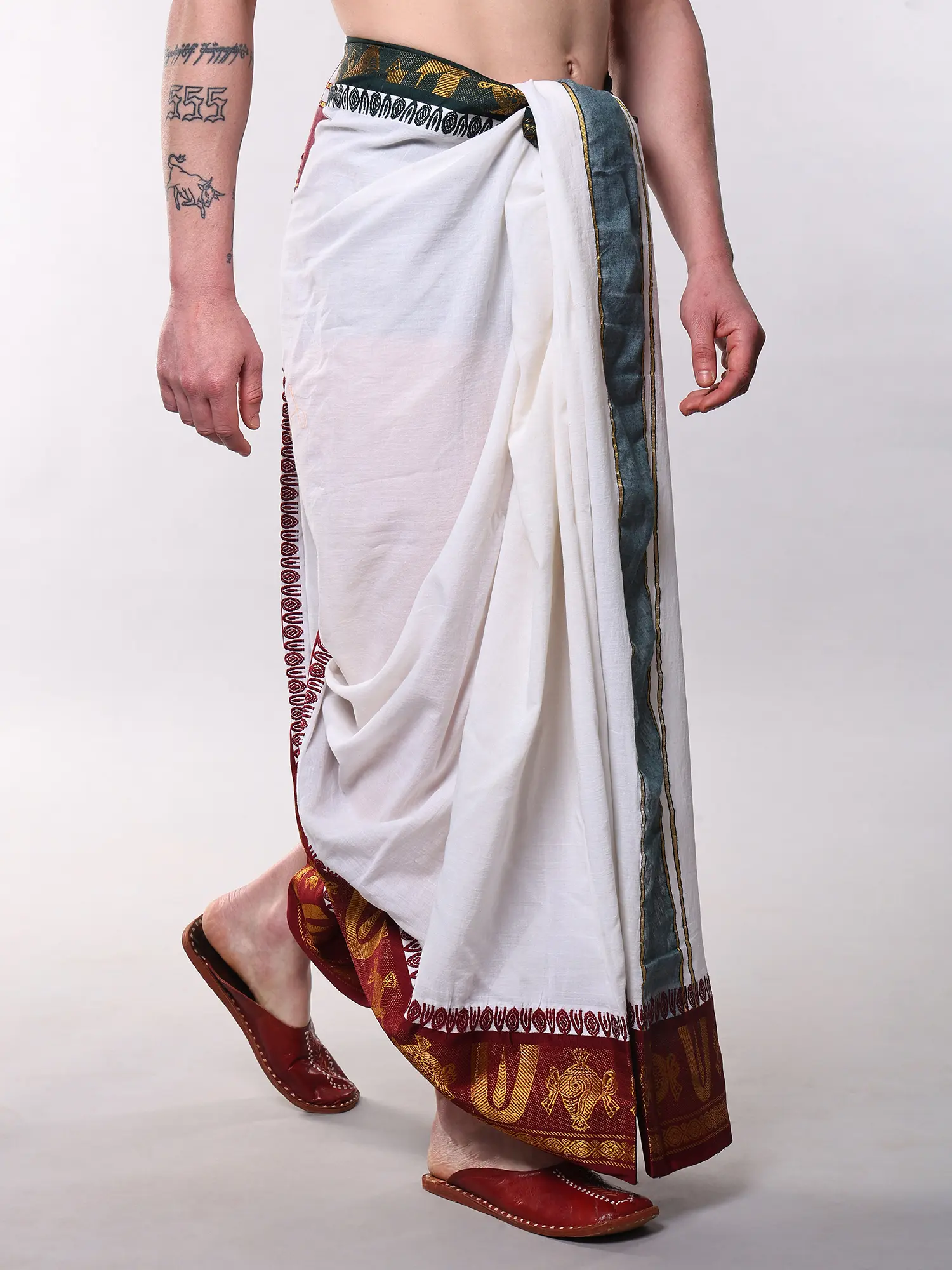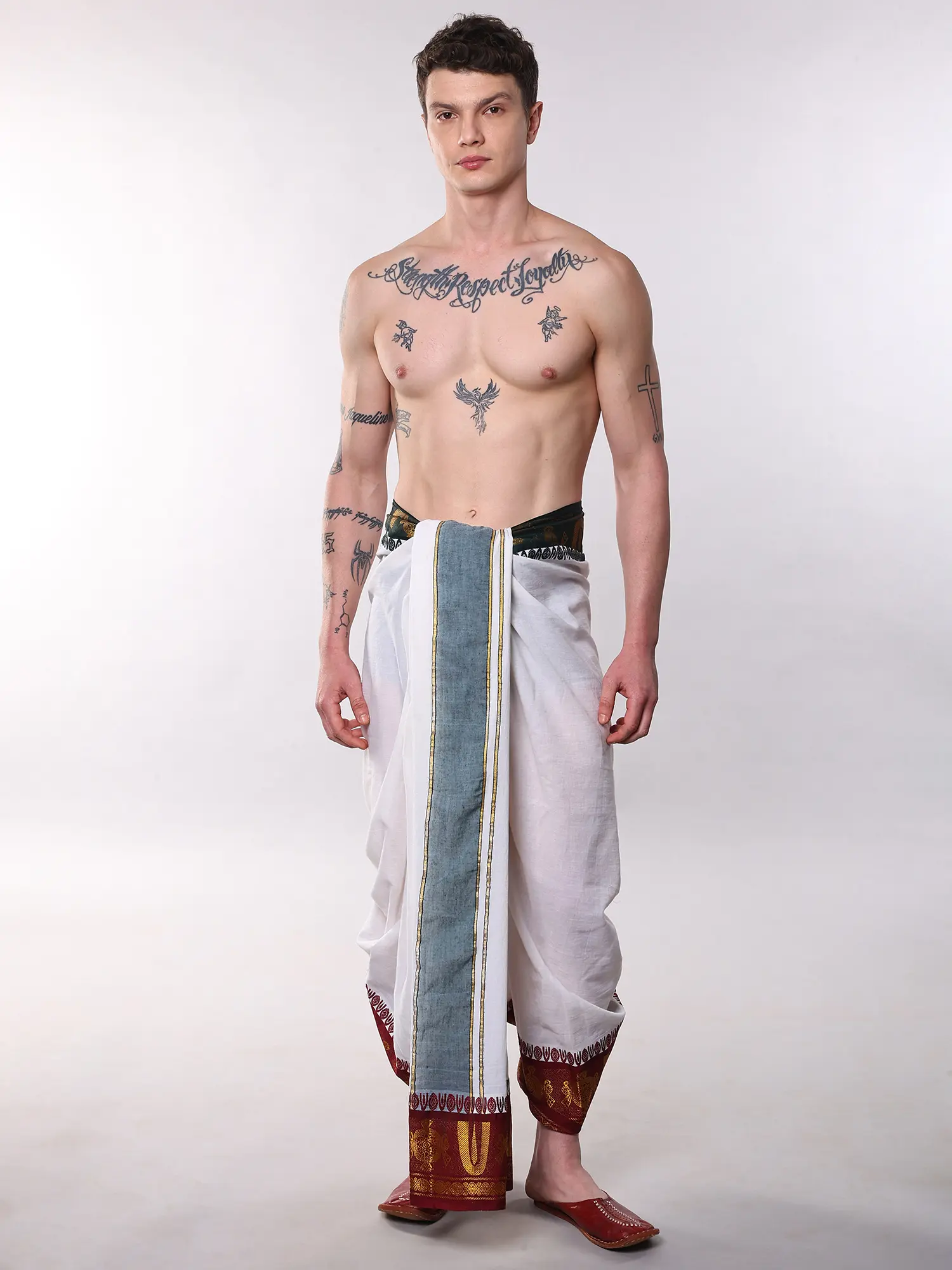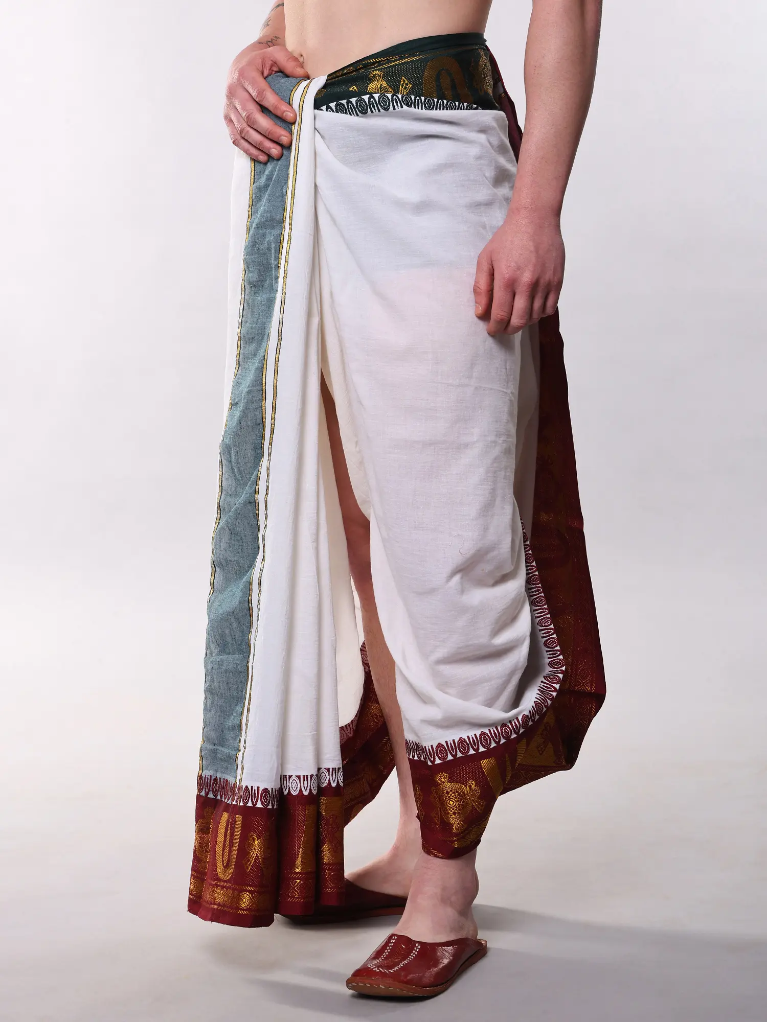 This particular style of dhoti is steeped in the rich cultural tapestry of India, particularly within spiritual and ceremonial contexts. It represents a sartorial tradition that has been passed down through generations, embodying purity, devotion, and respect. Wearing it connects you to a lineage of cultural practice and a philosophy of mindful living.