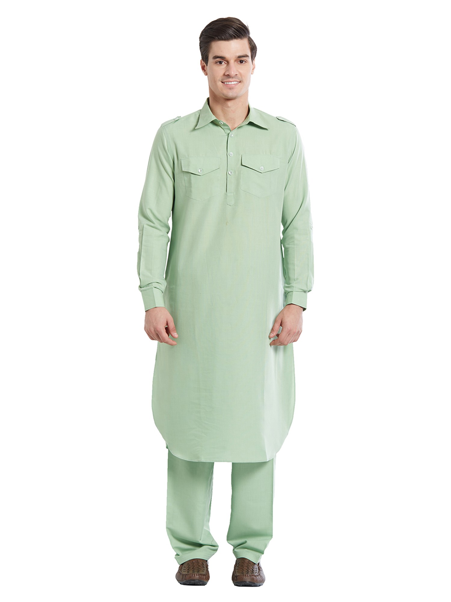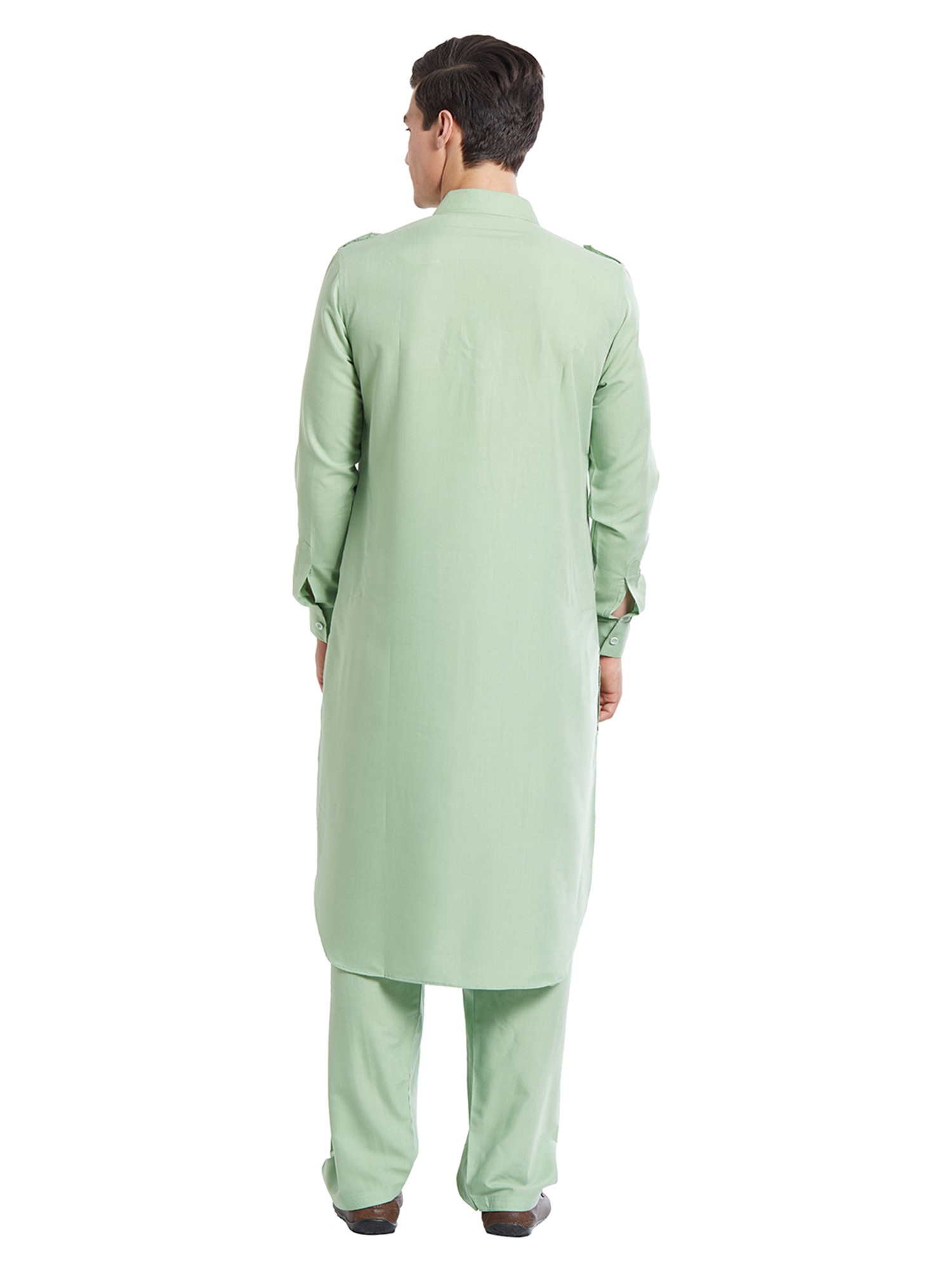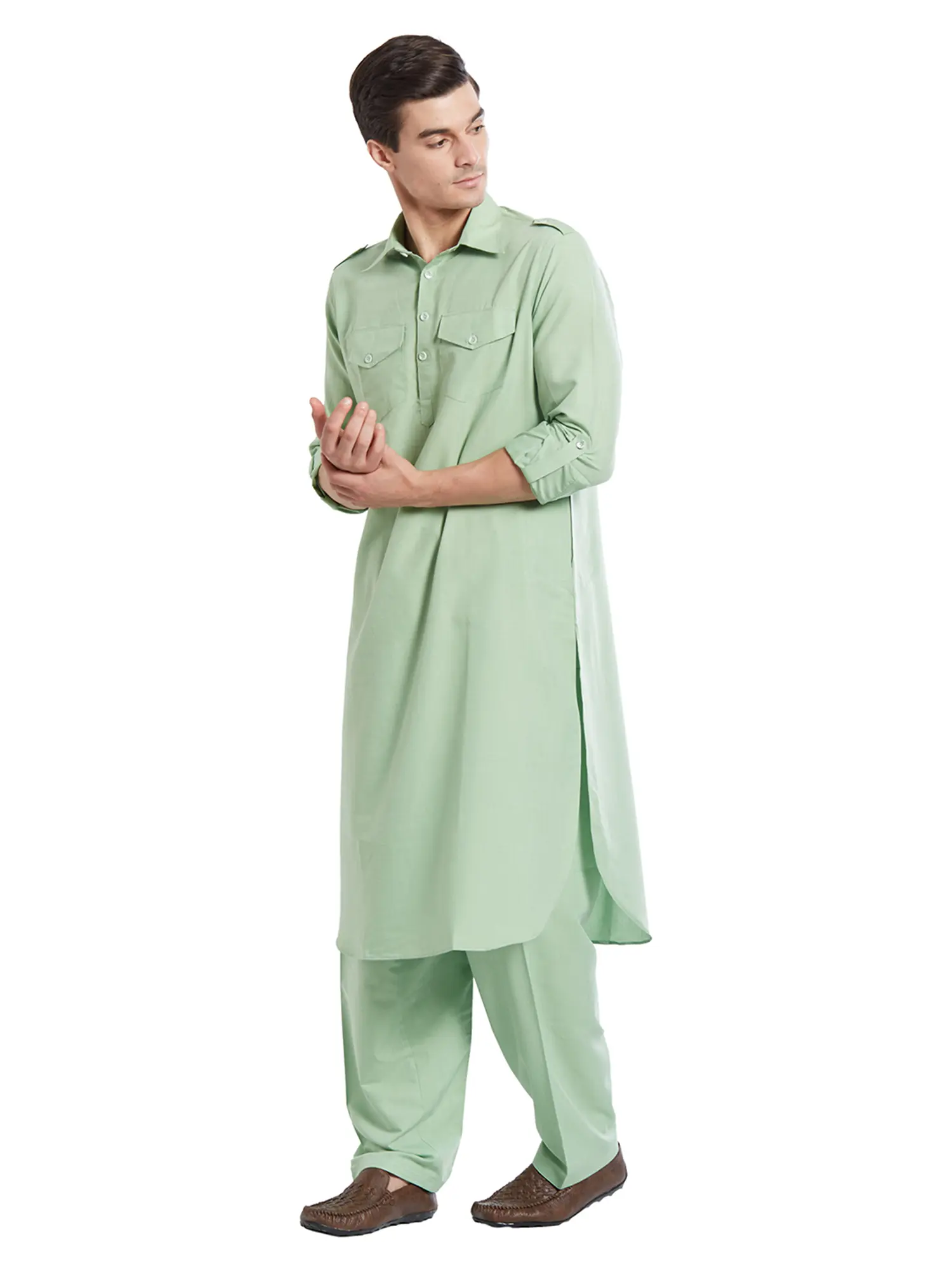 Pastel Plain Pathani Kurta Shalwar Set with Front Pocket