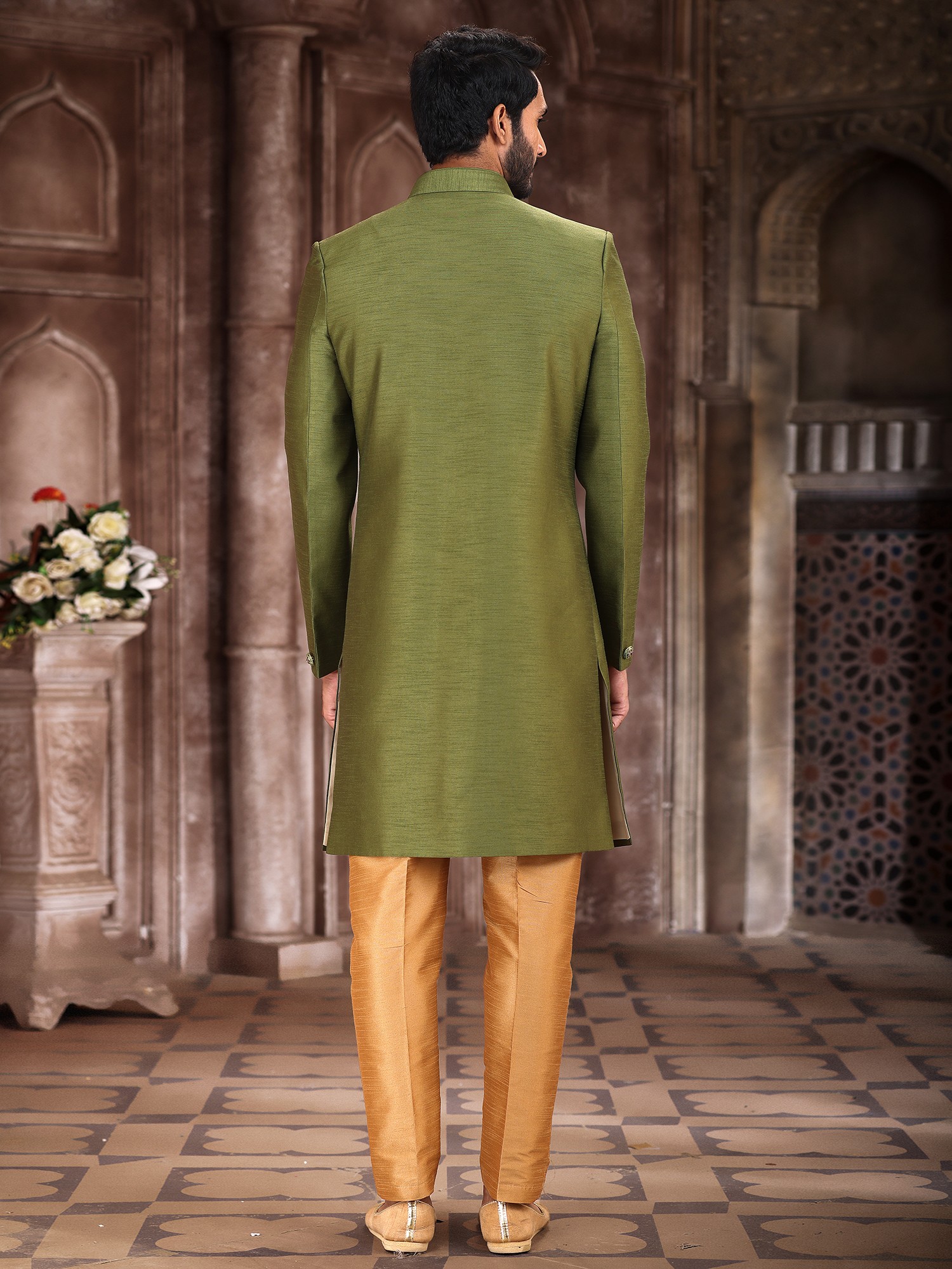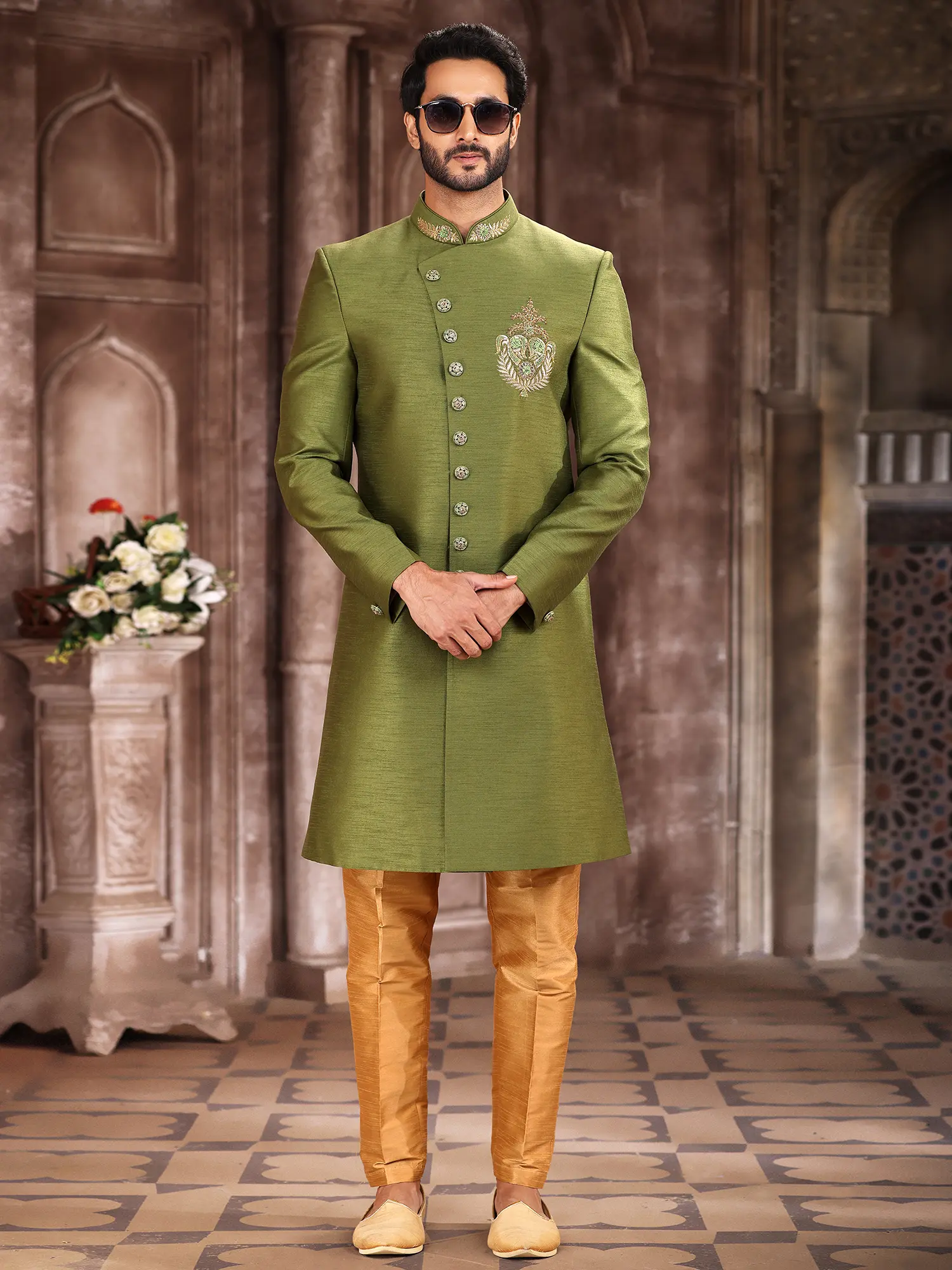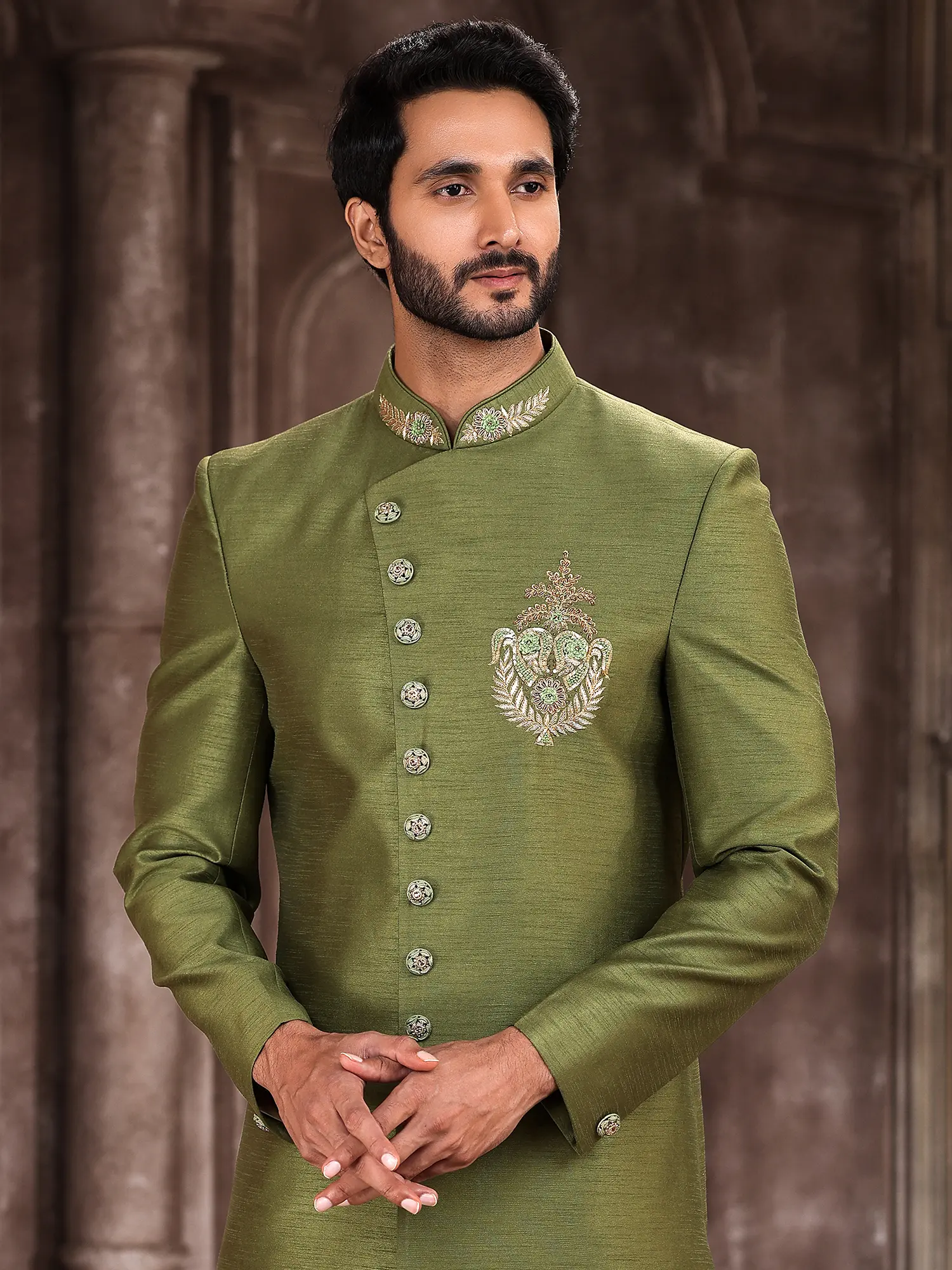 The rich, verdant hue of the art silk sherwani is enhanced by a striking embroidered motif, a masterpiece of delicate threads. Complementing this is the accompanying Aligarhi pant, crafted from a contrasting silk that offers a gentle lustre and sophisticated flow. The subtle detailing on the buttons further elevates the overall aesthetic, creating a harmonious and visually captivating attire.
