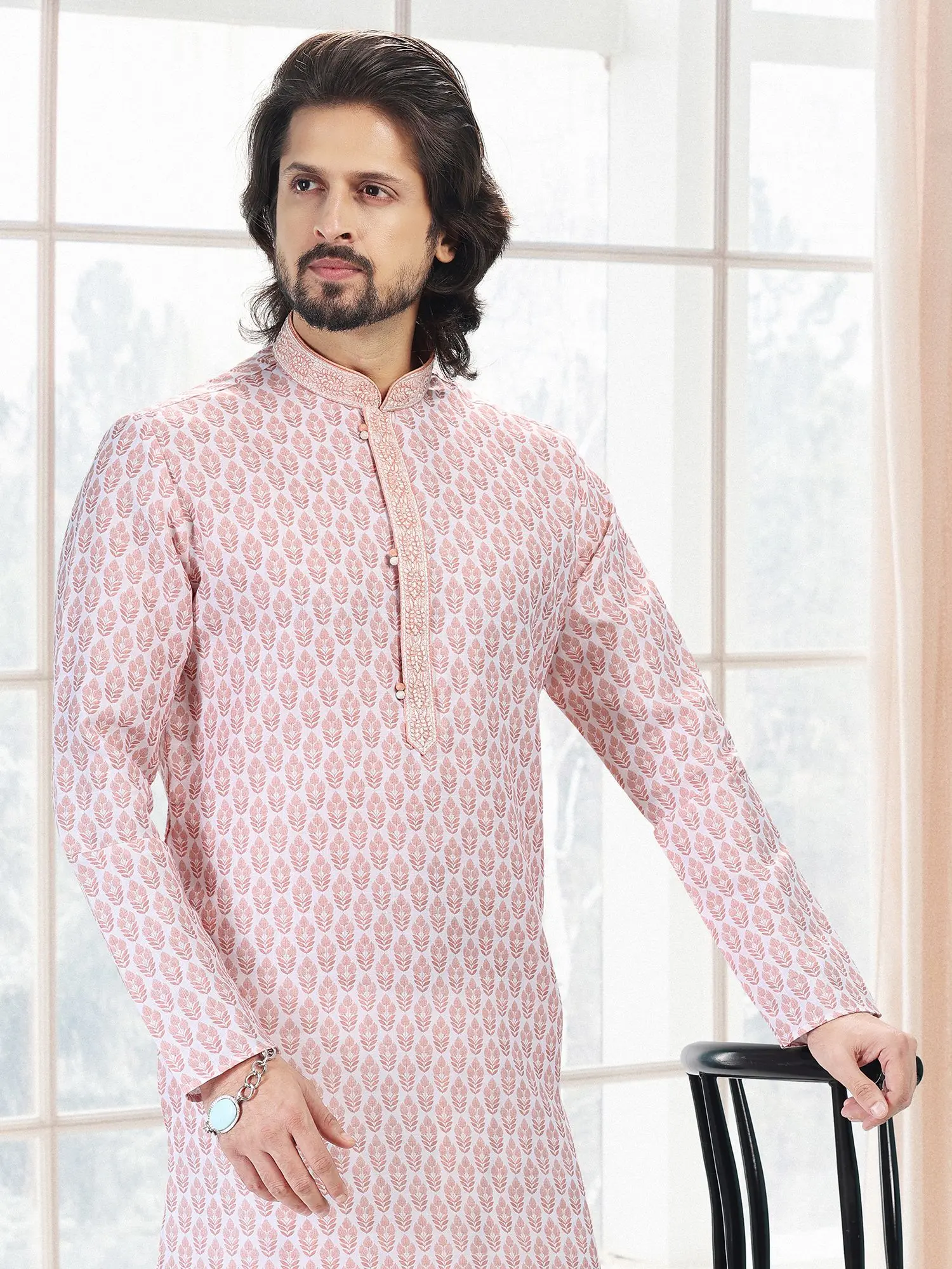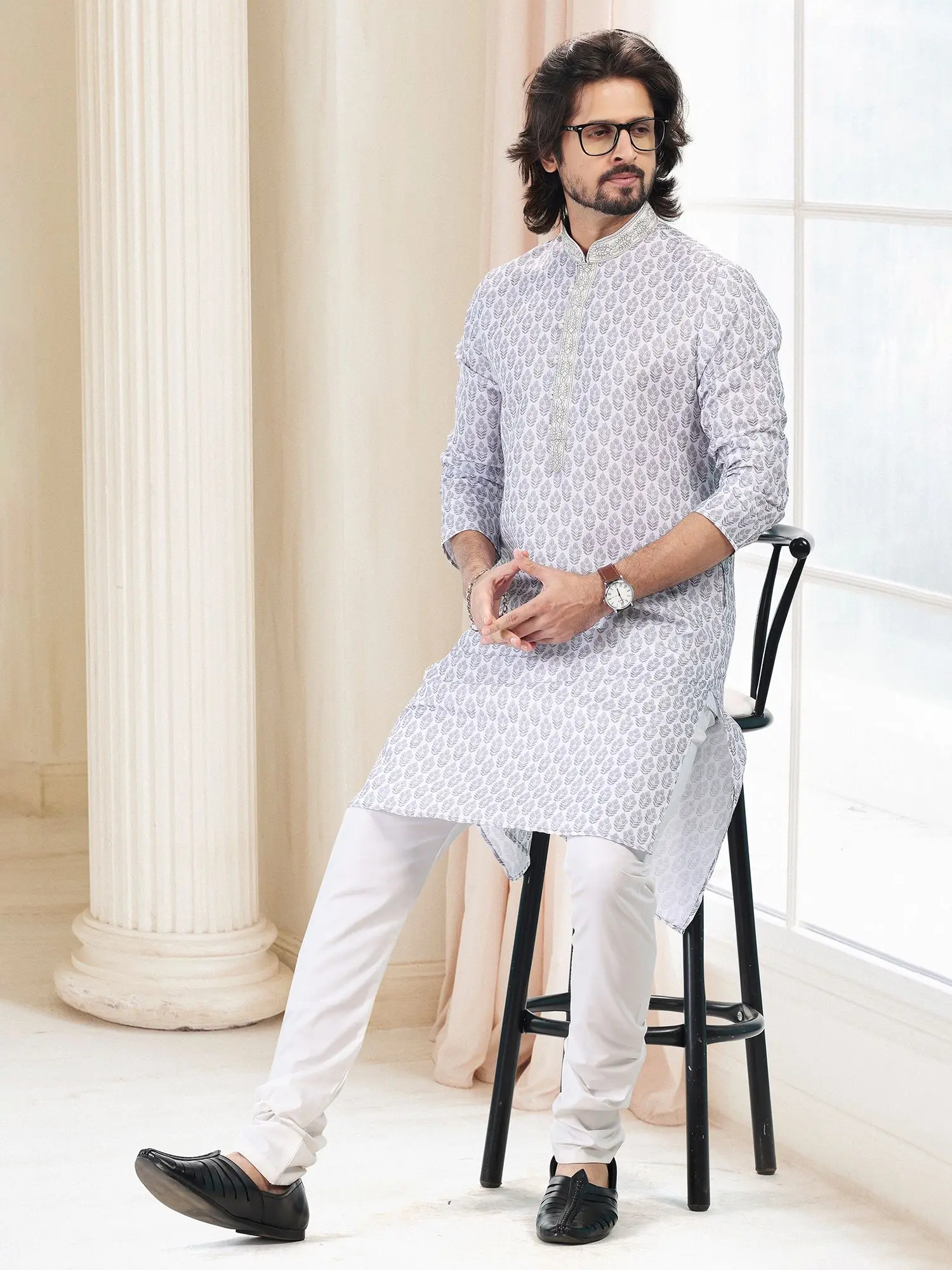 Adorned with a delicate, all-over paisley-inspired print in soothing shades of blue and white, this ensemble offers a visually captivating appeal. The band collar and placket are subtly enhanced with intricate tonal embroidery, adding a touch of understated opulence. This thoughtful detailing ensures you stand out with refined grace.