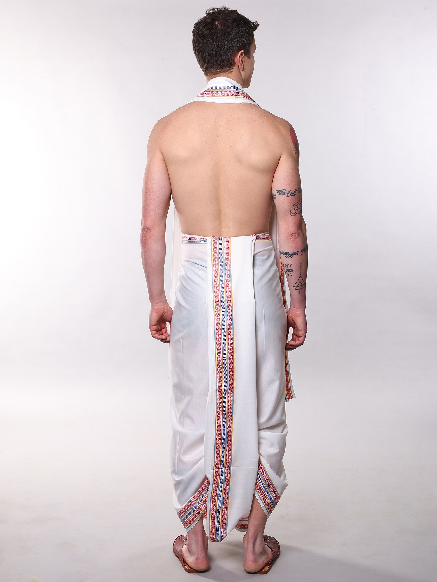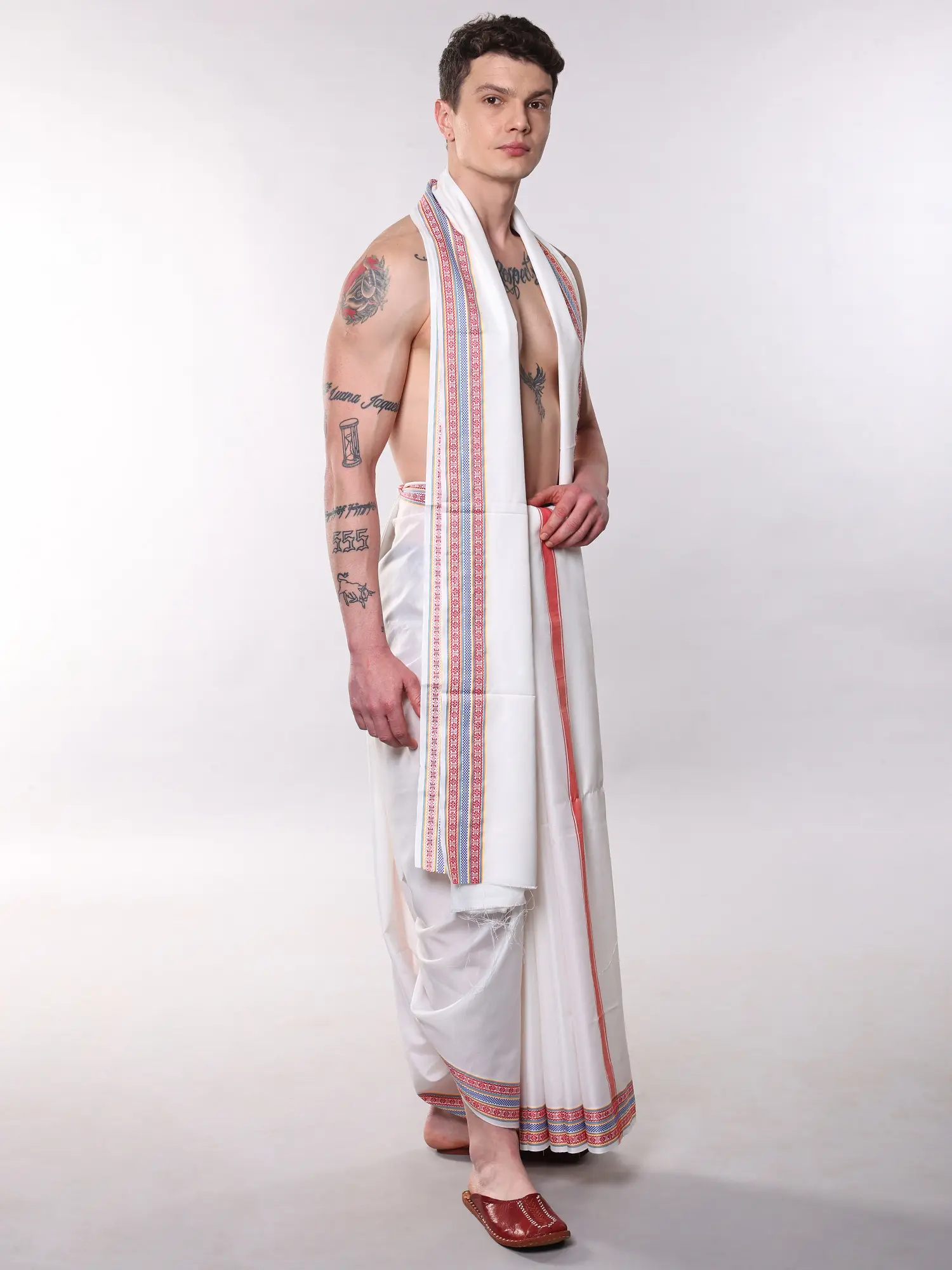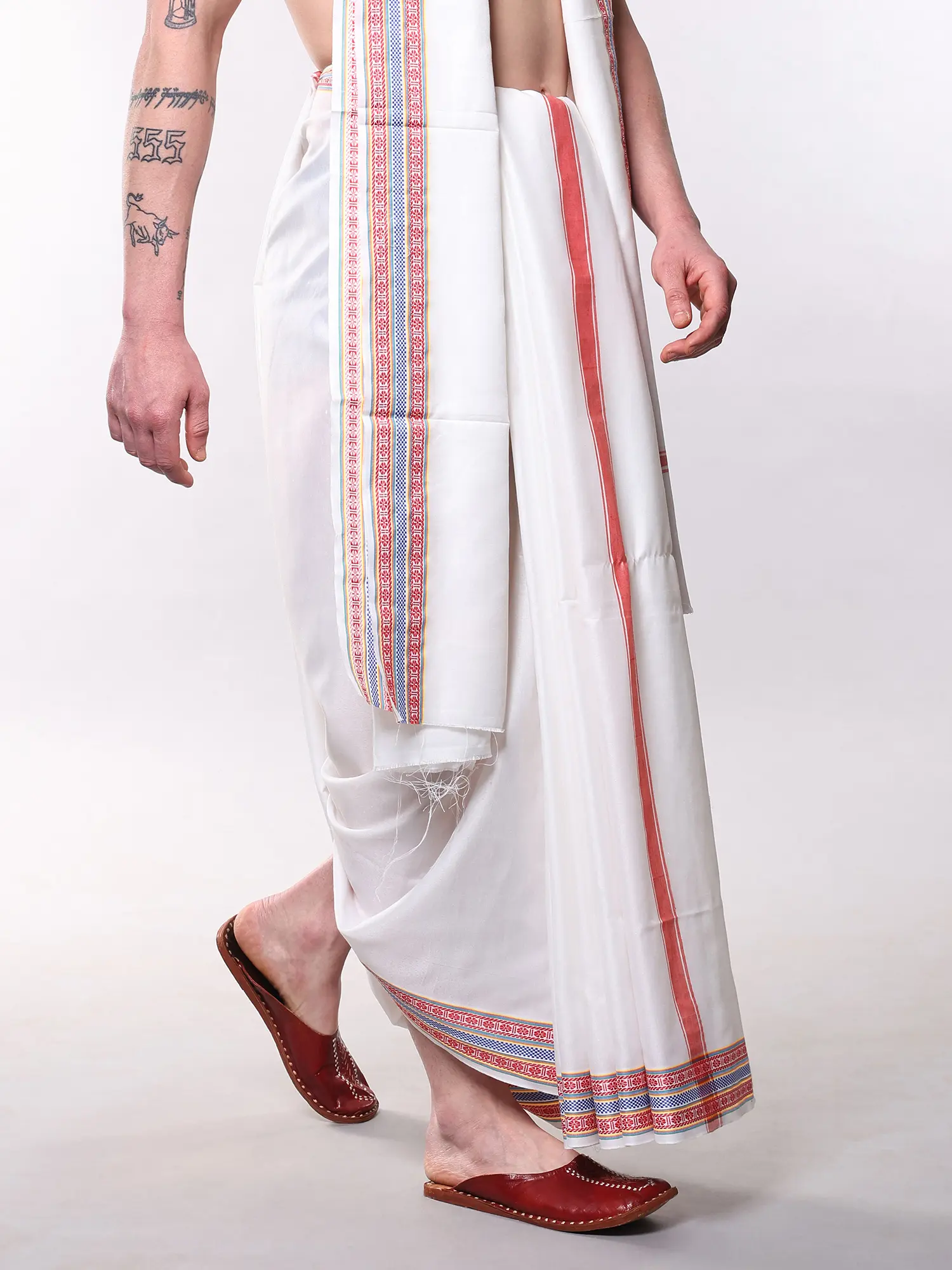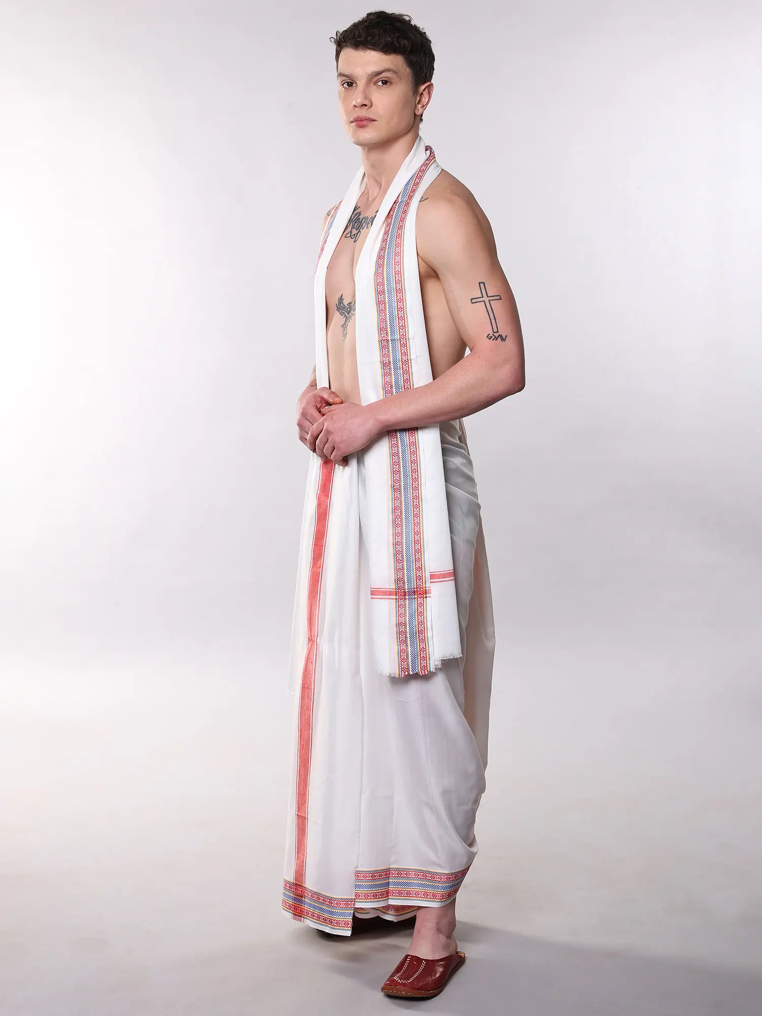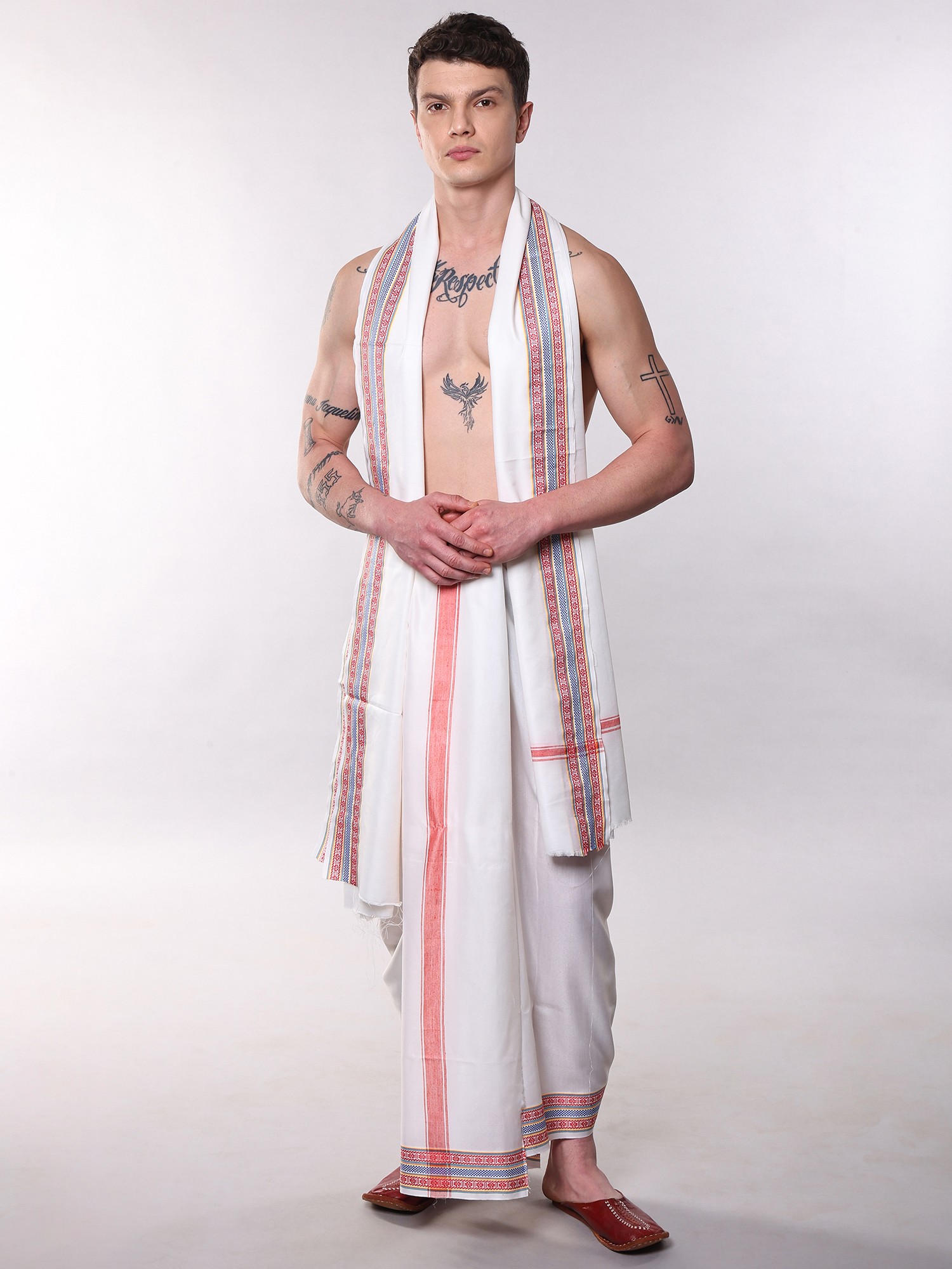 Adorned with striking red and blue striped borders on both the dhoti and stole.