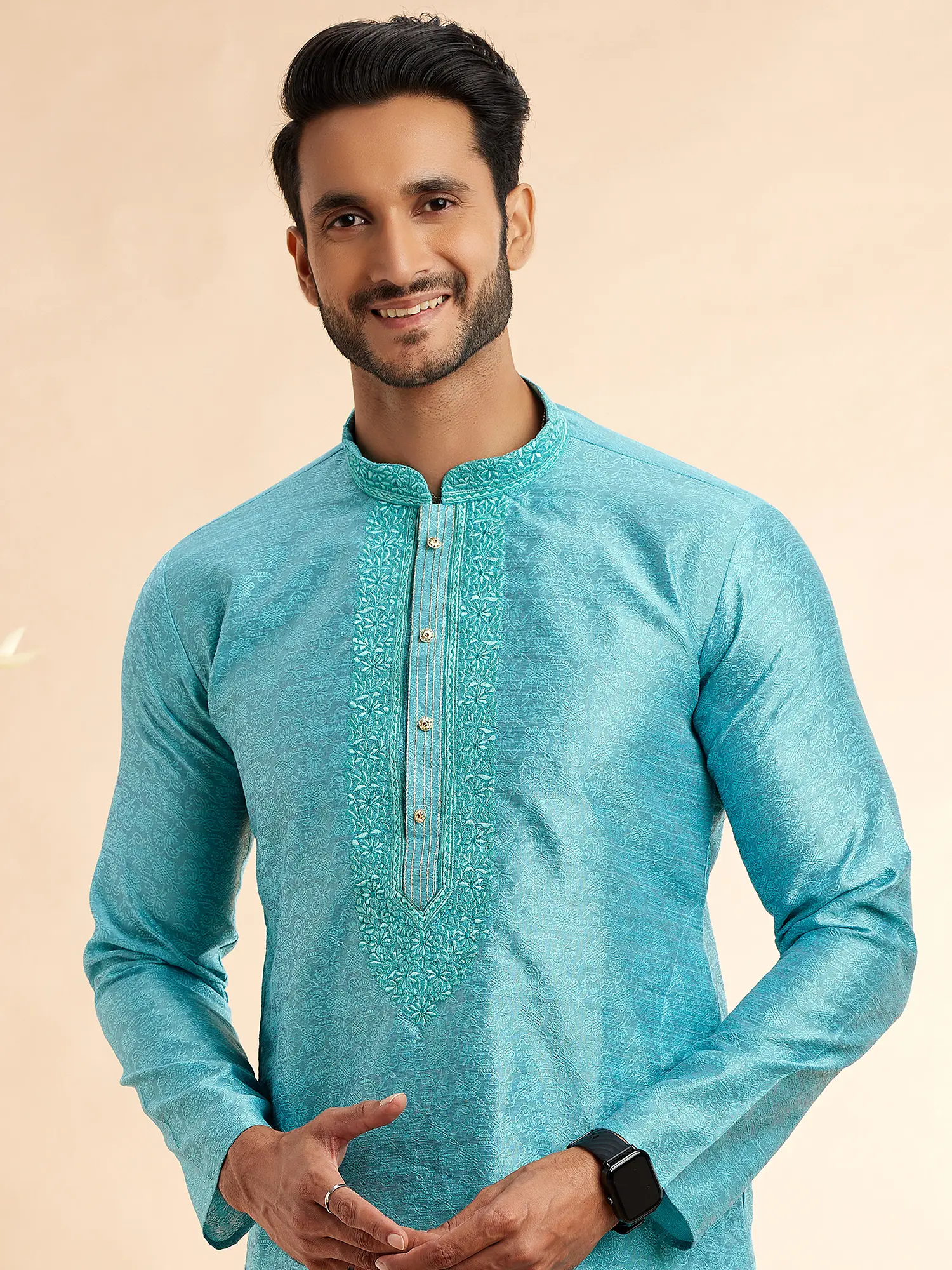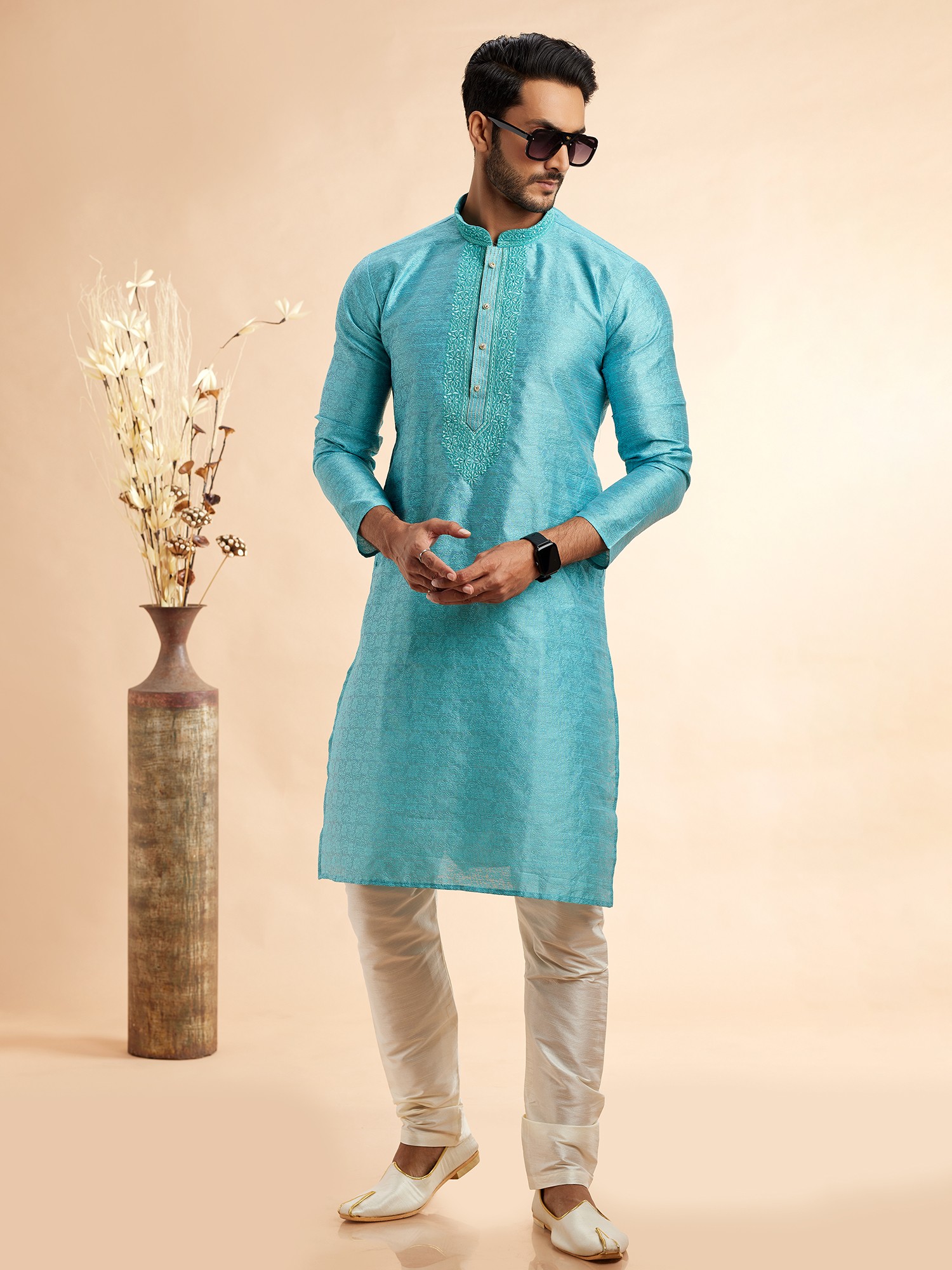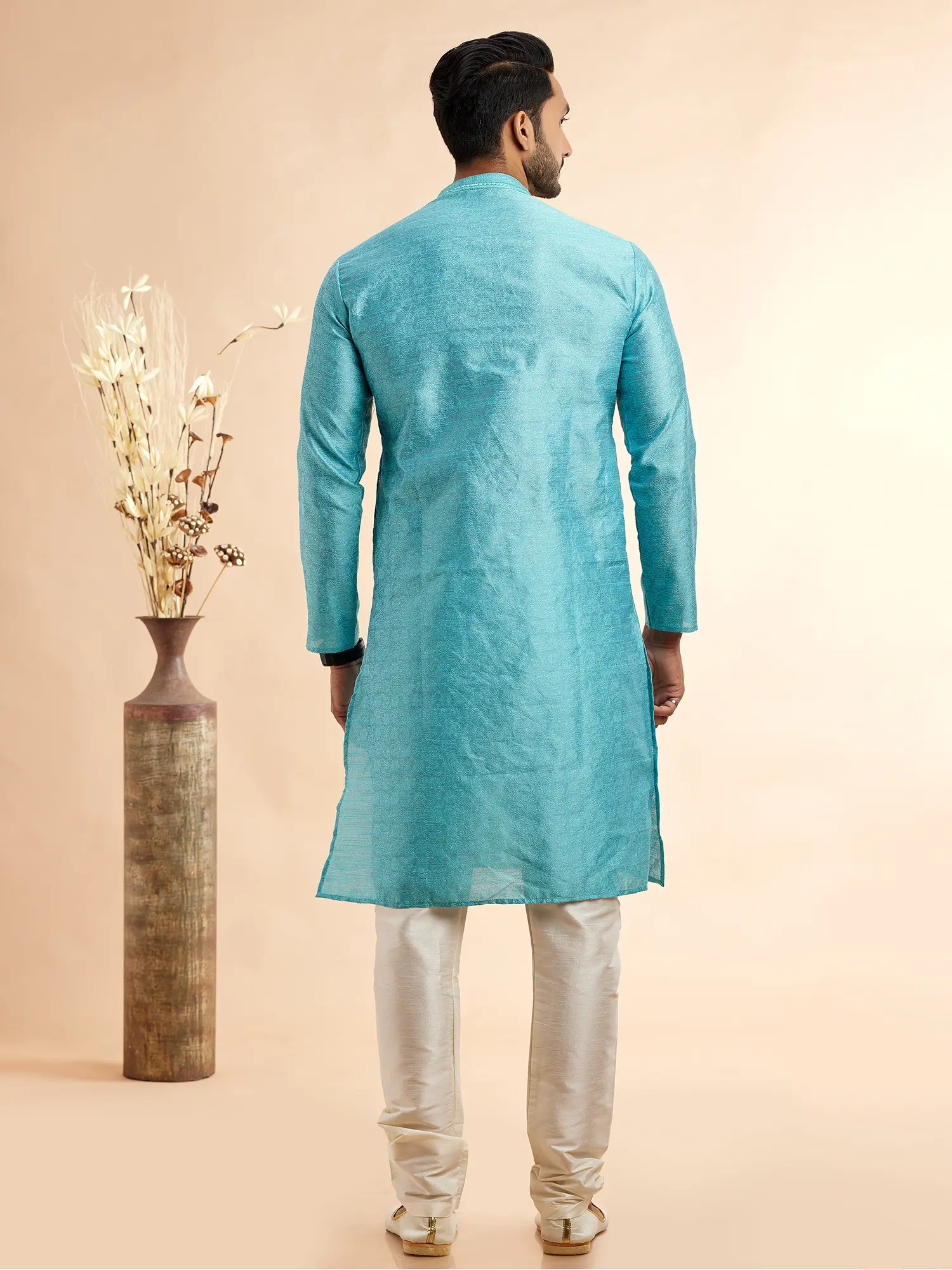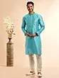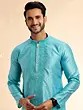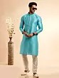 Discover a new level of sophistication with this exquisite kurta pajama set, designed to make a lasting impression. Crafted from premium Jacquard Art Silk, the kurta boasts a subtle yet intricate woven pattern that catches the light beautifully, adding a touch of opulence to its serene turquoise hue. This rich fabric not only drapes elegantly but also offers a luxurious feel against the skin, ensuring comfort without compromising on style. The timeless silhouette of the kurta is enhanced by a finely detailed machine embroidery adorning the collar and placket, featuring delicate patterns in a complementary shade. This meticulous craftsmanship speaks volumes of its quality and attention to detail.
