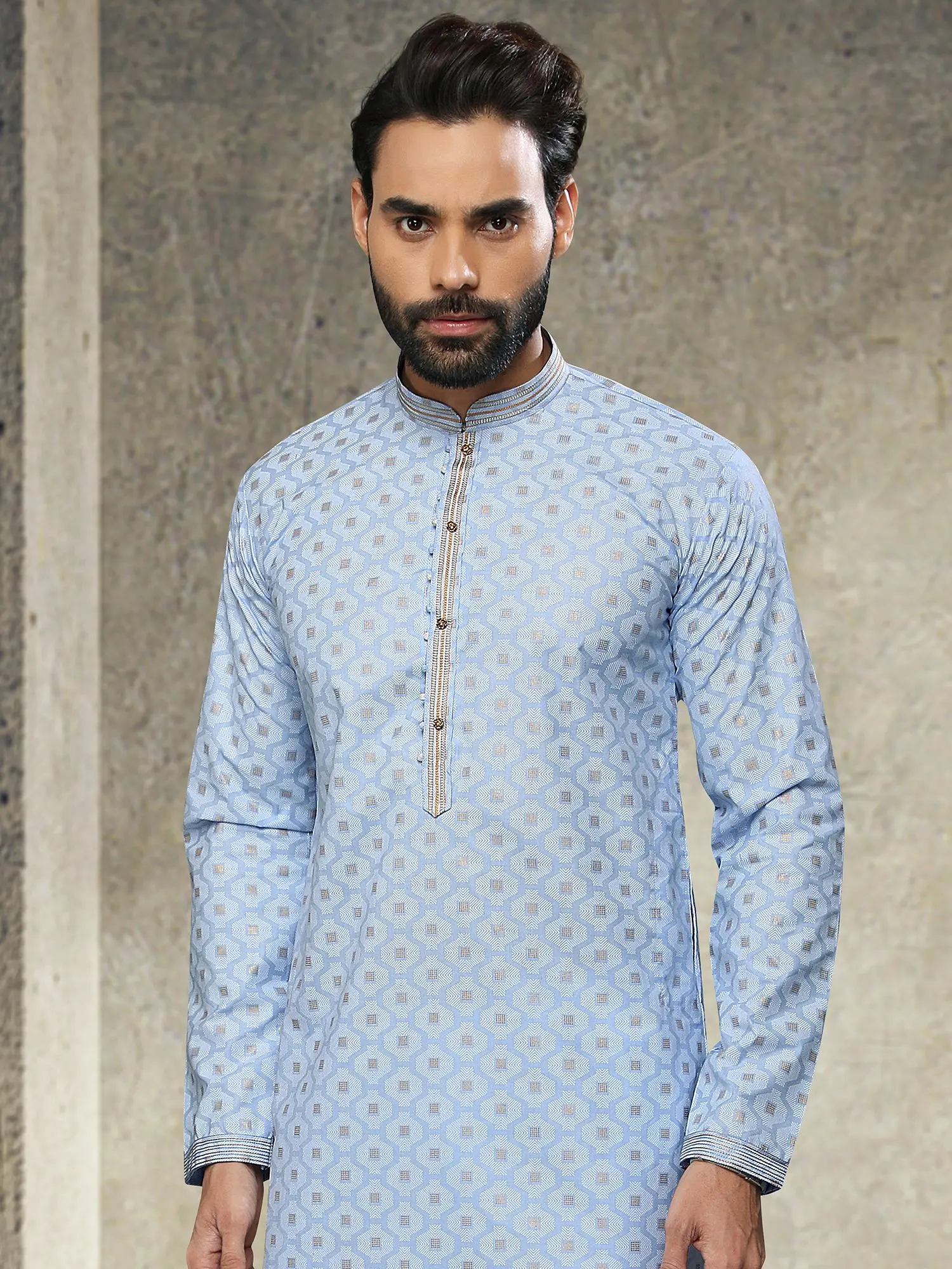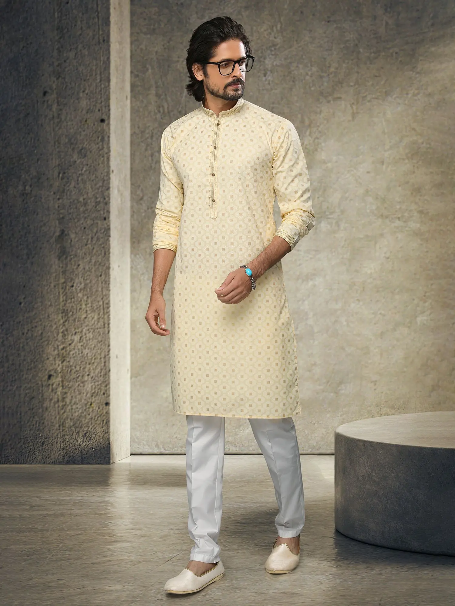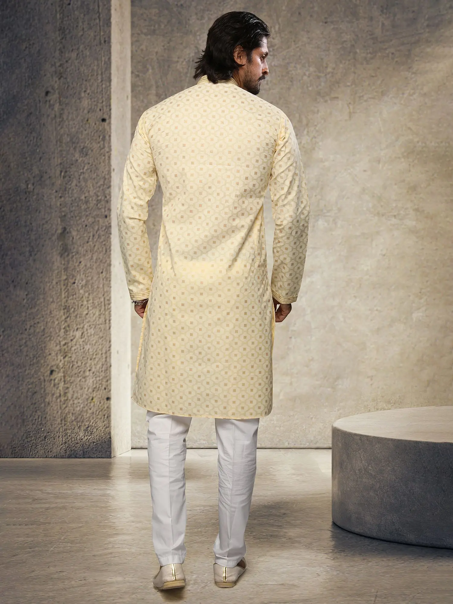 Adorned with a delicate, all-over geometric print, the kurta captivates with its intricate pattern. The soft, creamy hue provides a versatile canvas, enhanced by subtle golden accents that glint with every movement. The mandarin collar and the line of ornate buttons running down the placket offer refined detailing, while the contrasting cuffs add a touch of sophisticated flair.