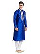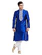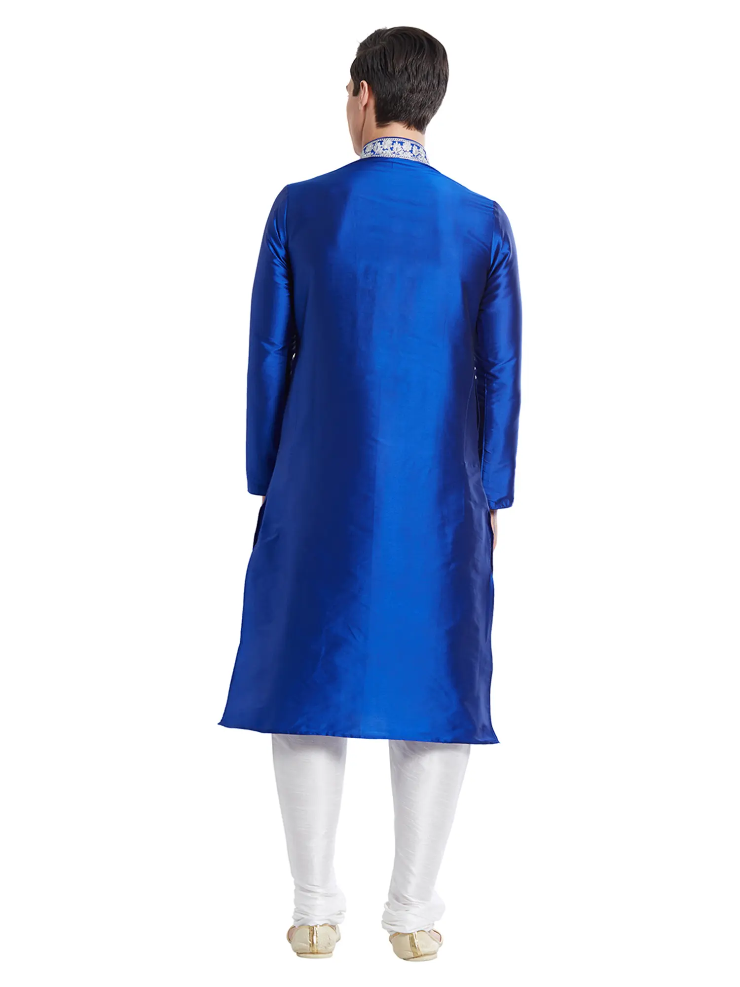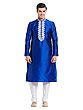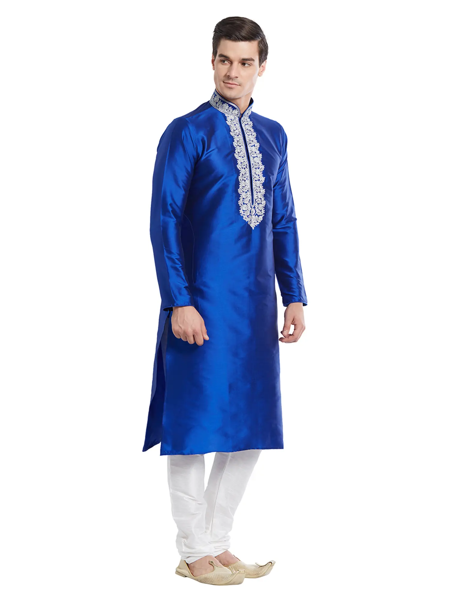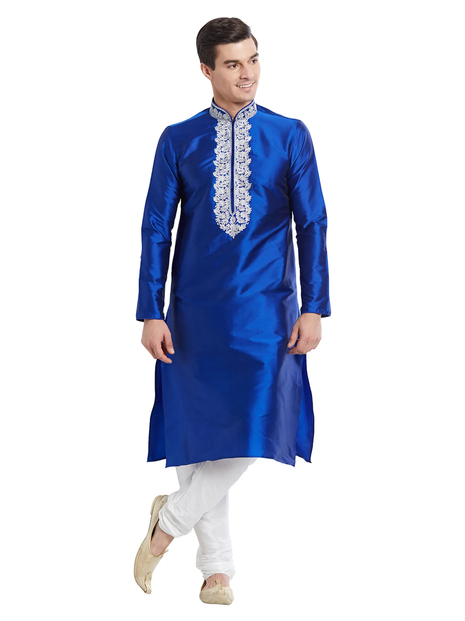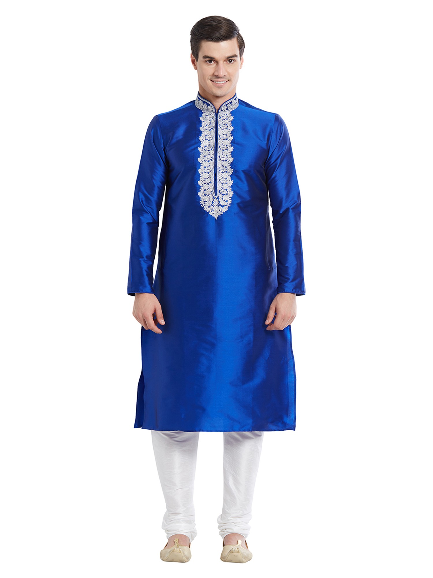 Features a striking royal blue art silk kurta adorned with detailed white embroidery on the neckline.