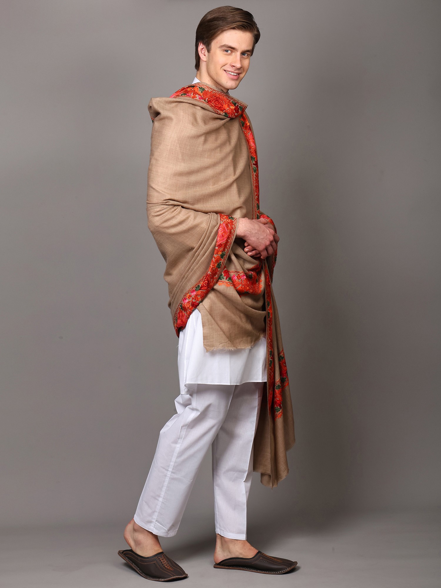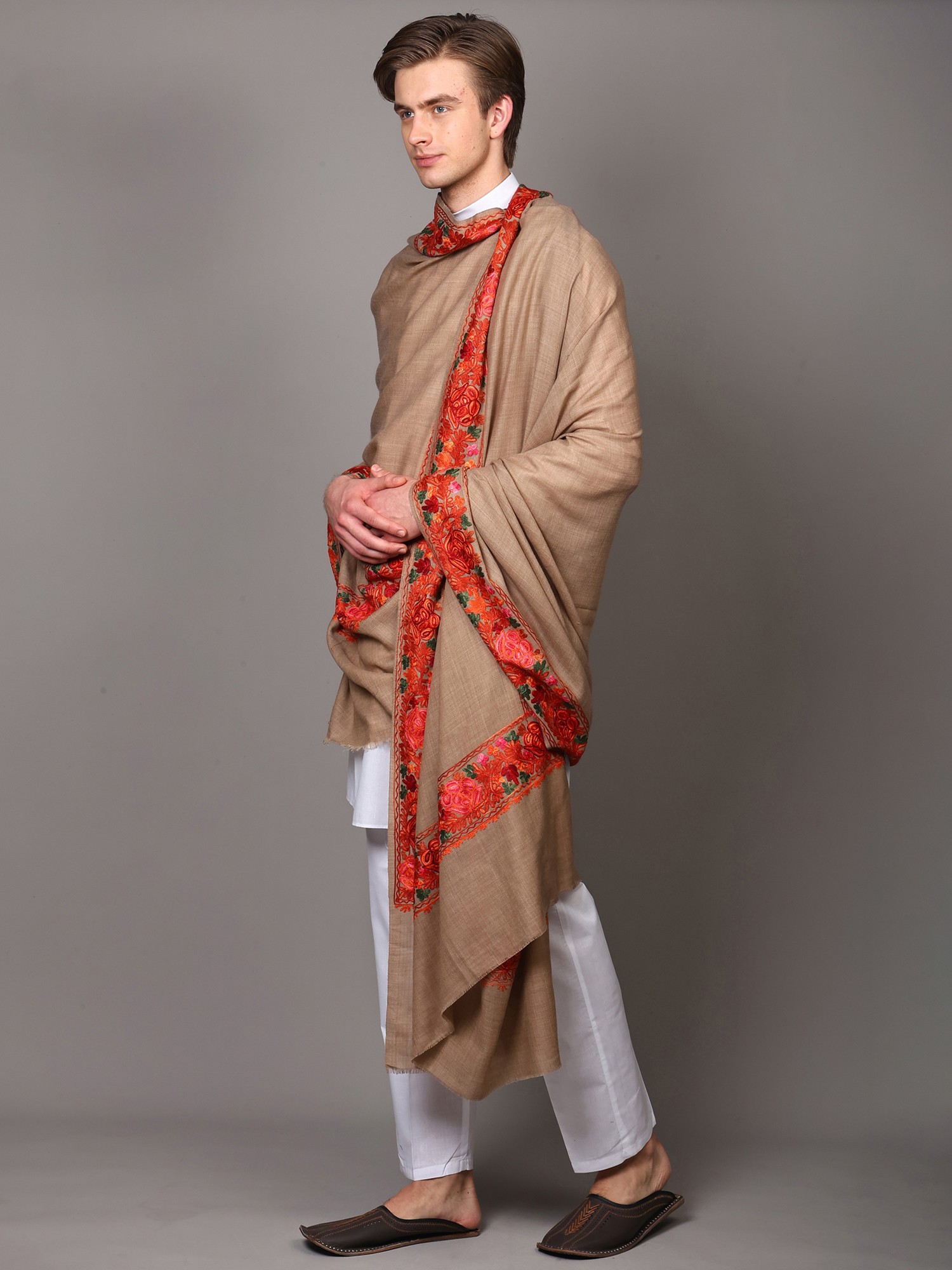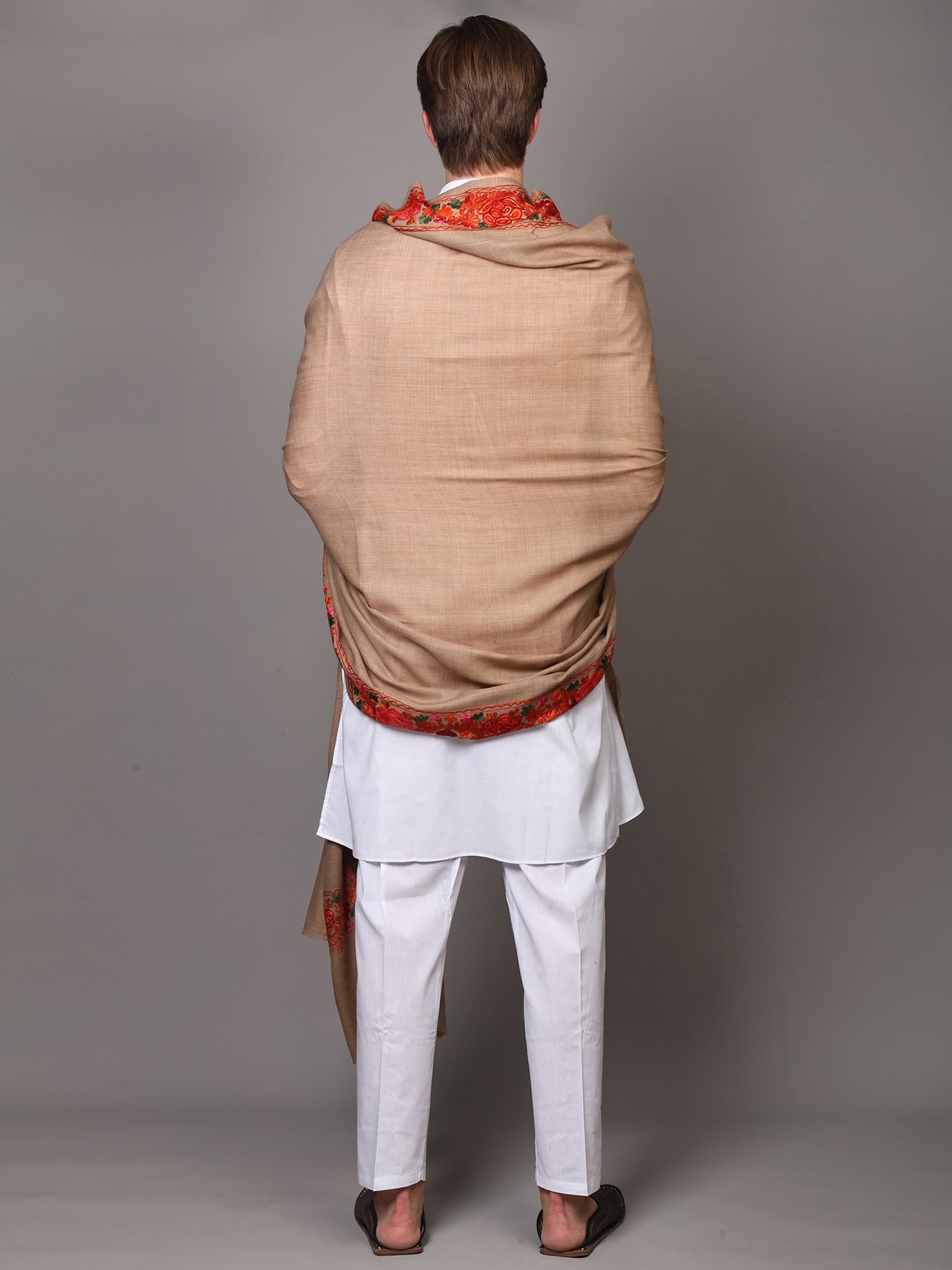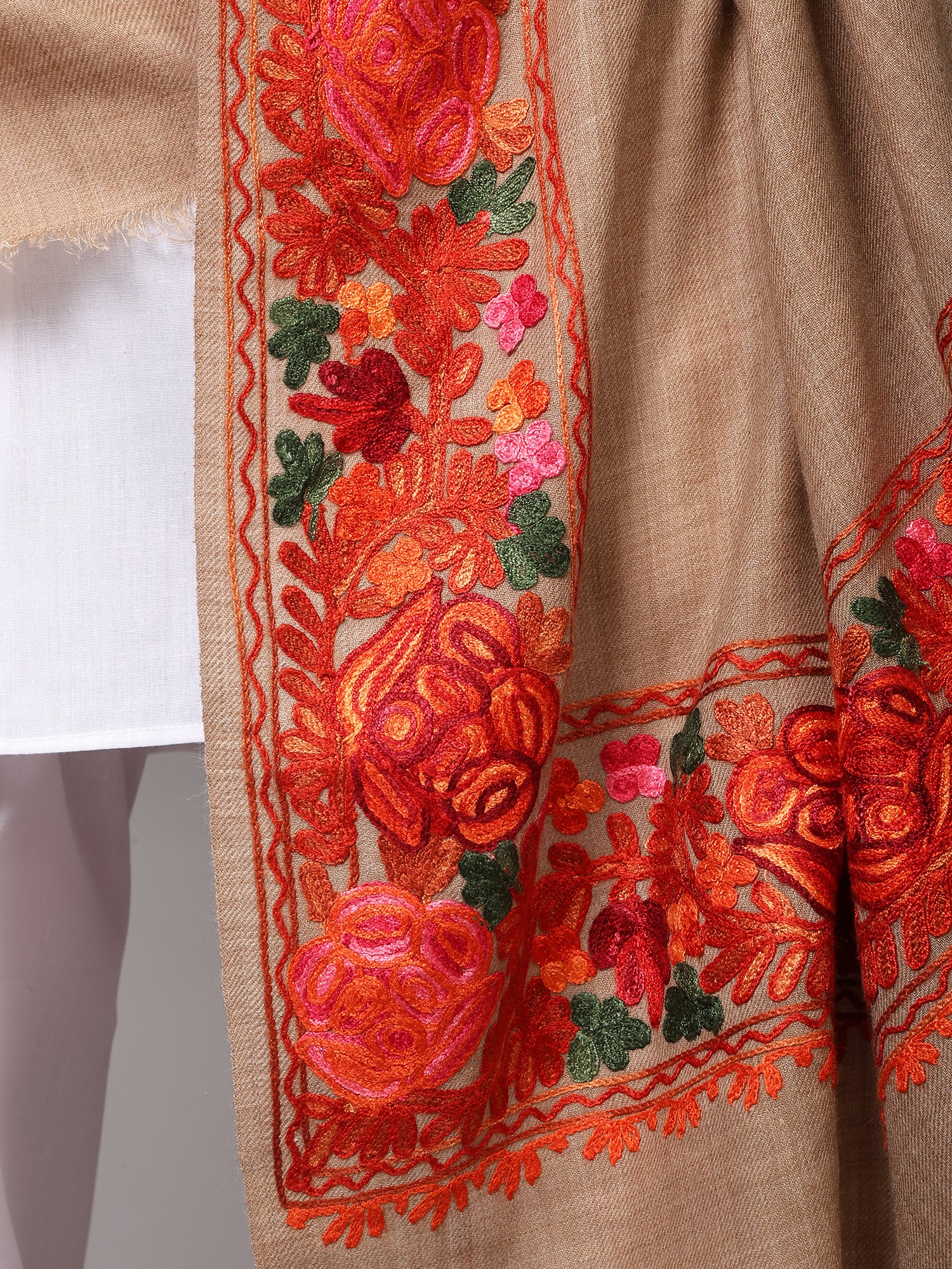 Snow-White Woolen Multicolored Floral Fine Aari Embroidered Shawl from Kashmir