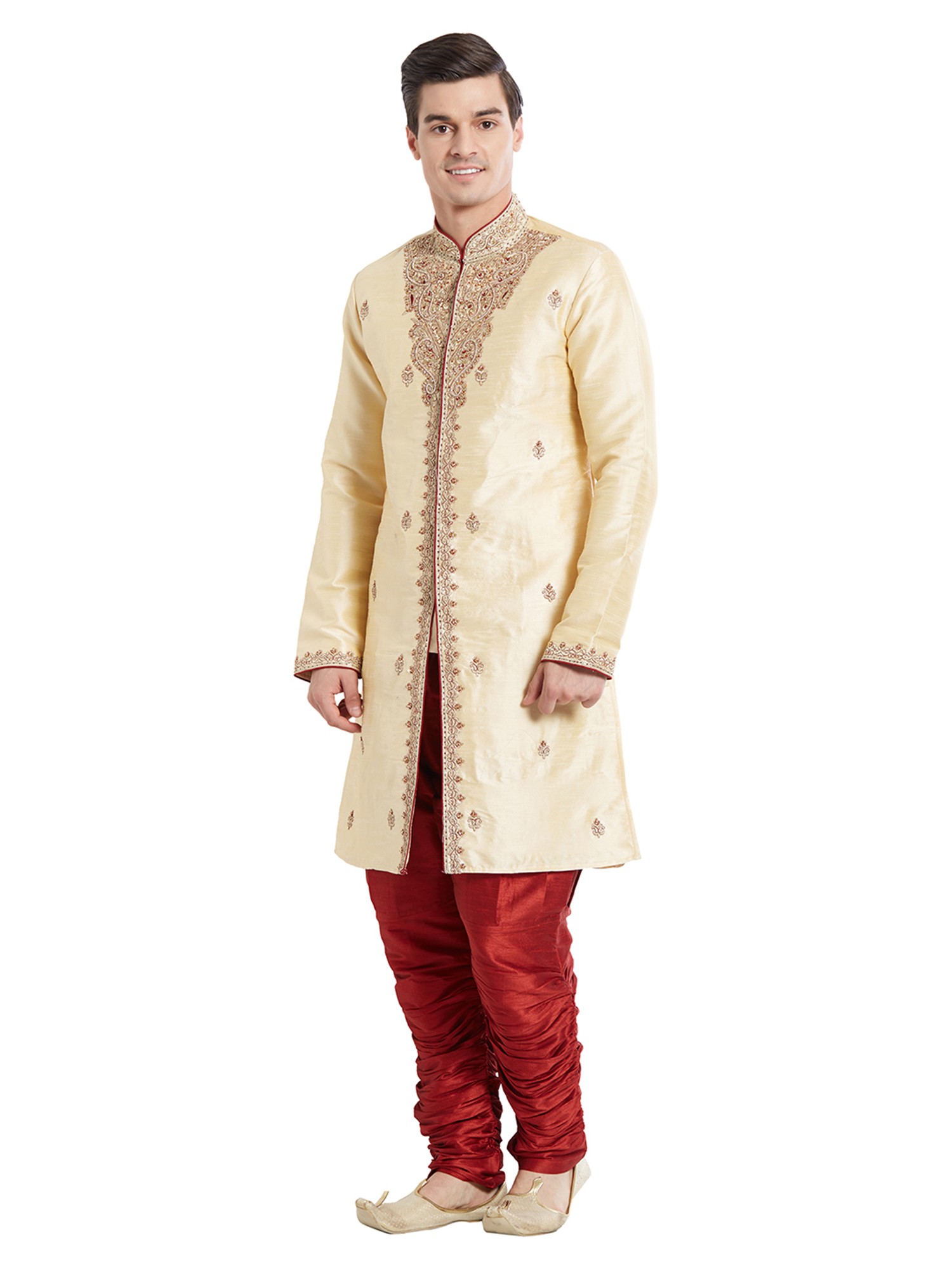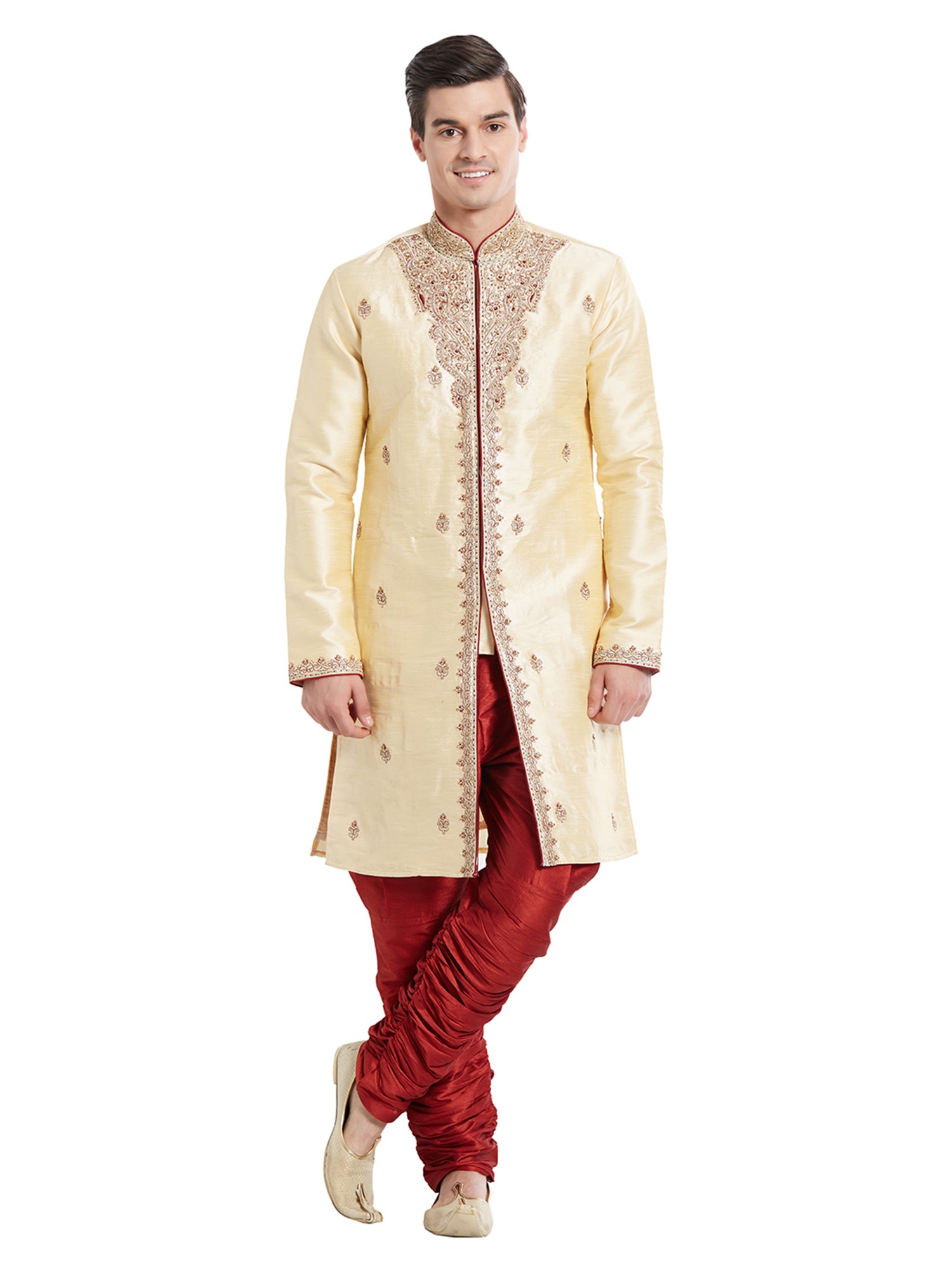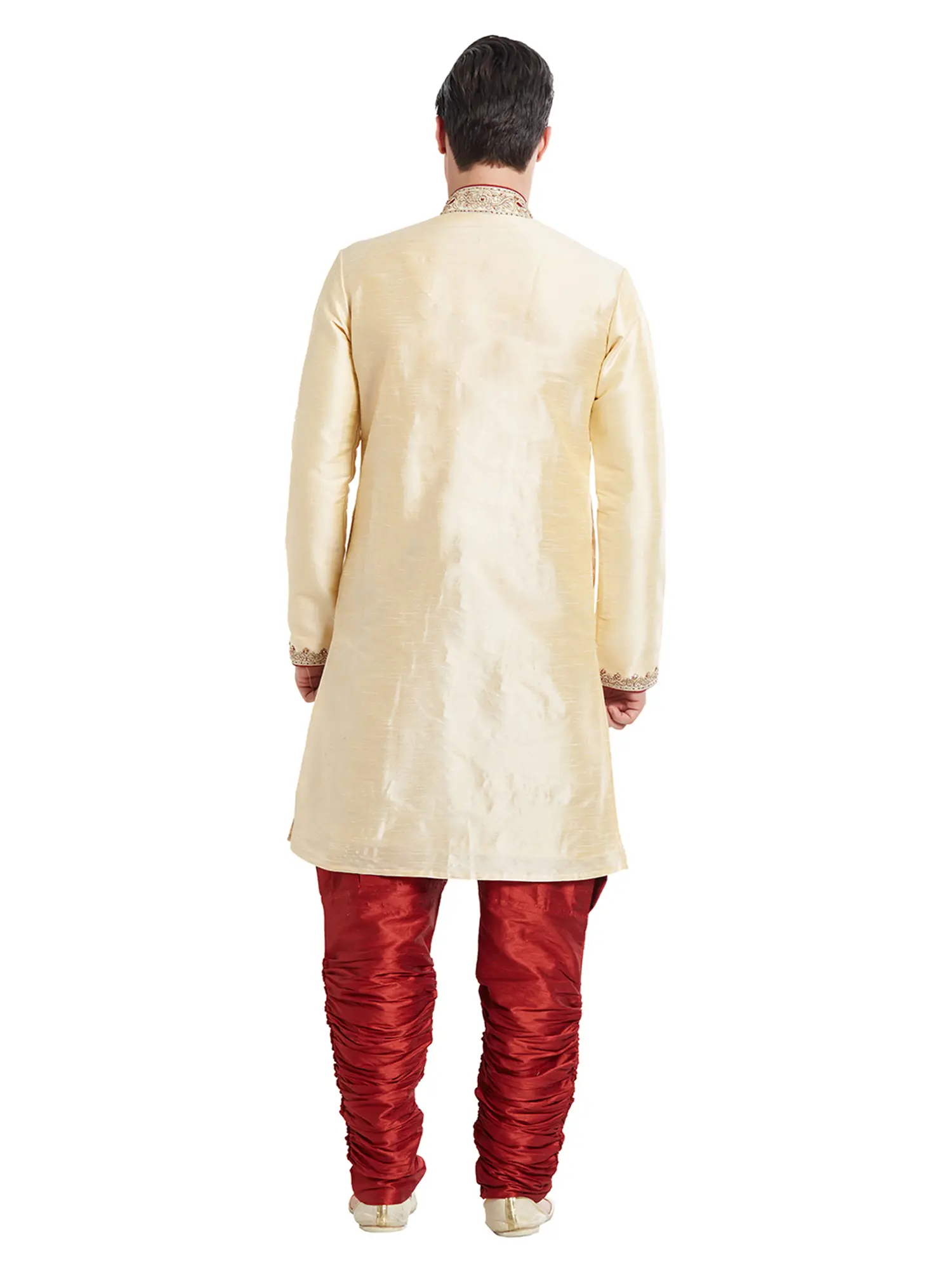 The luminous sheen of the silk provides a perfect canvas for the rich, detailed embroidery that adorns the neckline and placket. Delicate motifs are thoughtfully placed throughout, catching the light and drawing the eye with subtle elegance. The rich contrast of the deep red trousers, with their characteristic pleating, complements the cream-colored sherwani, creating a striking and harmonious visual.