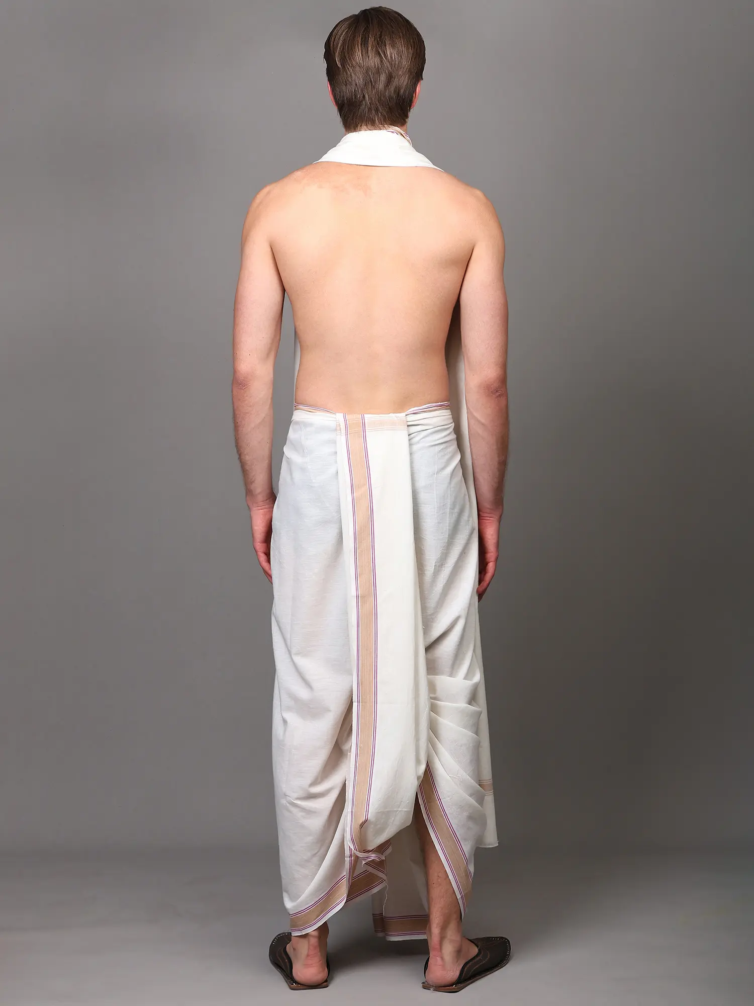 This set is more than just clothing; it's an experience. Whether you are attending religious ceremonies, cultural gatherings, festivals, or simply seeking to infuse your daily wardrobe with a touch of traditional charm, this dhoti and angavastram set is a perfect fit. The pure cotton fabric ensures it remains cool and comfortable even in warmer climates, making it a practical choice for any event. The neutral white of the dhoti and angavastram serves as a blank canvas, easily adaptable to different styling preferences and occasions. The gentle stripes provide a subtle yet distinctive accent that can be admired from afar and appreciated up close.