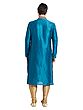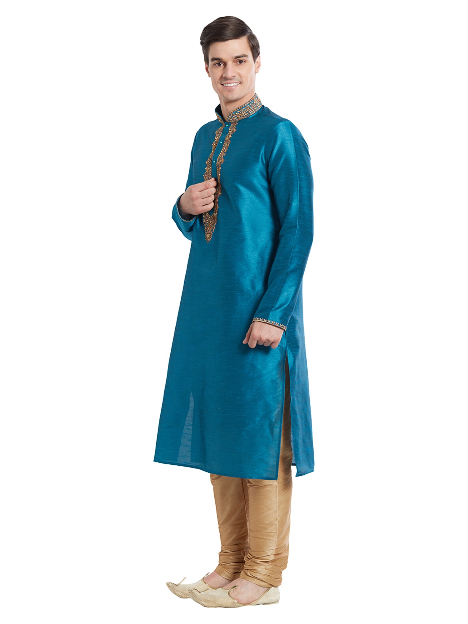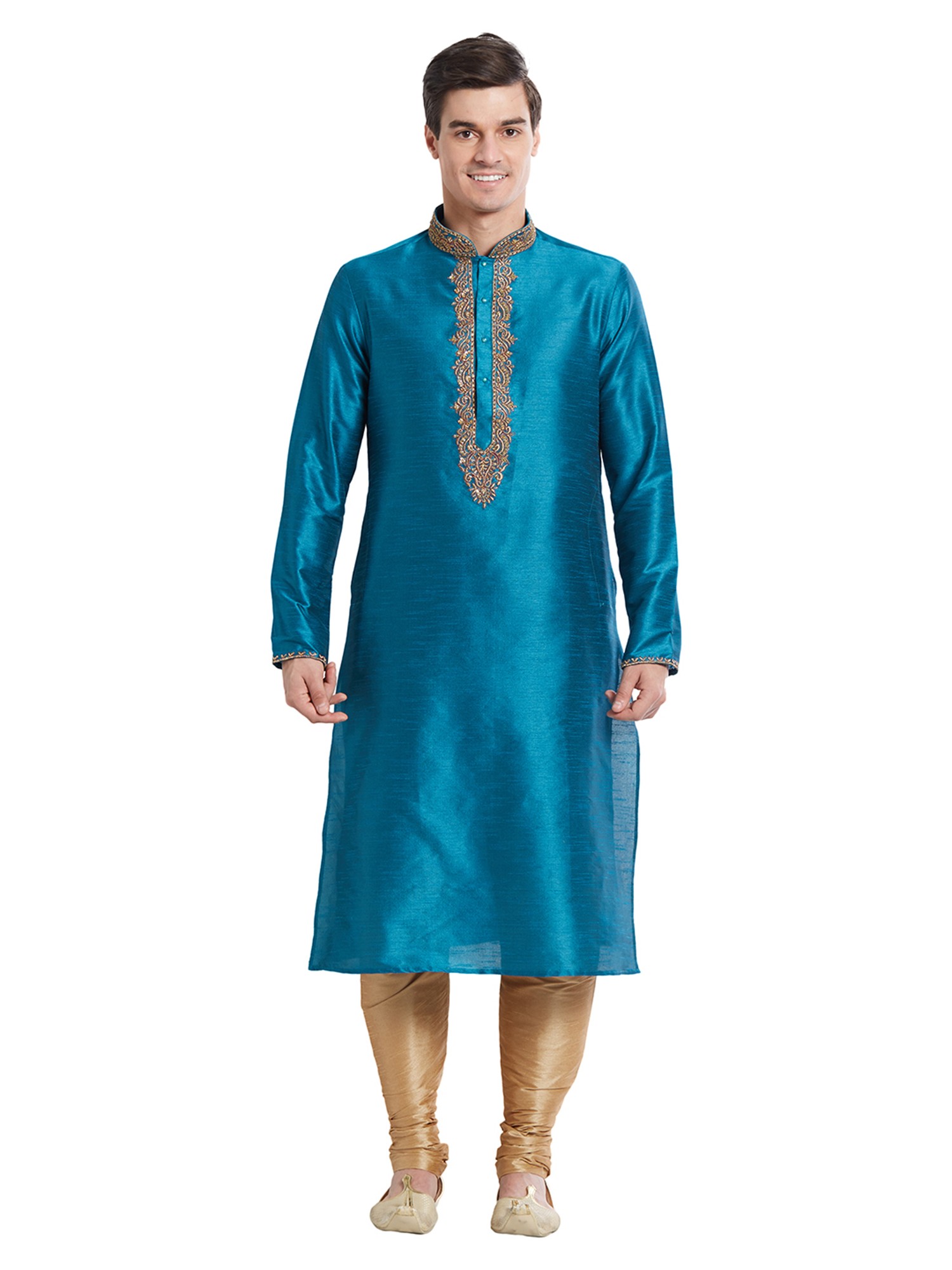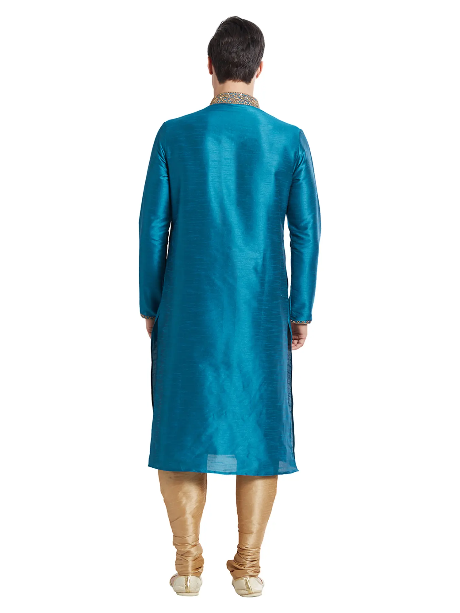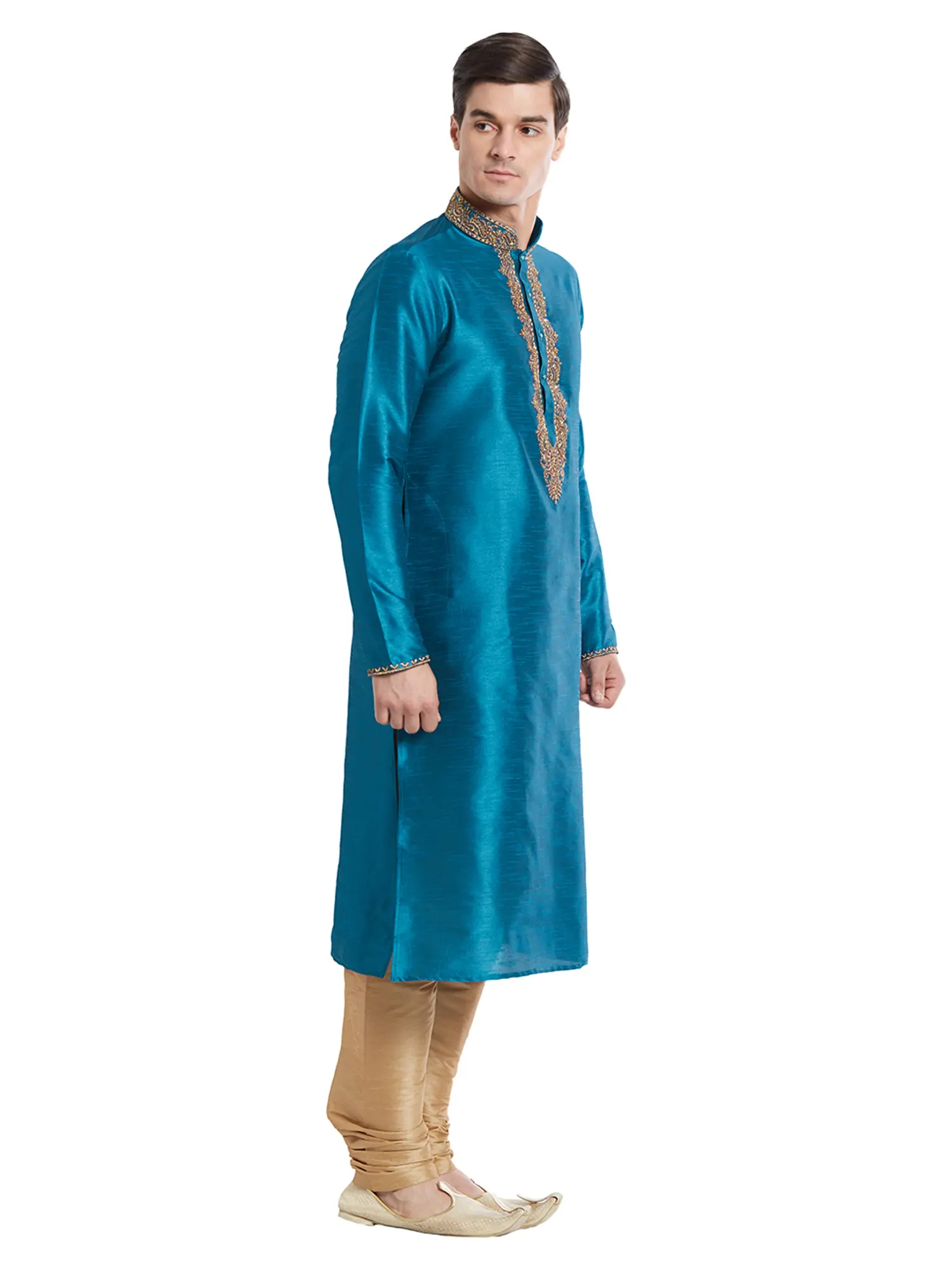 The striking teal hue of the kurta is further enhanced by intricate, hand-finished embroidery that adorns the neckline and cuffs. This delicate detailing adds a regal flourish, drawing the eye with its golden threads and ornate patterns. The complementary churidar, in a shimmering golden fabric, provides a perfectly balanced silhouette that is both comfortable and classically elegant.