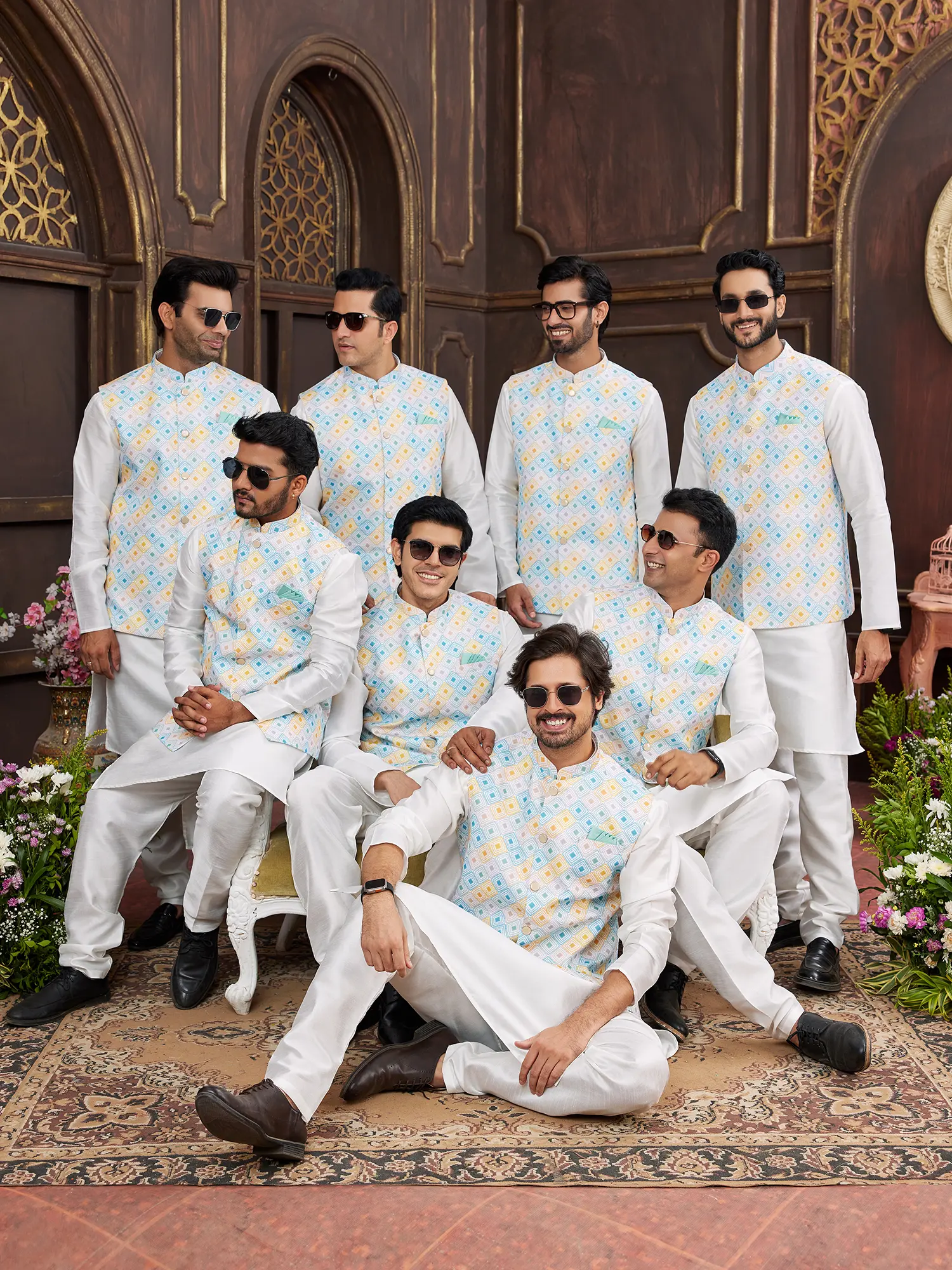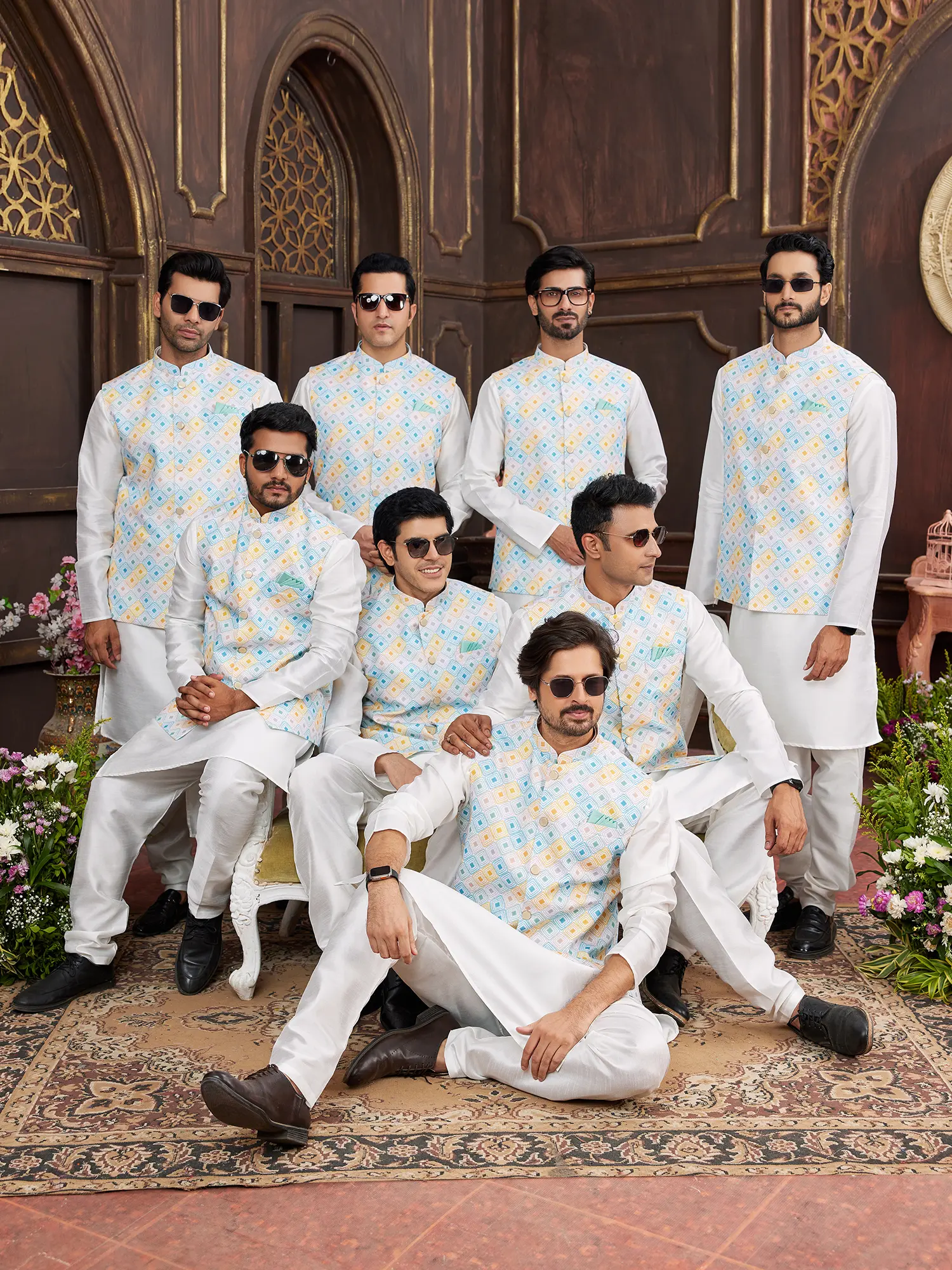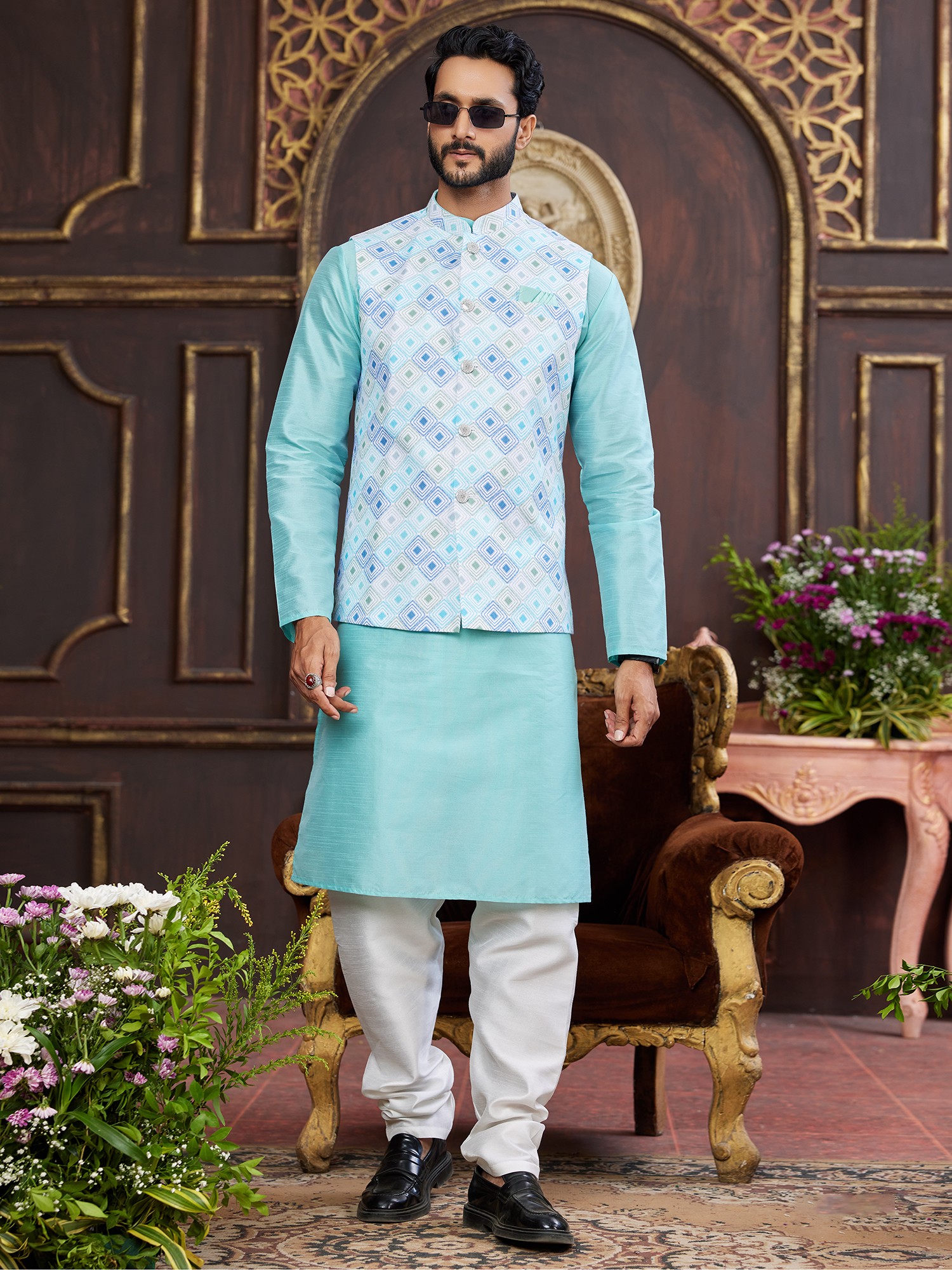 The set is meticulously crafted to create a harmonious and impactful appearance. The crisp white pajama, cut for a relaxed yet tailored fit, provides a stylish contrast to the kurta and waistcoat. This ensemble offers a sophisticated take on traditional attire, perfect for the modern gentleman with an appreciation for classic design. Complete the look with traditional footwear to create a complete and fashionable statement.