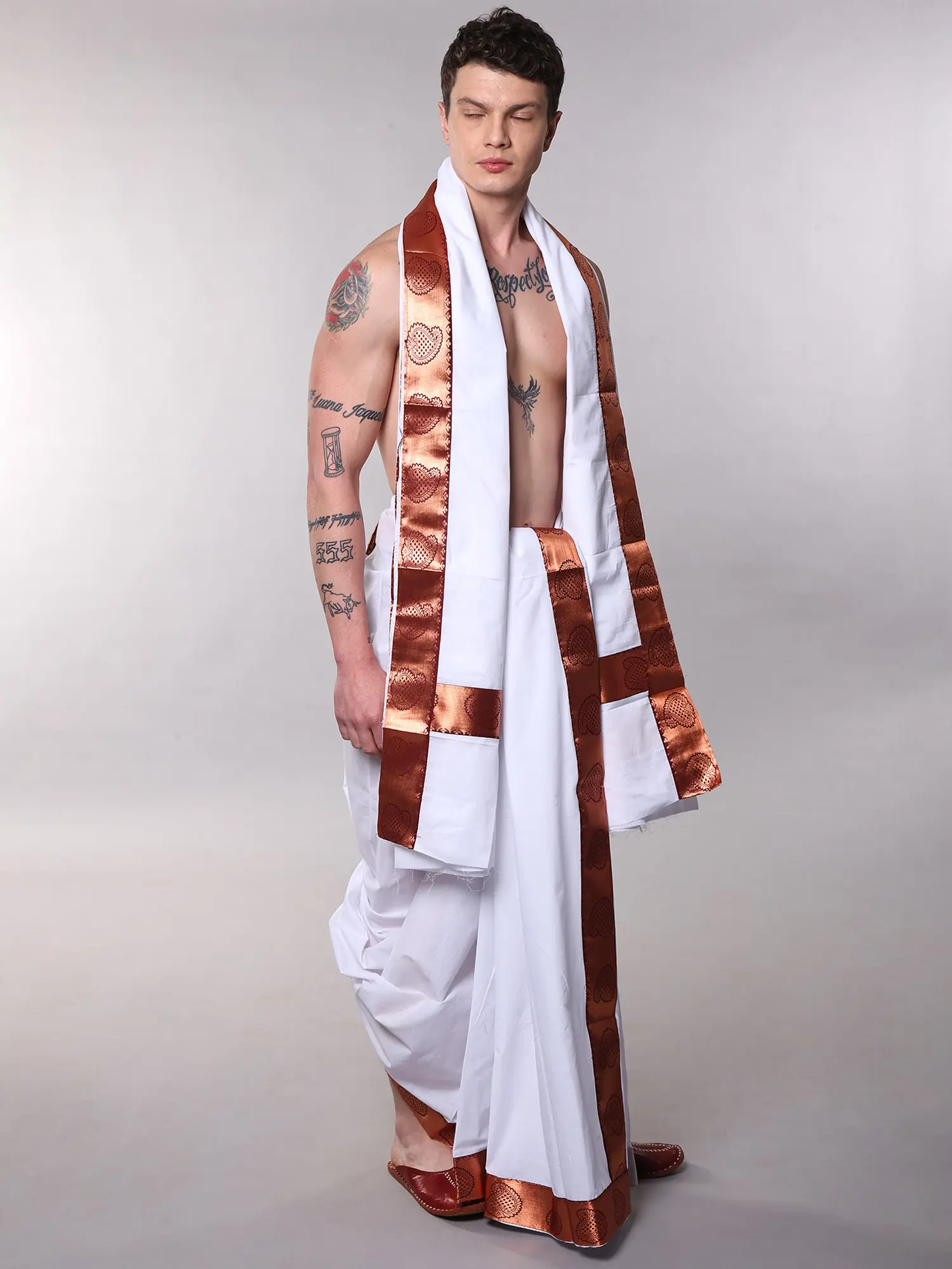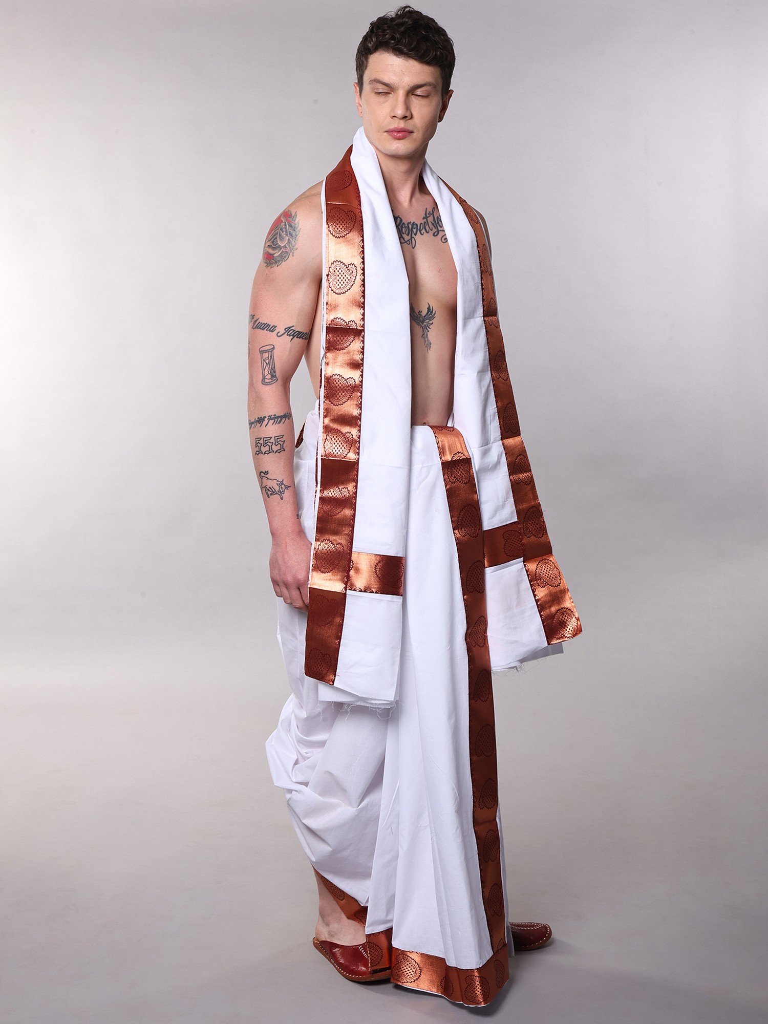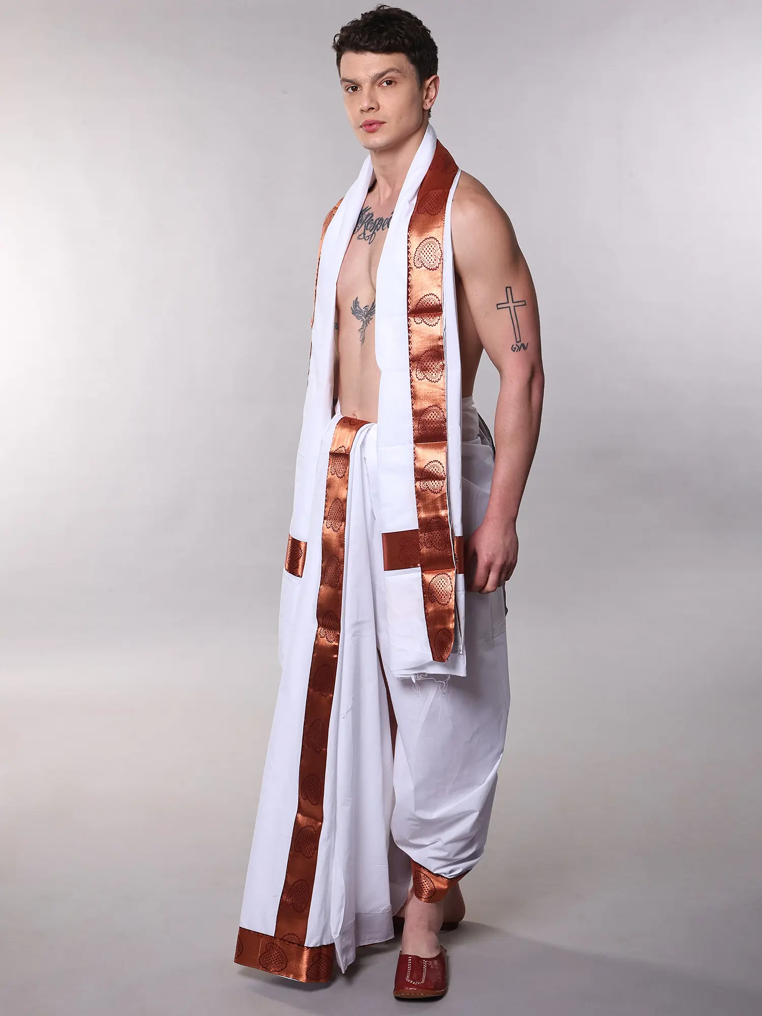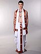 Men's Traditional White Cotton Dhoti and Angavastram with Copper Paisley Border
