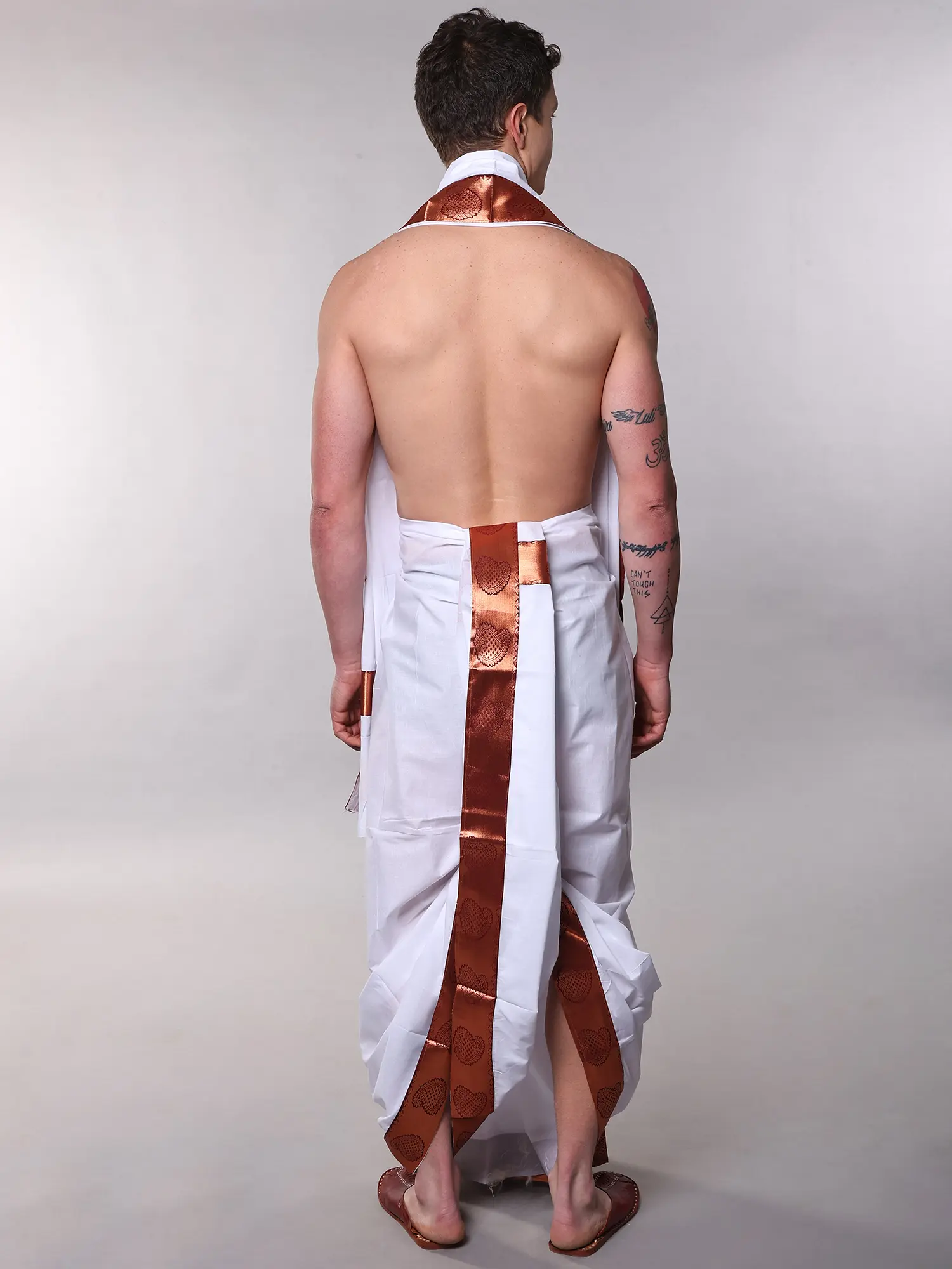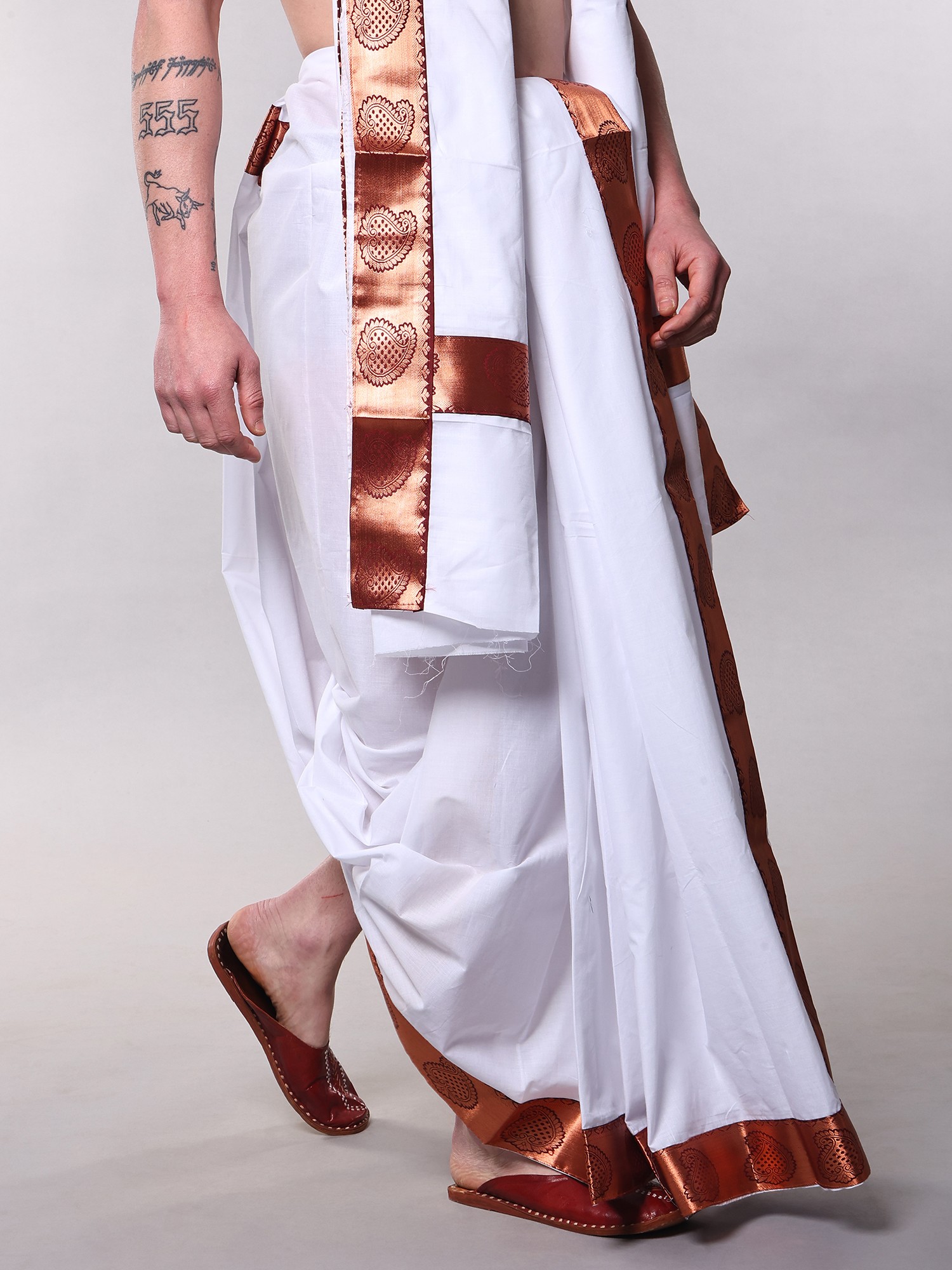 The brilliant white cotton provides a pristine canvas for the rich, copper-hued borders that adorn both the dhoti and the angavastram. These borders, featuring a detailed paisley pattern, create a striking visual contrast, exuding a quiet opulence. The generous dimensions ensure a flawless drape and comfortable fit, allowing you to move with ease and confidence.