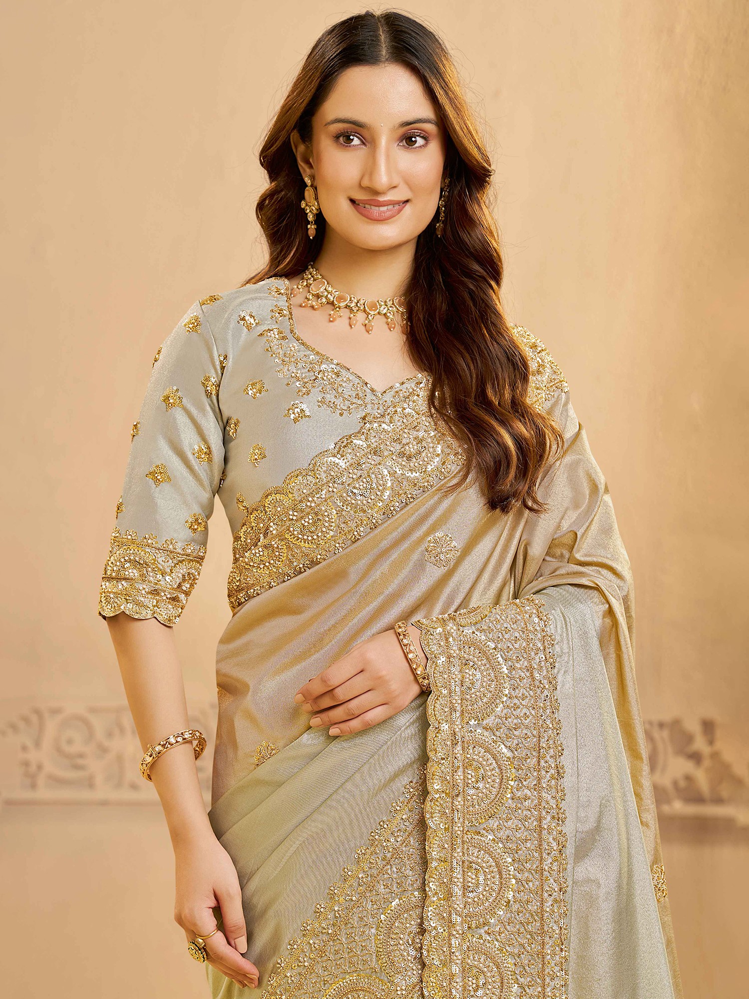 Metallic Kora Zari Silk Saree With Sequins Beads Work And Scalloped Border Elegant Wedding And Festive Wear