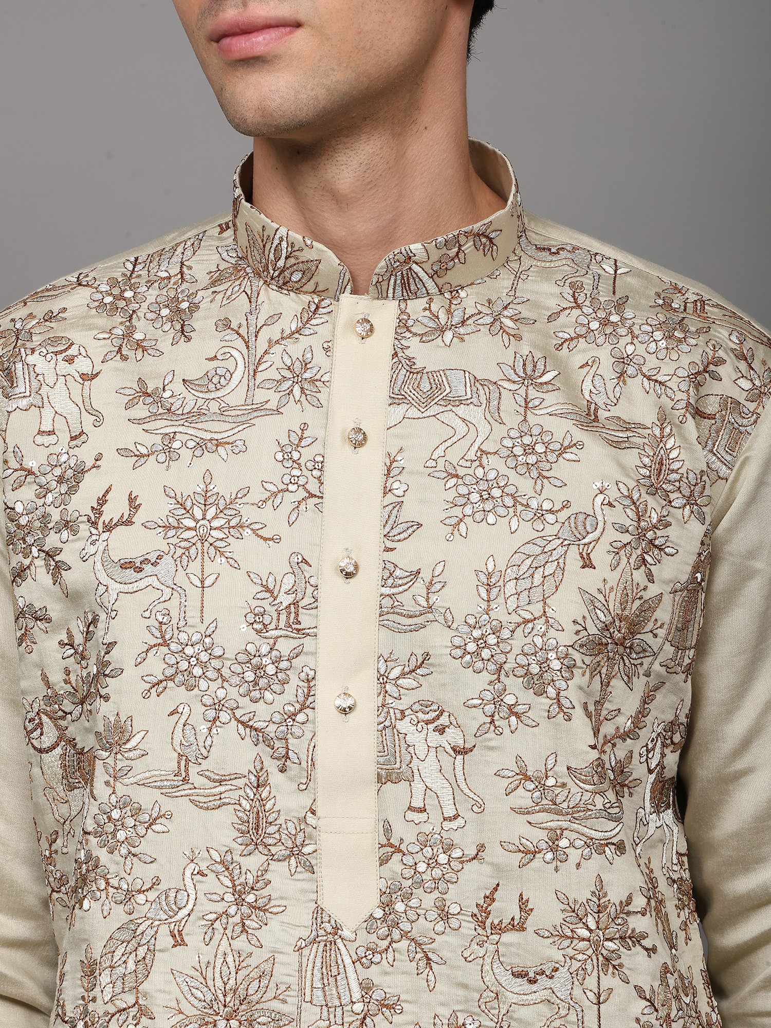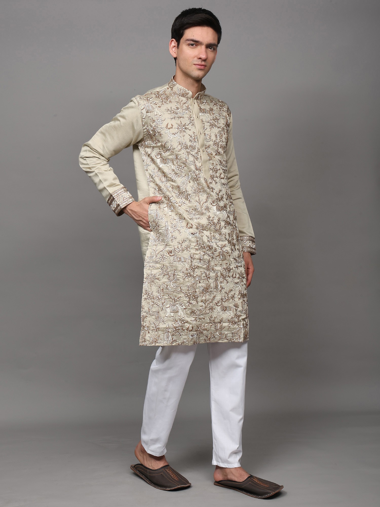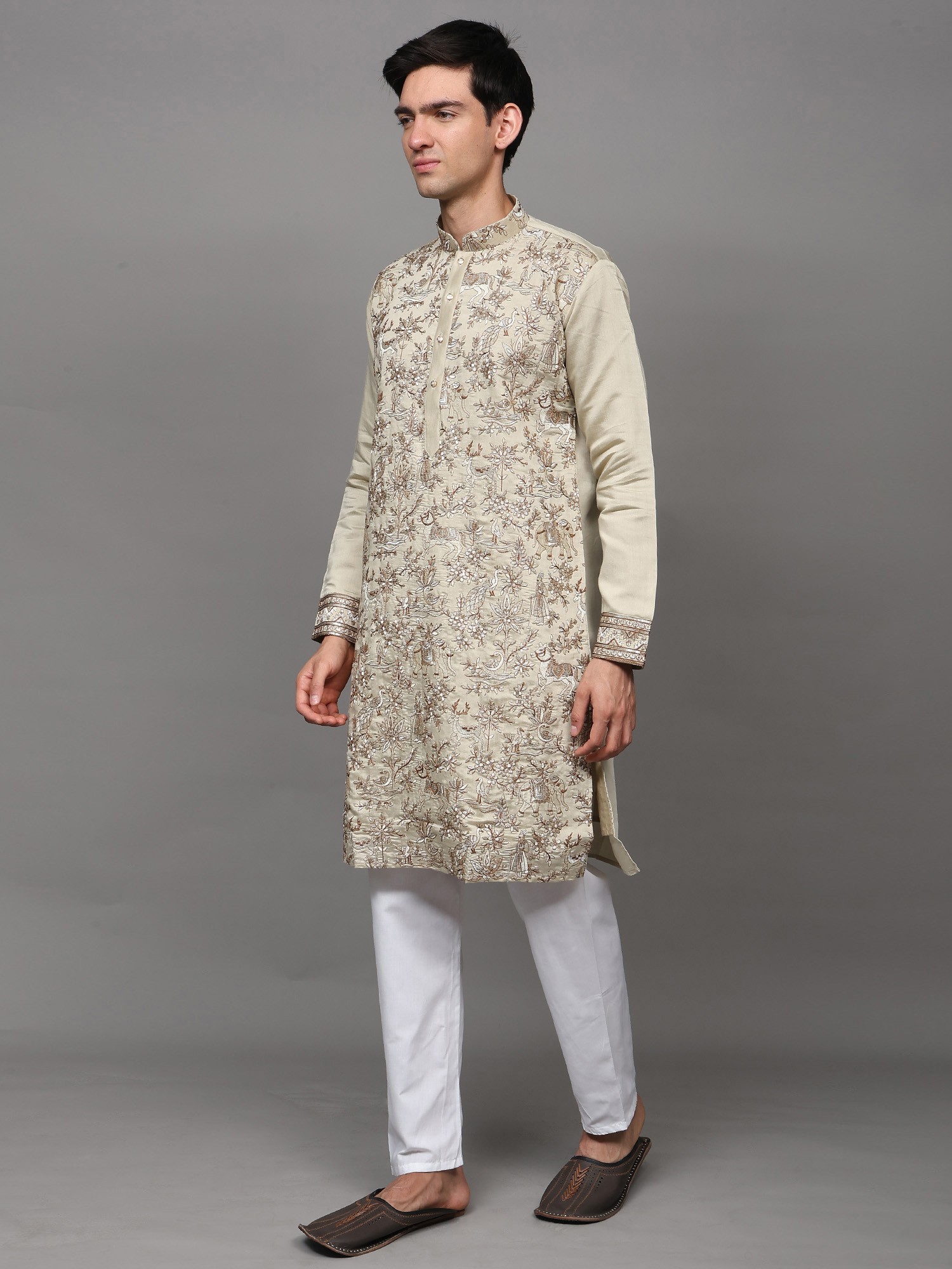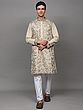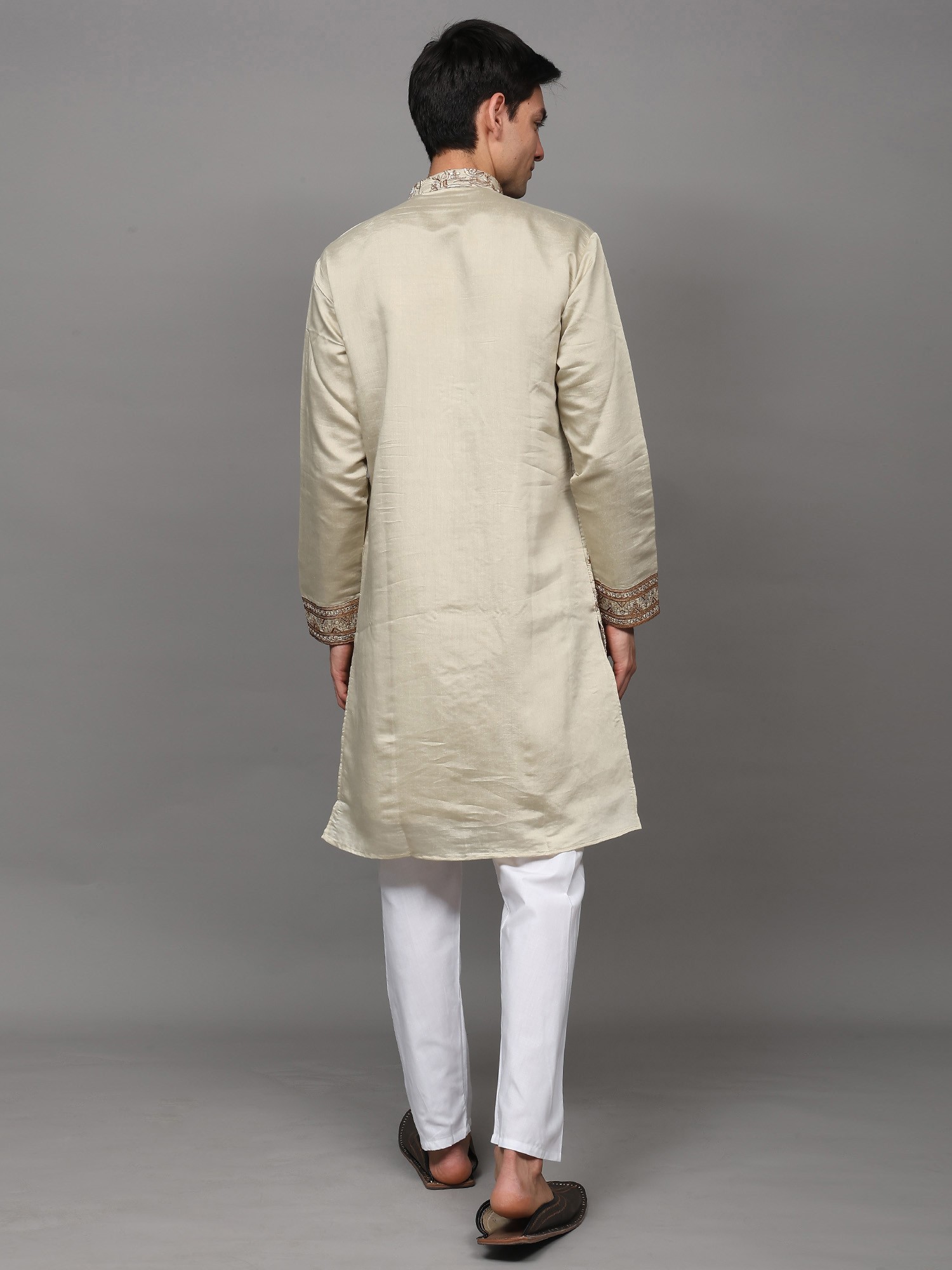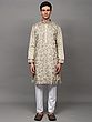 Wedding Kurta Pajama Set with Embroidered Collar and Jacquard Woven Paan Leaves