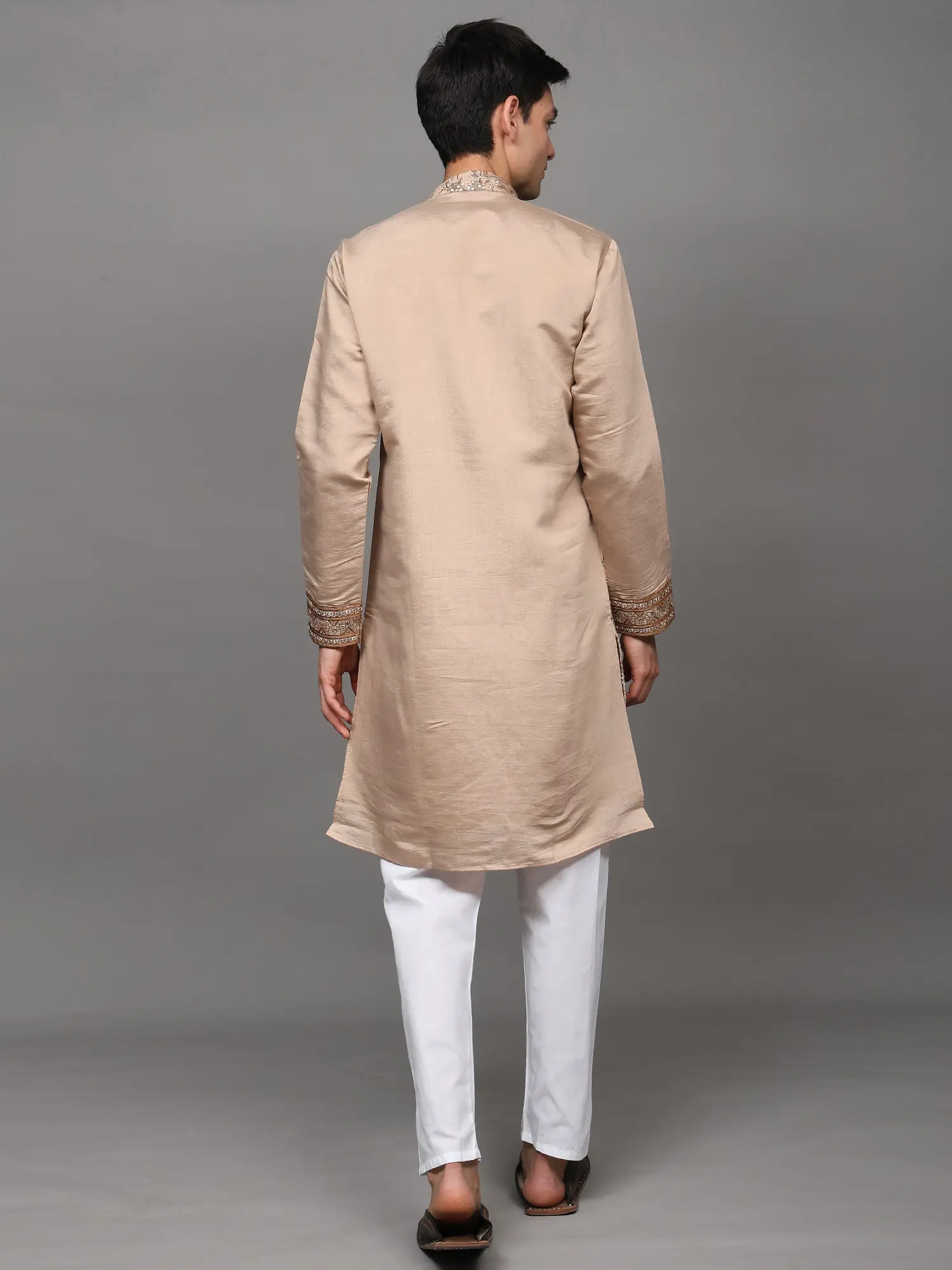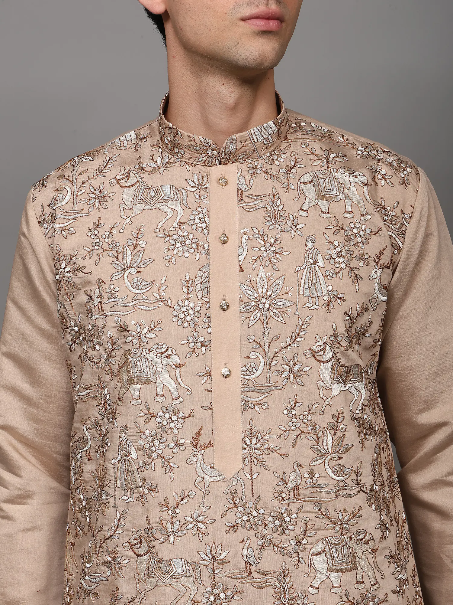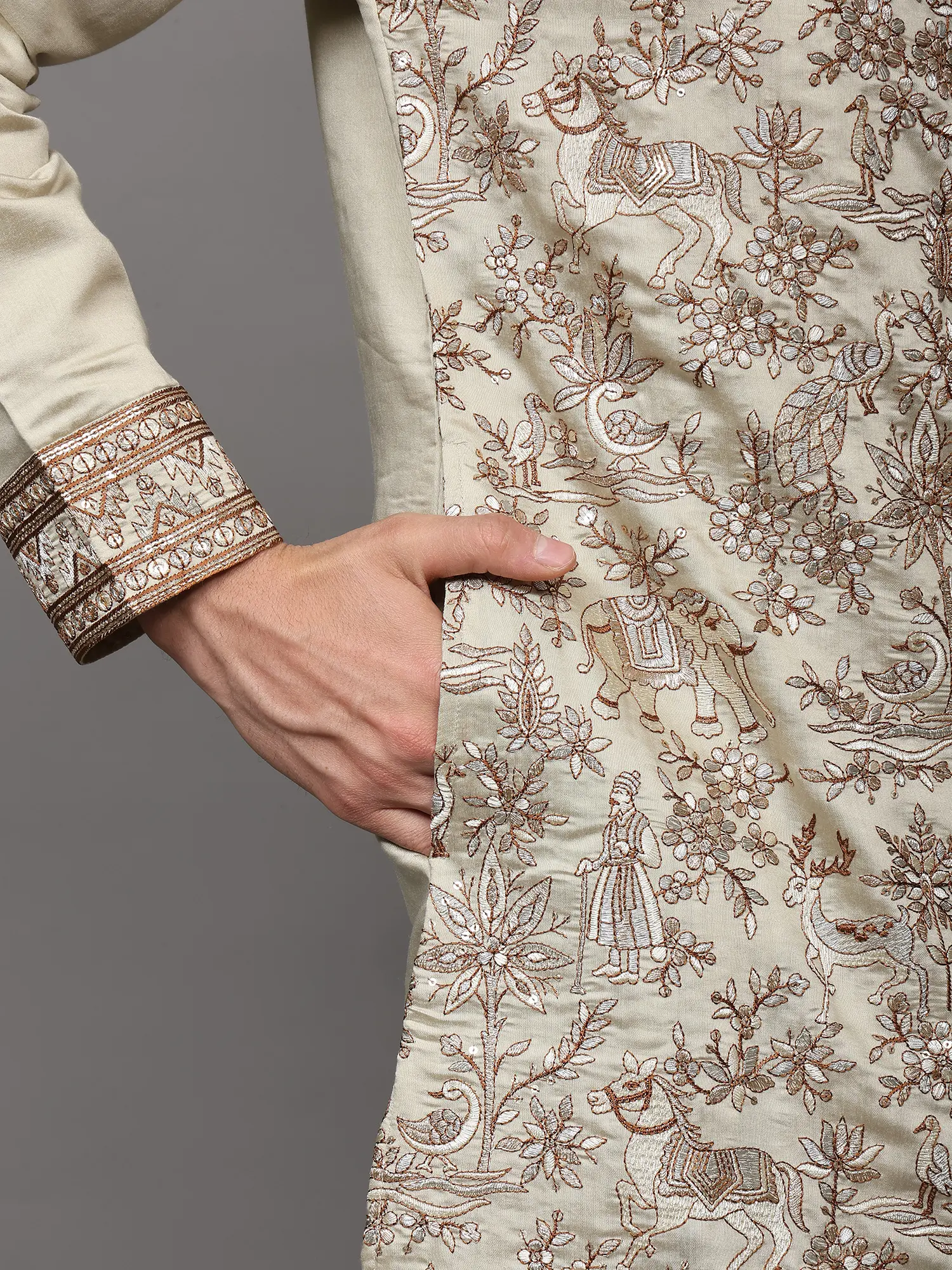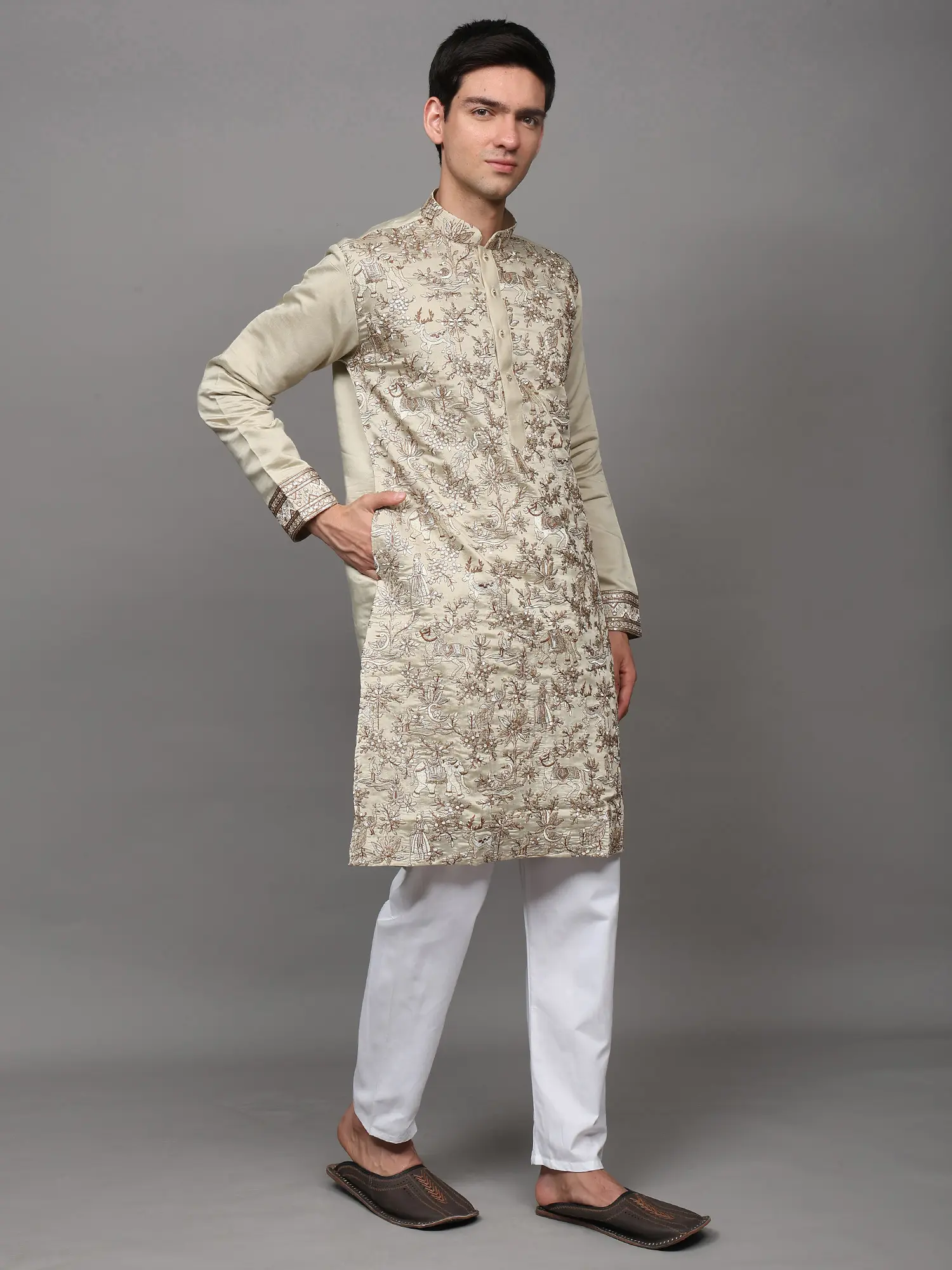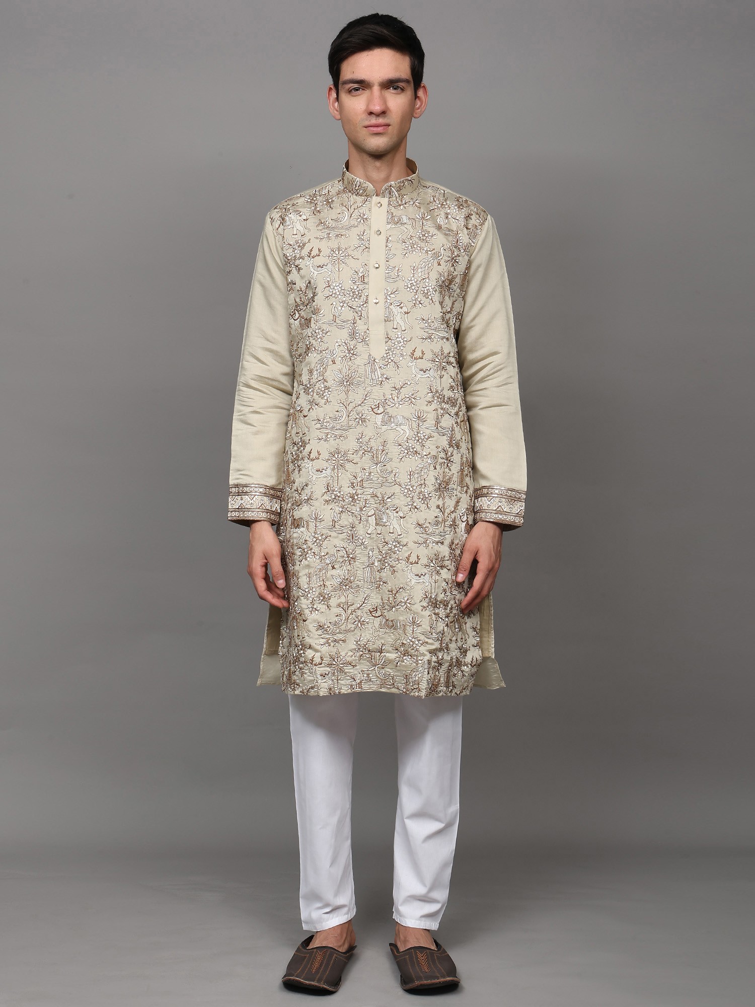 Wedding Kurta Pajama Set with Embroidered Collar and Jacquard Woven Paan Leaves