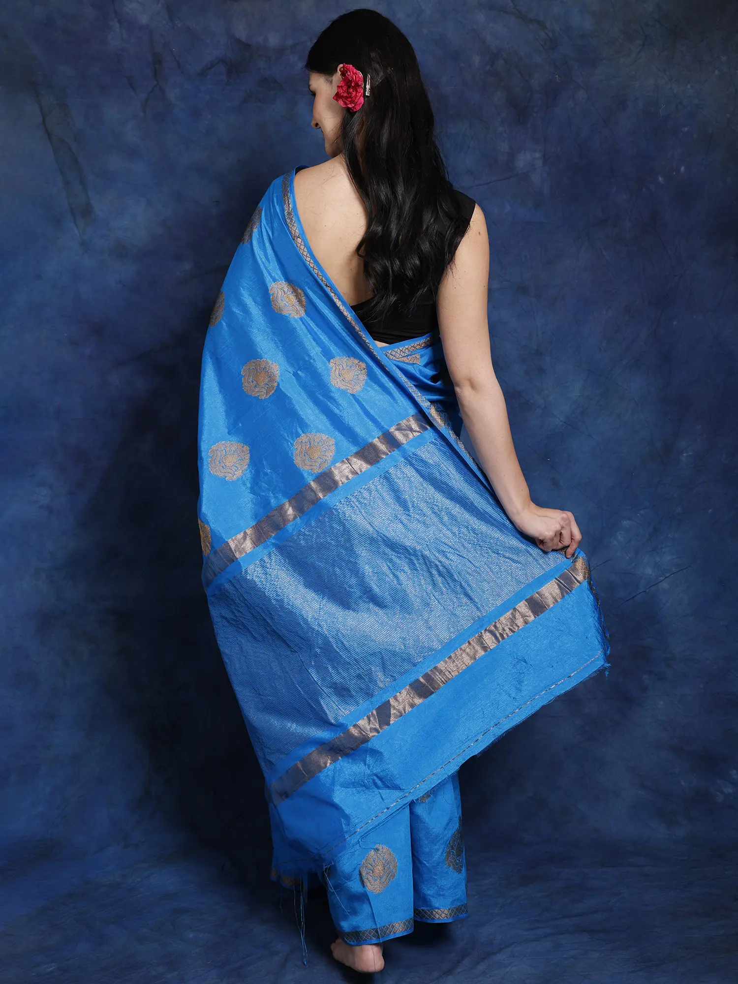 Enjoy luxury and comfort with affordable style wrapped in the embrace of this art silk methyl blue saree. Picked from the workshops of Chennai, known for producing regal sarees for centuries, the art silk fabric is chosen to allow breathability without compromising on the softness and royalty of traditional Indian drapes.