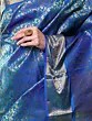 The captivating methyl-blue hue provides a dramatic backdrop for the elaborate Zari-woven patterns that cascade across its expanse, creating a mesmerizing interplay of light and shadow. You'll appreciate the delicate borders, each imbued with a border that frames the opulent motifs, adding depth and definition. The carefully considered tailoring ensures the accompanying blouse and underskirt are fashioned precisely to your measurements, promising a flawless and comfortable fit.