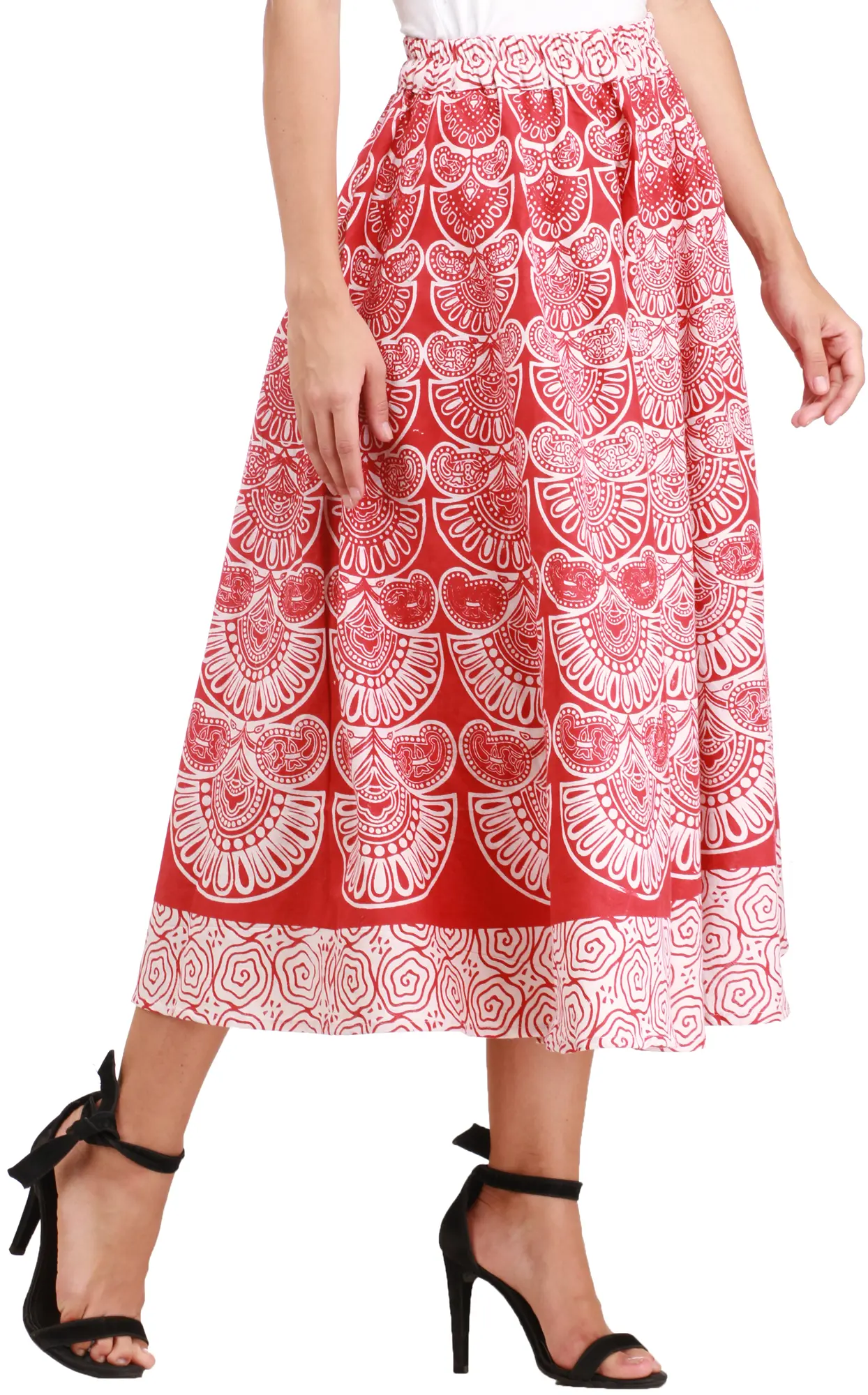 Step into a world of artisanal charm with this exquisite midi skirt, a testament to the rich heritage of Indian textile crafts. Originating from Pilkhuwa, a region renowned for its masterful block printing techniques, this skirt is a wearable work of art. The vibrant red canvas is adorned with intricate white motifs, meticulously hand-stamped by skilled artisans. Each pattern tells a story, a tradition passed down through generations, bringing an authentic touch of culture to your modern wardrobe.