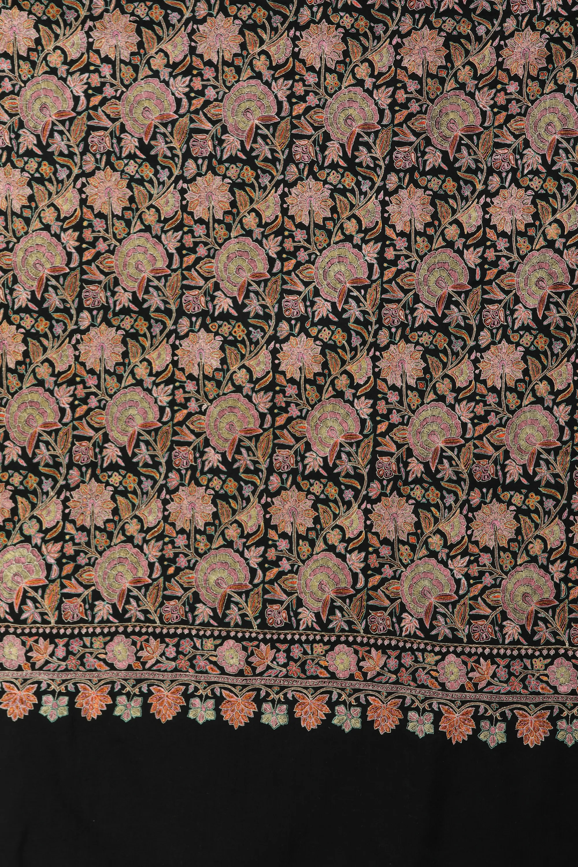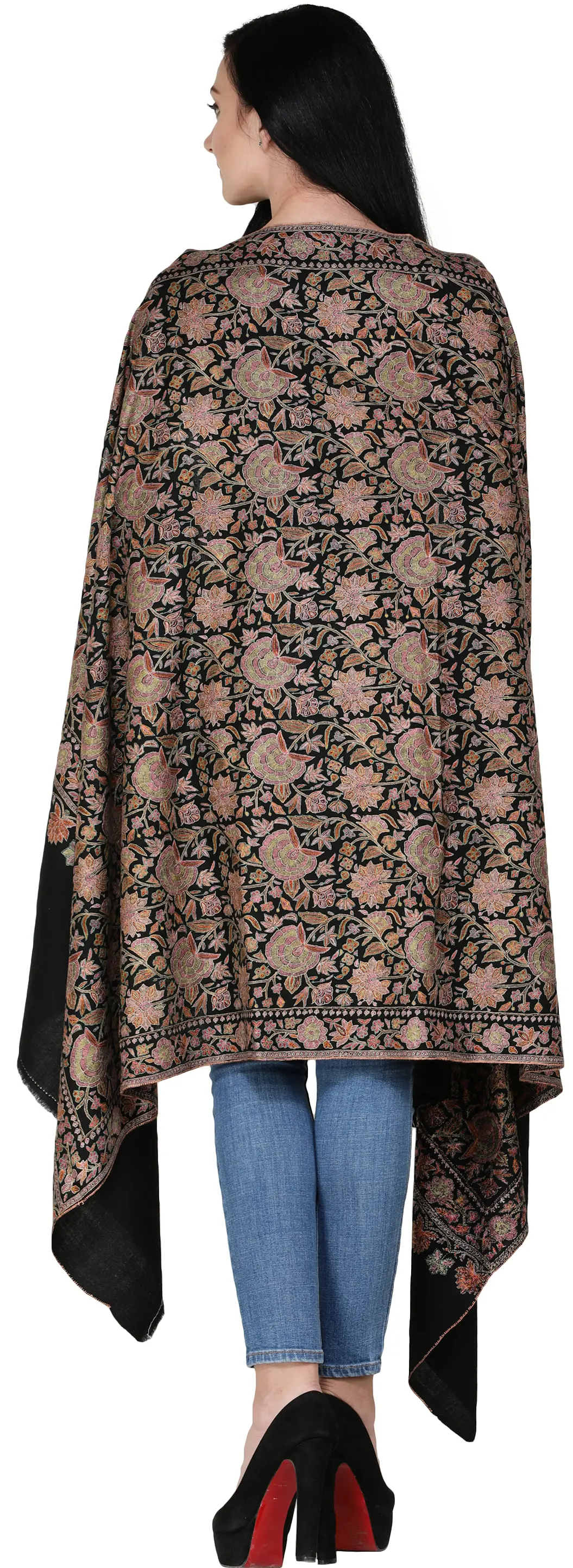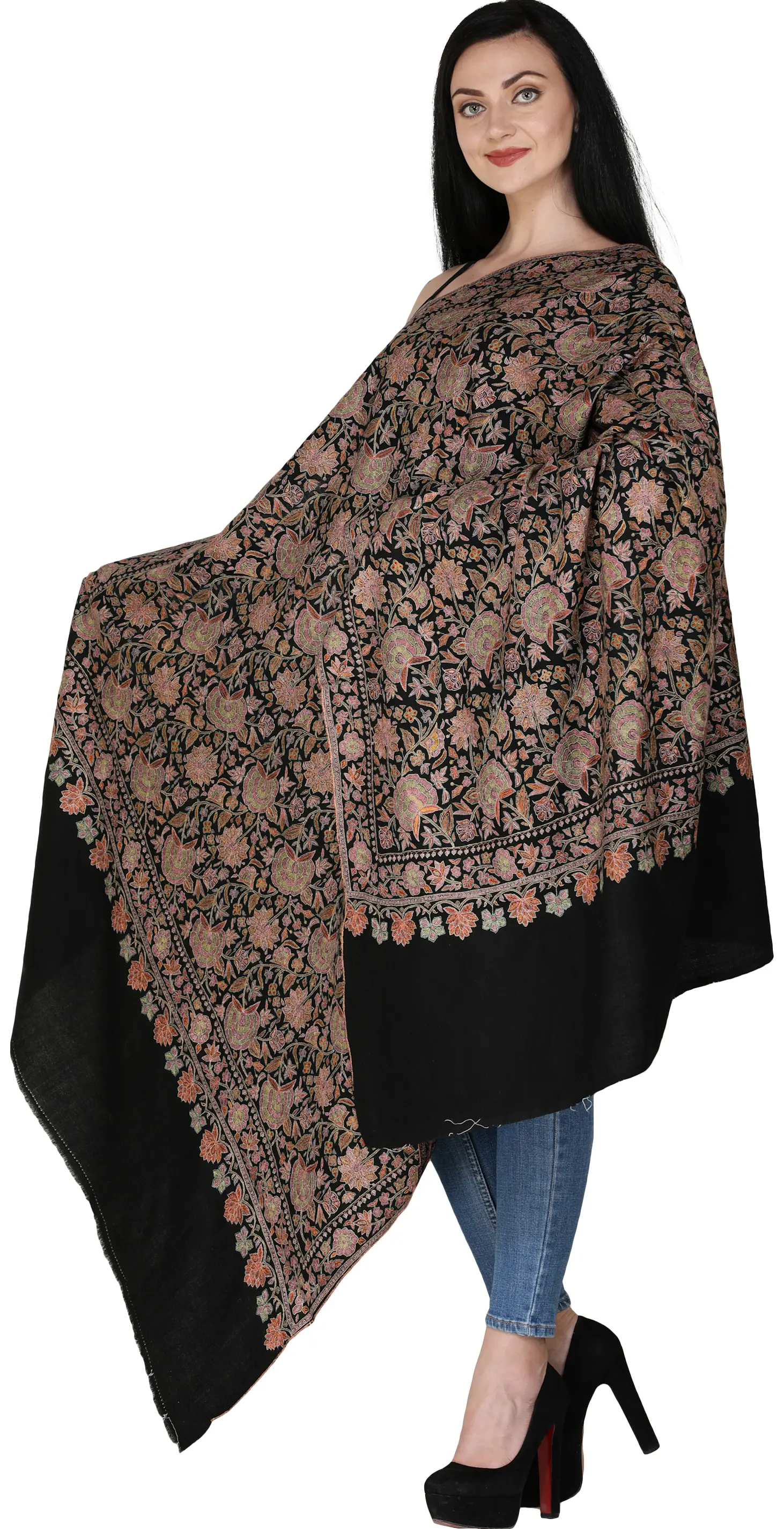 Pashmina is a symbol of love and desire of women all around the world; owning a Pashmina is an experience of luxury. This exclusive art of paradise enhances the beauty of the valley of Kashmir. The pure wool shawl shown on this page gains its wool from a special breed of Kashmiri goat found in high altitude regions of Himalayas. The black base enhances the colorful embroidery on the shawl having floral designs all decked-up in a closed weave style. Pashmina has been a traditional wear for centuries and was also worn by kings and queens thus counting for royalty. The precise weaving of embroidery on a Pashmina is an art that has been passed on from generation to generation.