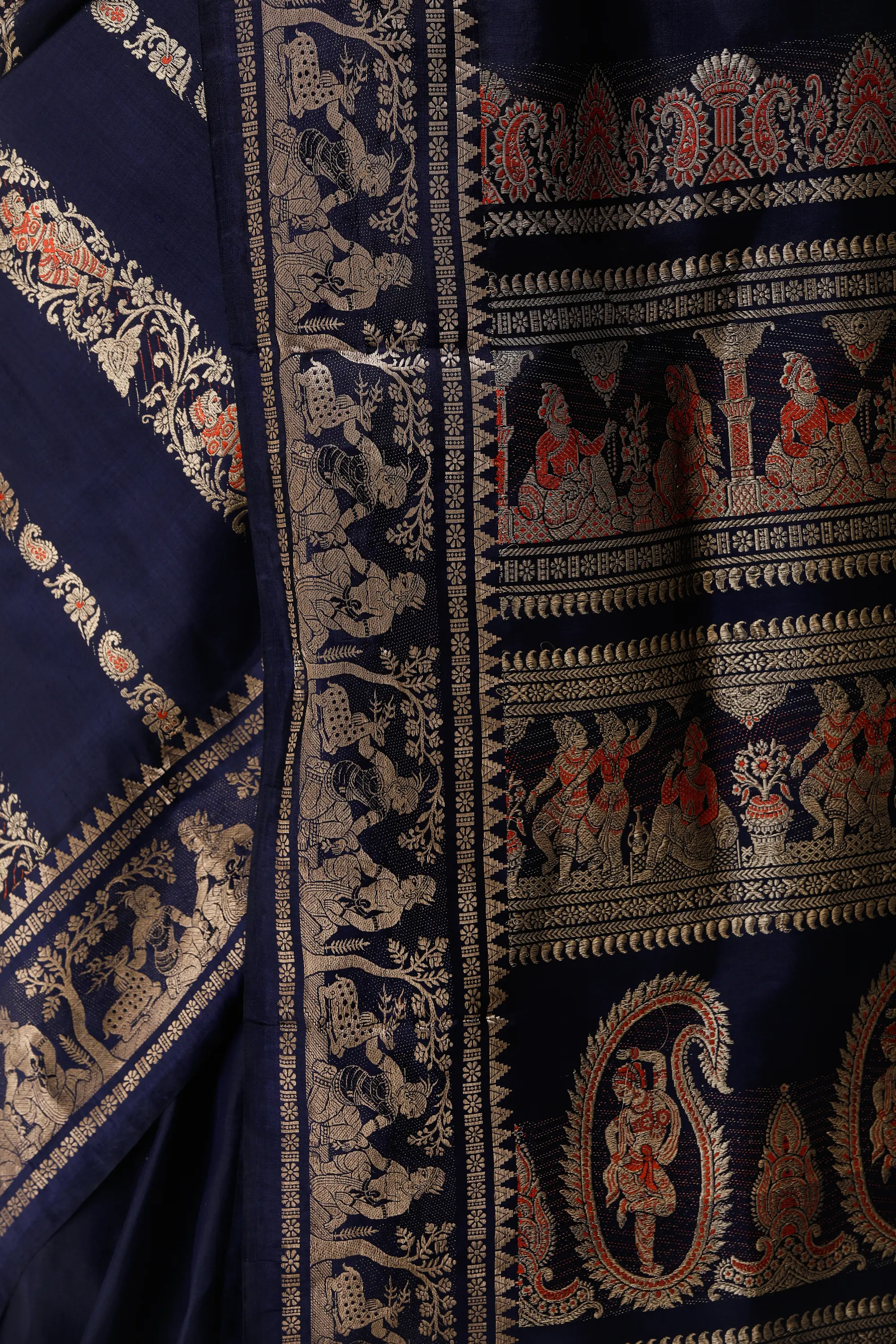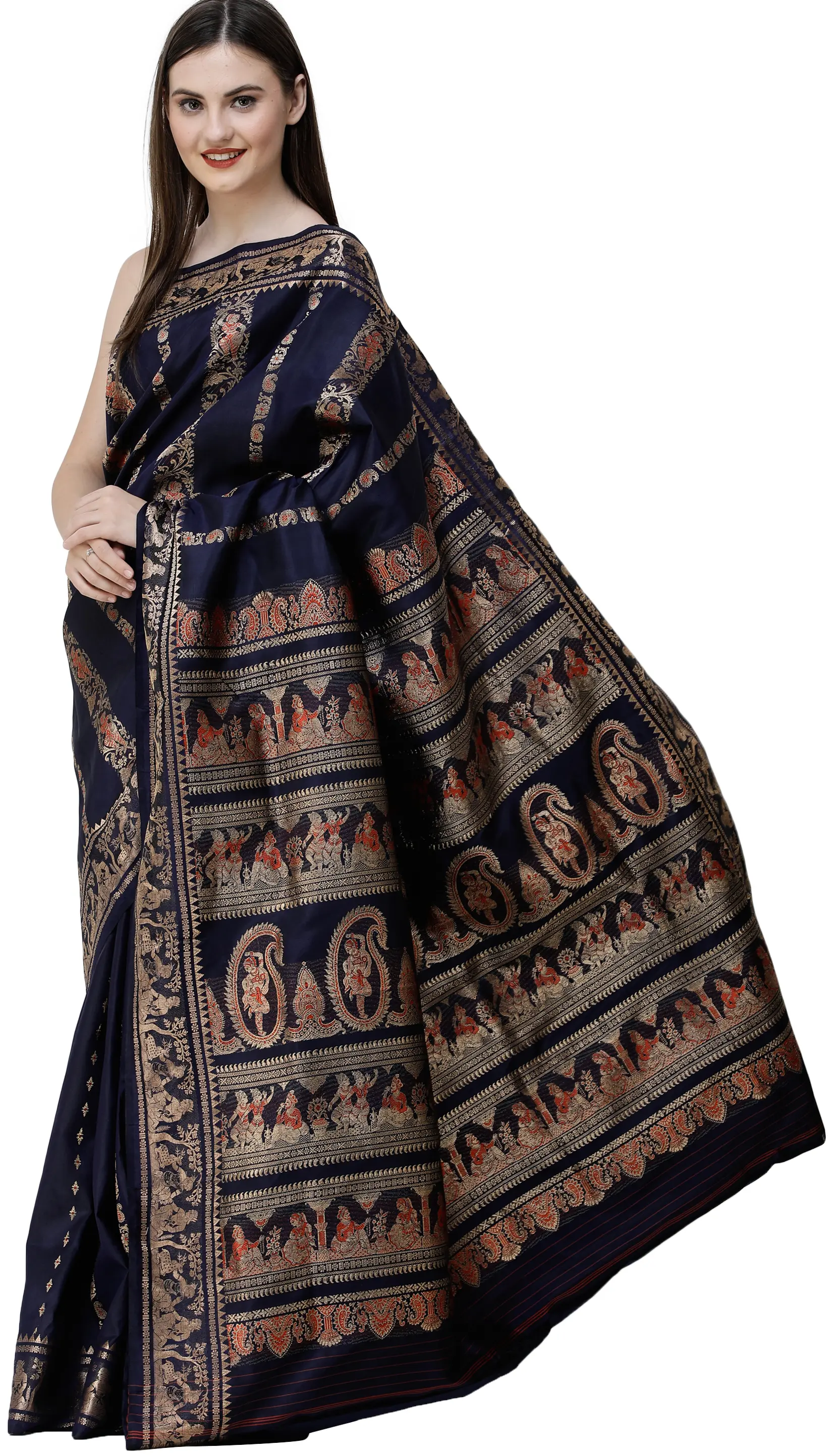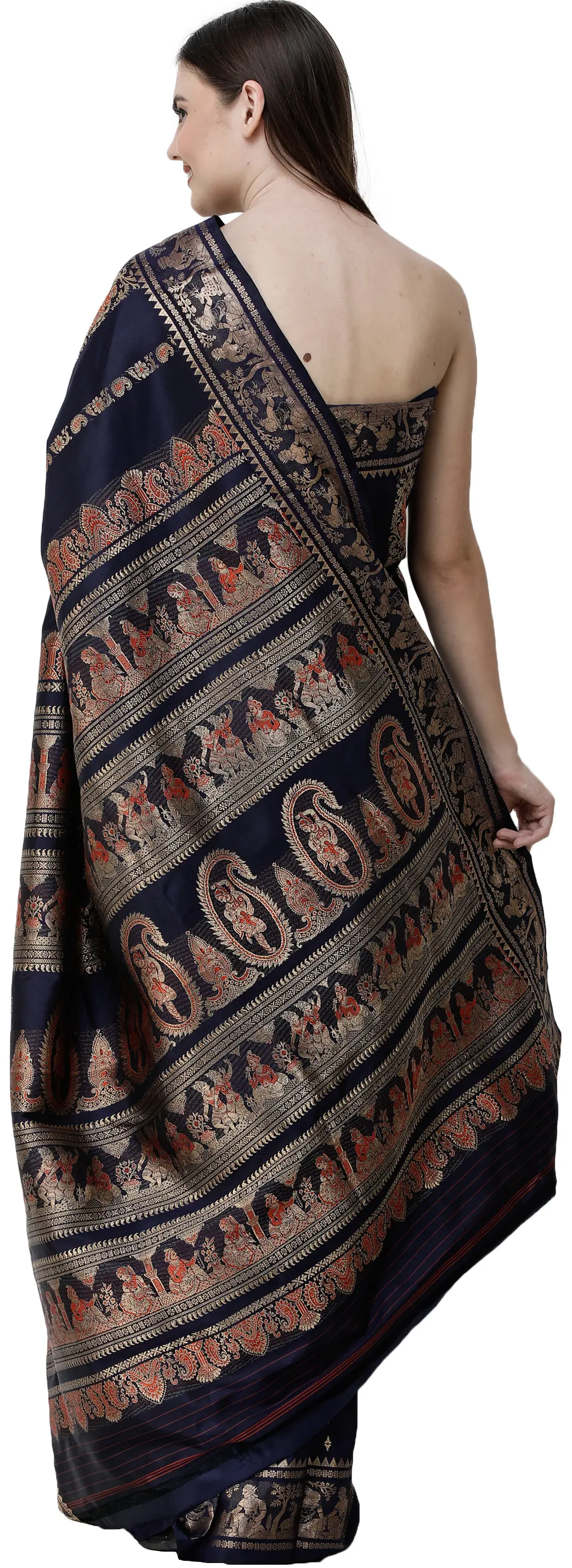Immerse yourself in the rich heritage of Bengal with this exquisite Baluchari silk sari. Crafted from the finest pure silk, this garment is more than just an attire; it's a wearable work of art, a testament to centuries-old weaving traditions. The deep, enigmatic midnight-blue hue provides a perfect canvas for the intricate storytelling woven into its fabric. This sari drapes with an unparalleled grace, its smooth texture promising comfort and luxury with every movement. ––––––––––