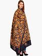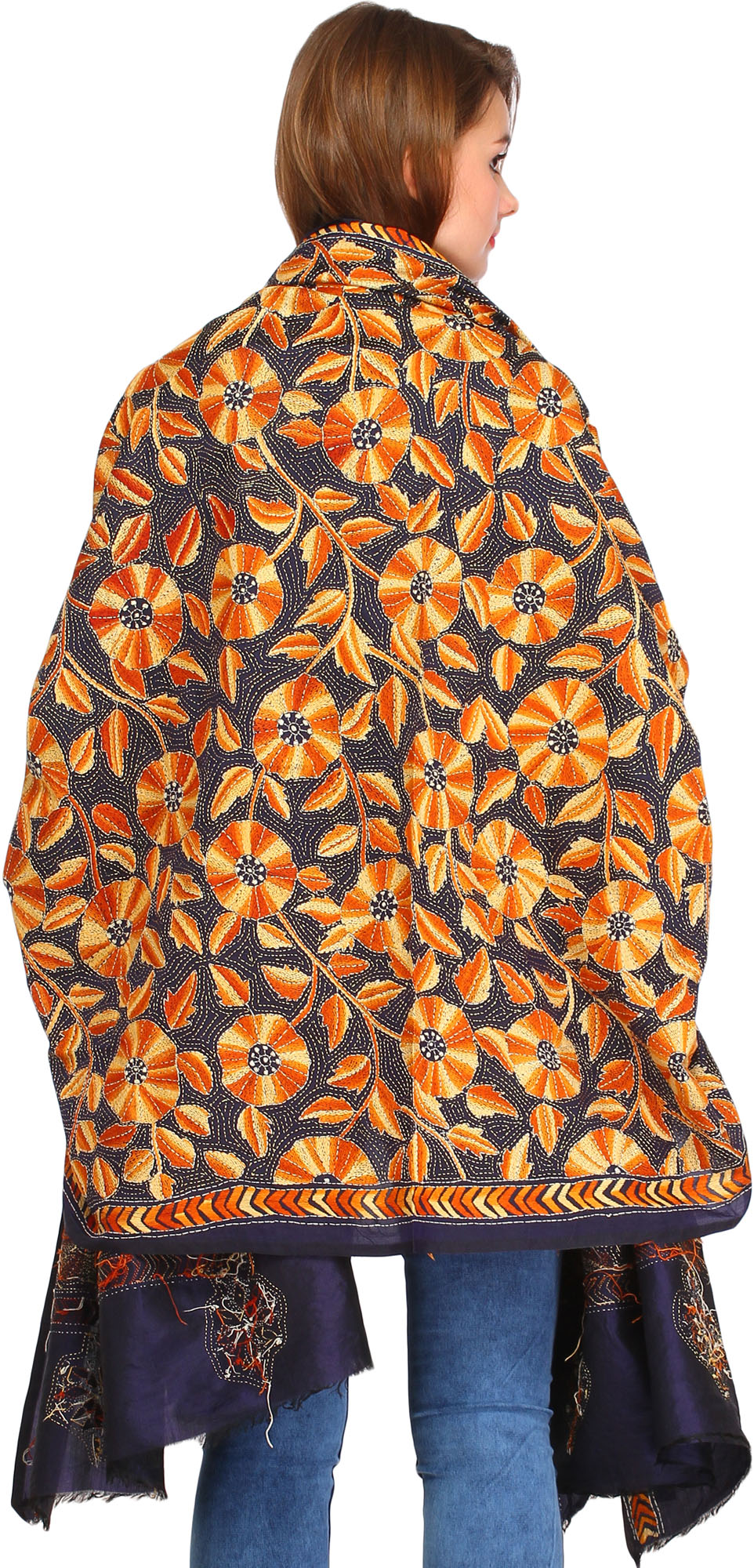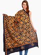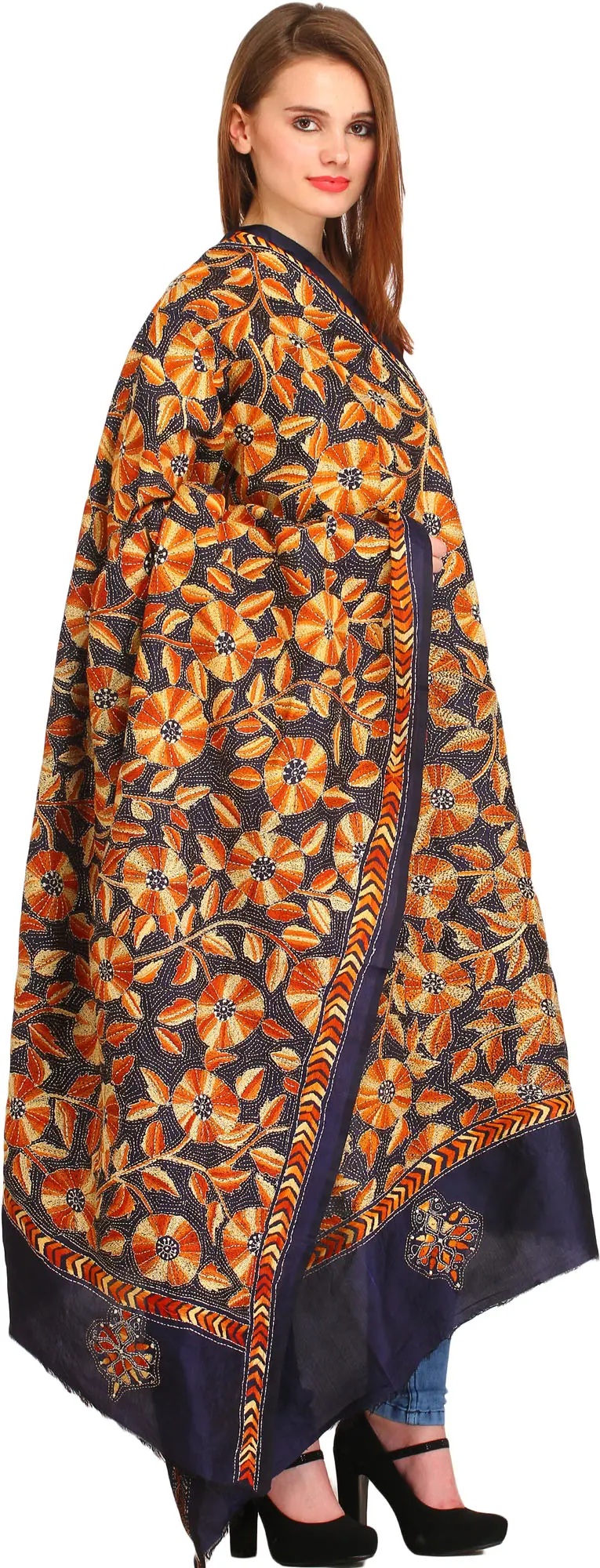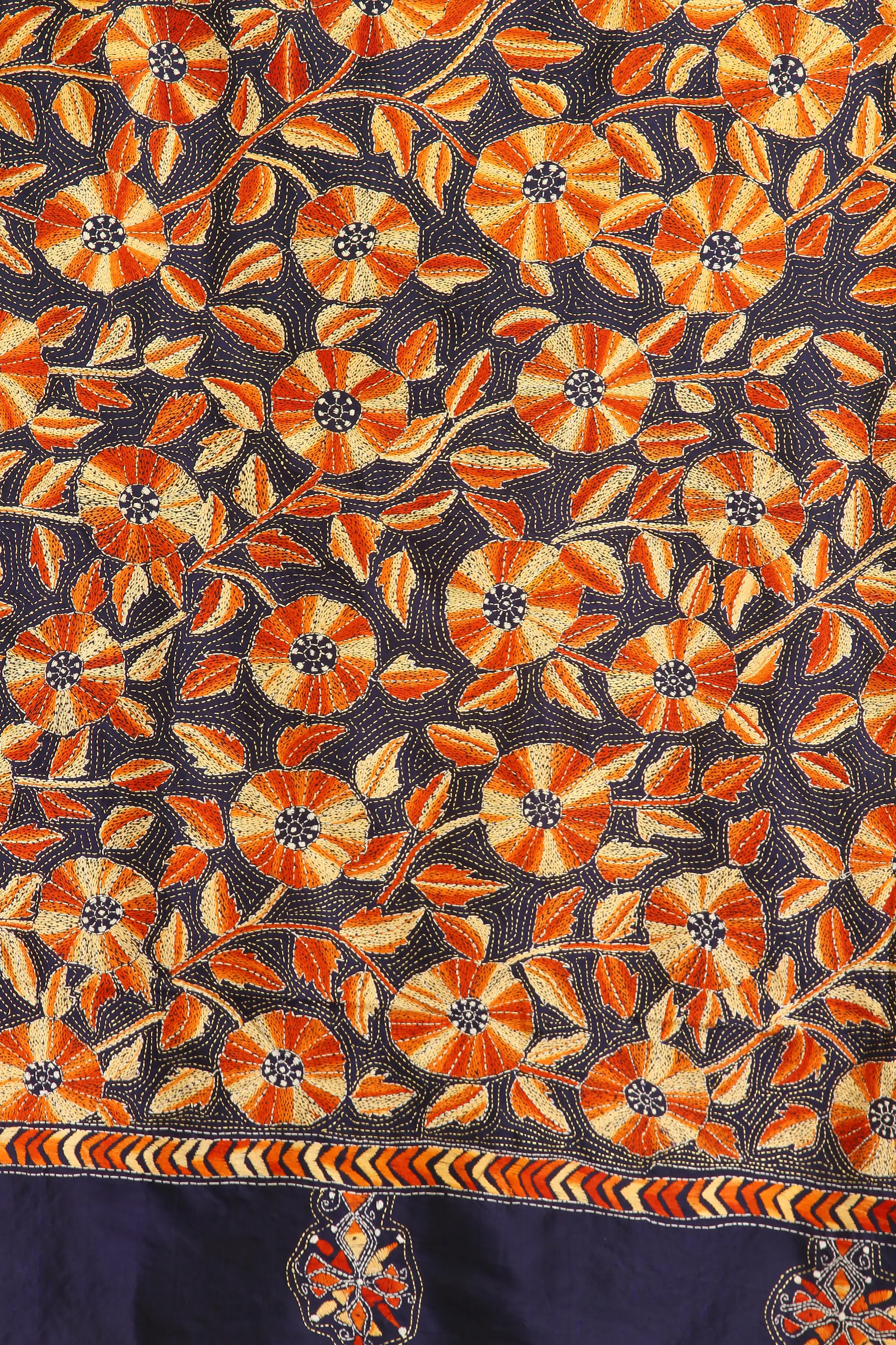 Immerse yourself in the rich heritage of Indian textile artistry with this exquisite Kantha dupatta, a true masterpiece originating from the vibrant cultural hub of Kolkata. Crafted from luxurious silk, this stole is more than just an accessory; it's a wearable work of art, meticulously brought to life by the skilled hands of artisans. The deep, enigmatic midnight-blue base provides a stunning canvas for a riot of intricately embroidered flowers. Each bloom, rendered in warm shades of orange and ochre, bursts forth with life, accented by delicate golden threads that catch the light with every movement.