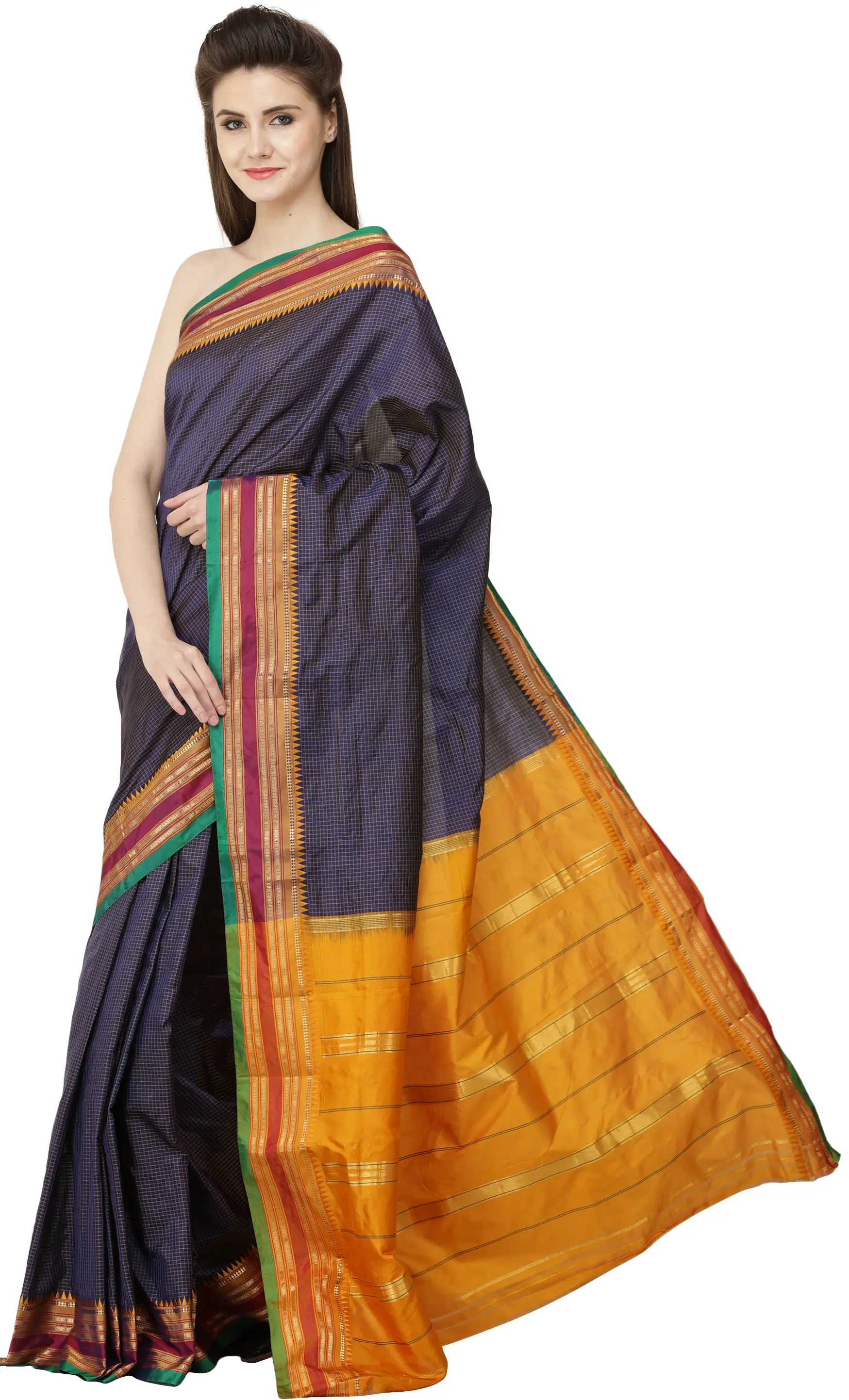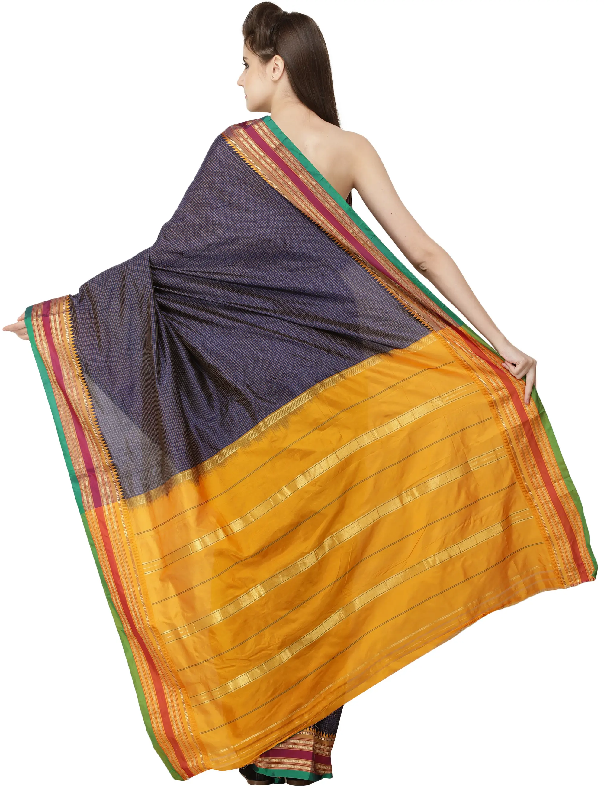 Midnight-Blue Narayanpet Sari from Hyderabad with Zari-Woven Border and Checks