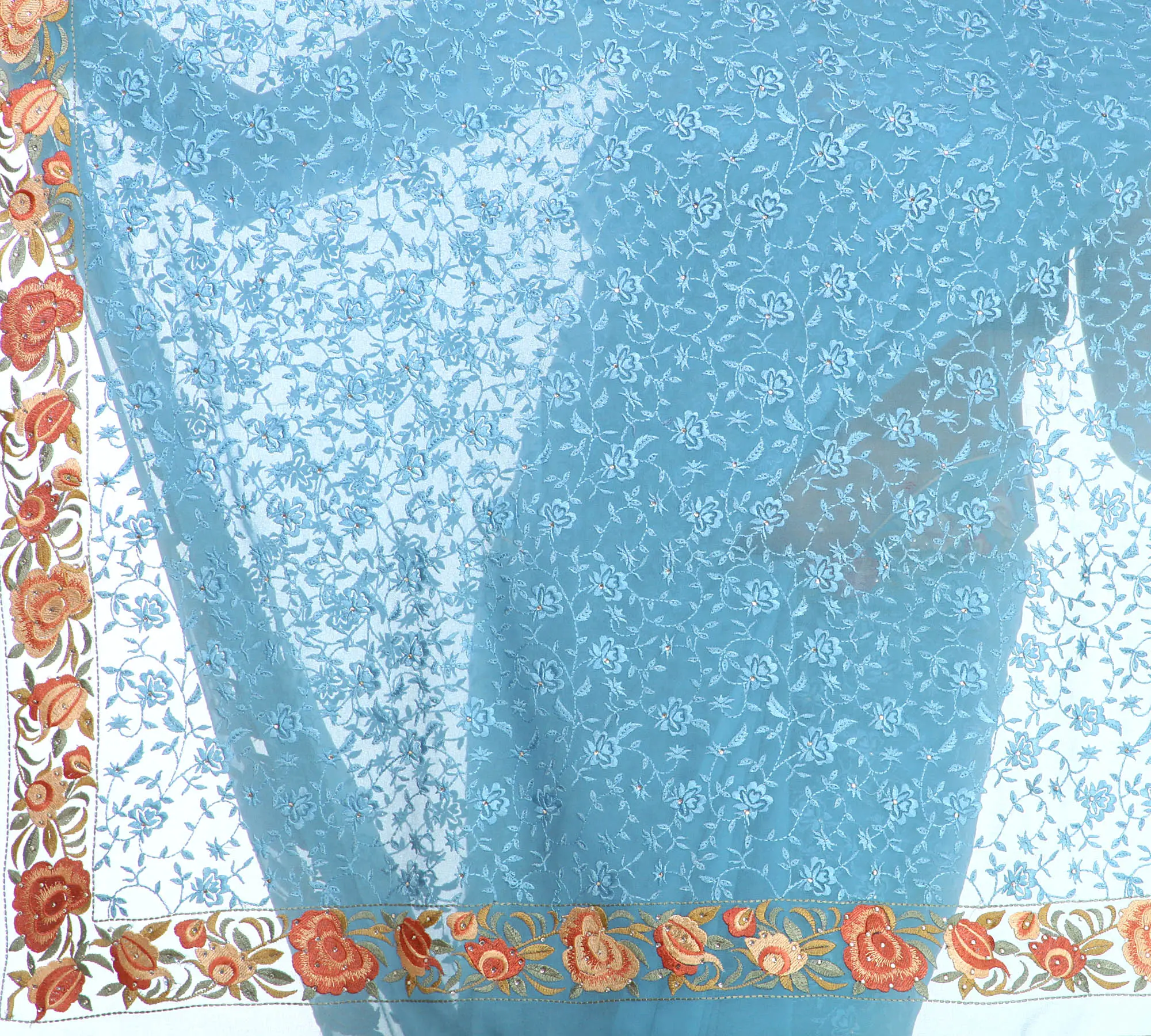 This georgette sari is incredibly versatile, suitable for a wide range of events, from elegant evening gatherings and festive celebrations to intimate weddings. The delicate floral embroidery lends itself beautifully to both traditional and contemporary styling. Pair it with statement jewelry and a stylish blouse to create a look that is uniquely yours. The lightweight georgette fabric ensures comfort throughout the day or night, allowing you to move with ease and confidence. This sari is more than just an outfit; it's an heirloom piece that embodies the rich heritage of Indian textile artistry. The subtle shimmer of the embroidery catches the light beautifully, adding a touch of glamour. Embrace the allure of classic design and intricate embellishments with this stunning Milky-Blue Georgette Sari. ––––––––––––––––––––