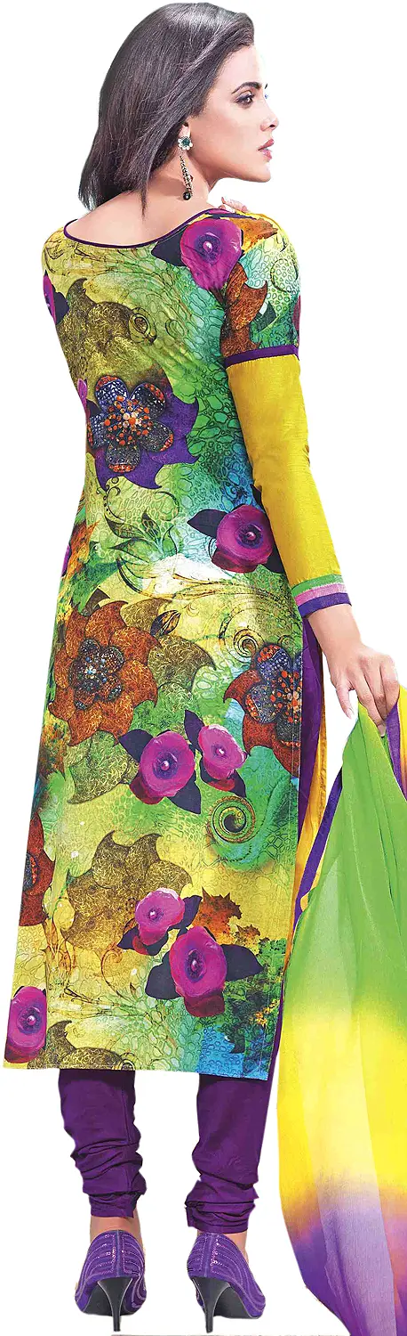 Multi-Color Churidar Kameez Suit with Digital Ikat Print