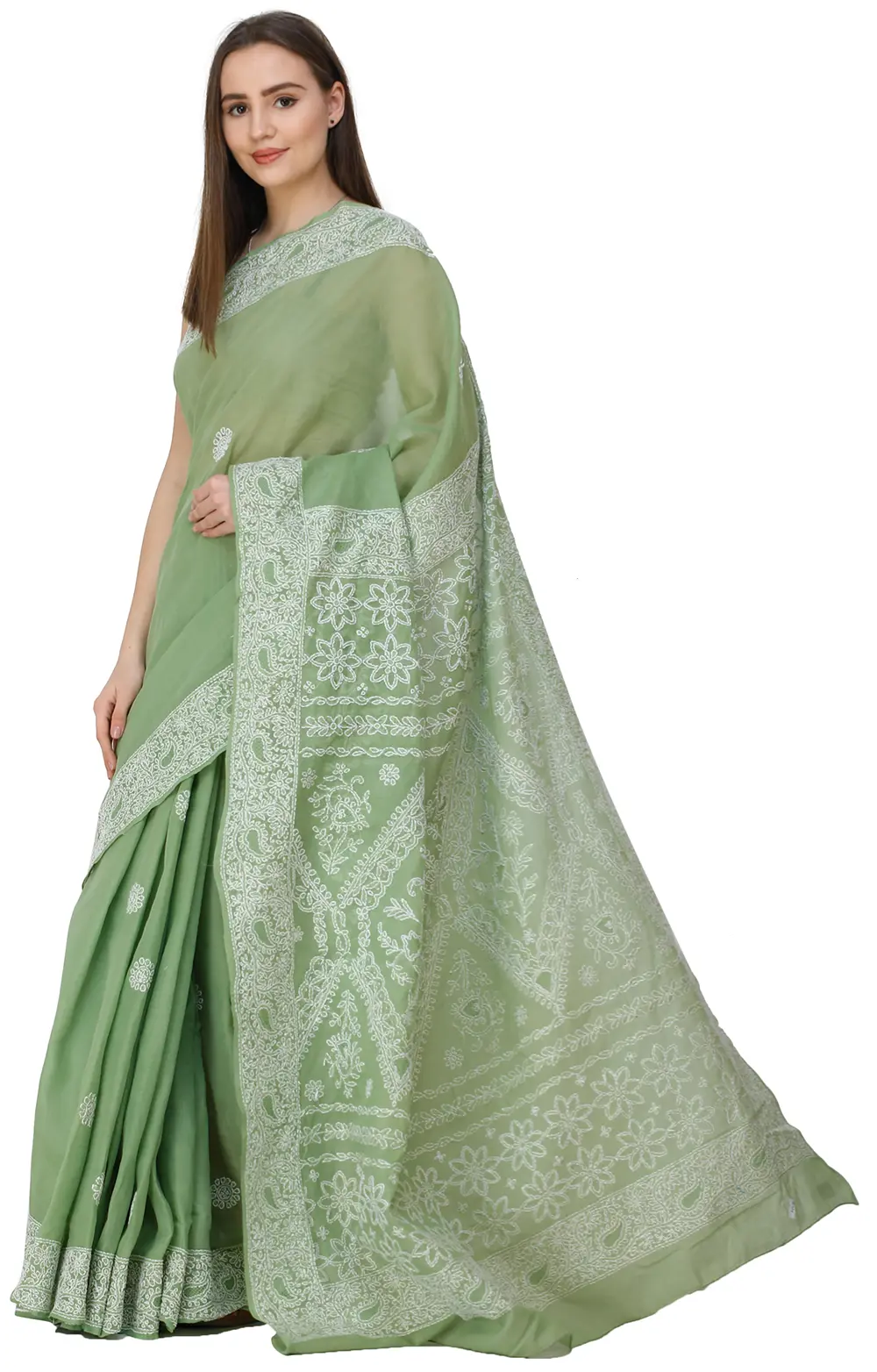 Mineral-Green Lukhnavi Chikan Sari with Hand-Embroidered Paisleys and Flowers