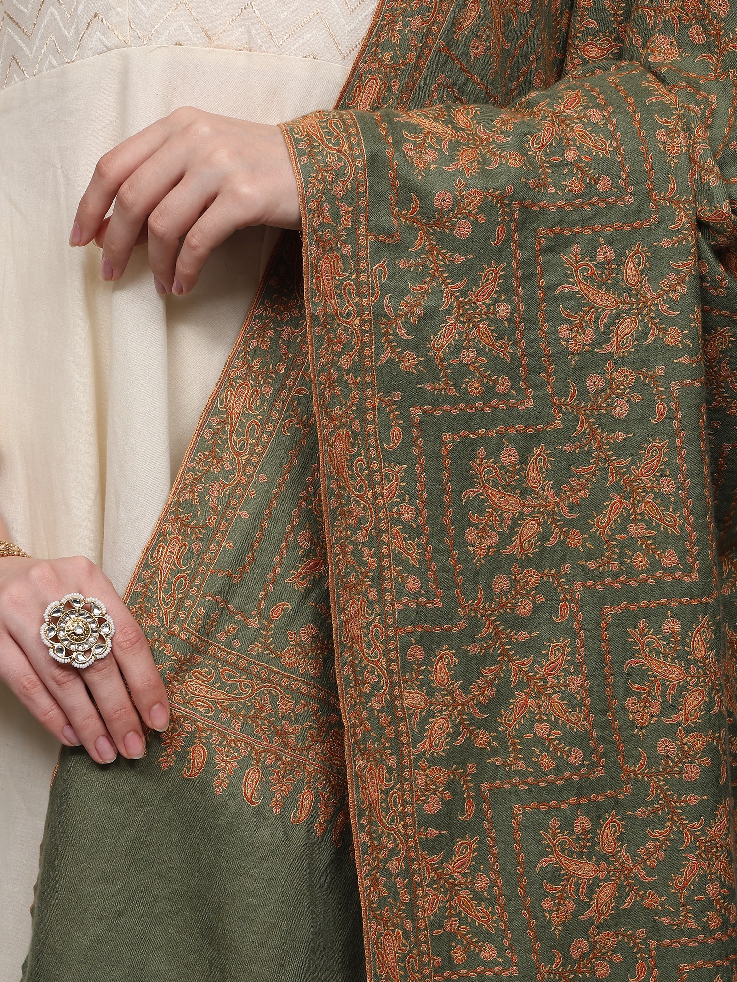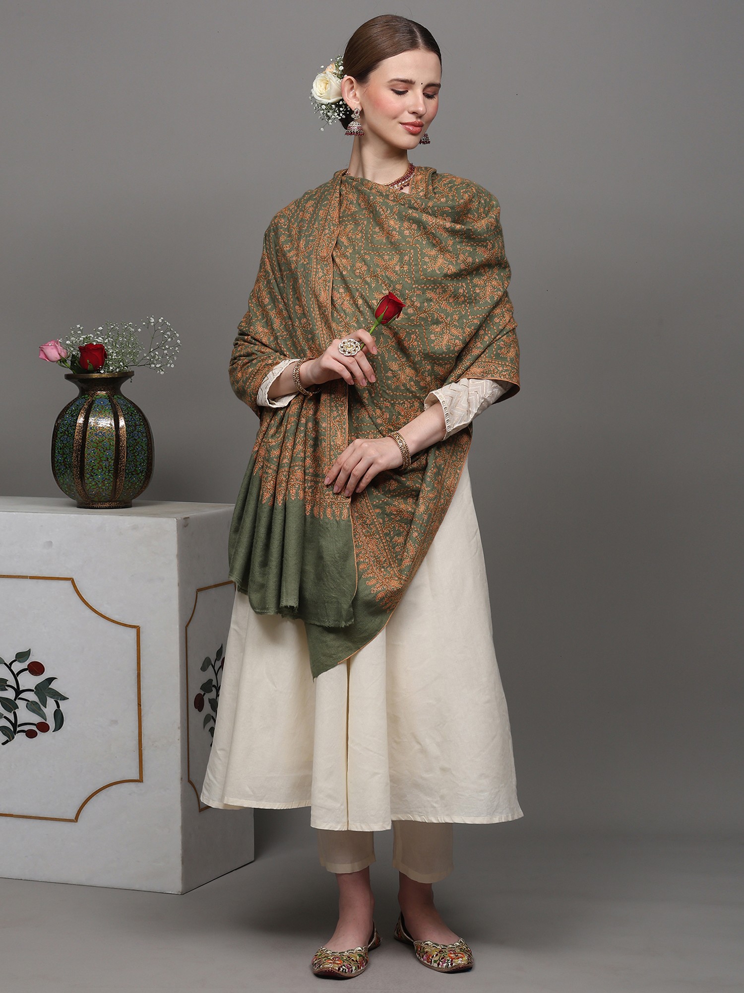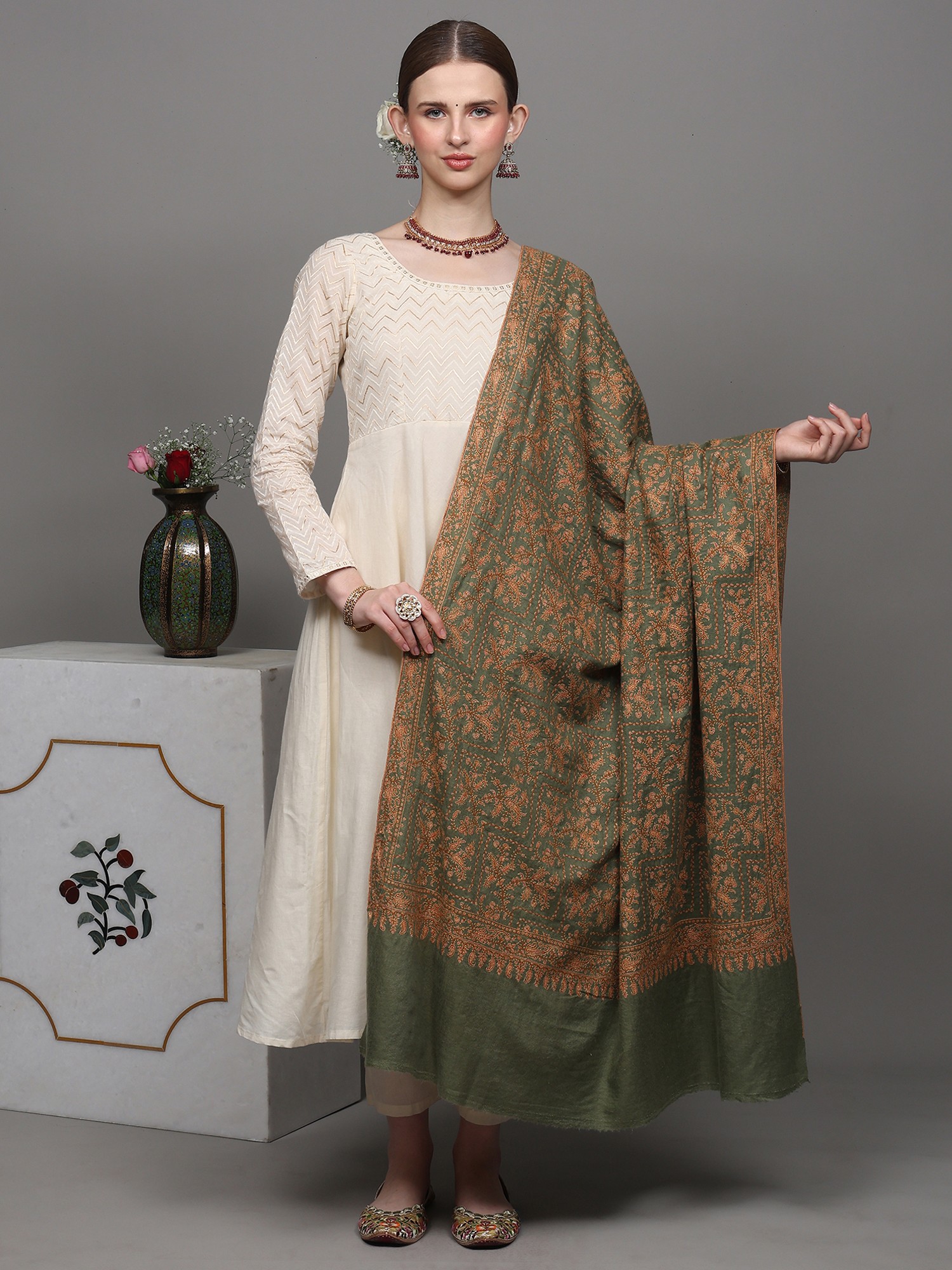 This is an alluring piece of Mineral-Green Kashmiri Shawl with Sozni Embroidered Paisleys. Sozni, a traditional Kashmiri hand-embroidery technique, adds a touch of opulence to this shawl. Its origins trace back to the Mughal era, cherished for its intricacy. The paisley motif, synonymous with Kashmiri art, tells a story of elegance. Today, this design harmoniously blends with contemporary fashion, making a bold statement. The mineral-green hue evokes serenity, while the meticulously embroidered paisleys showcase the unparalleled skills of Kashmiri artisans. Wearing this shawl is like draping yourself in history, a tribute to craftsmanship that has endured centuries.