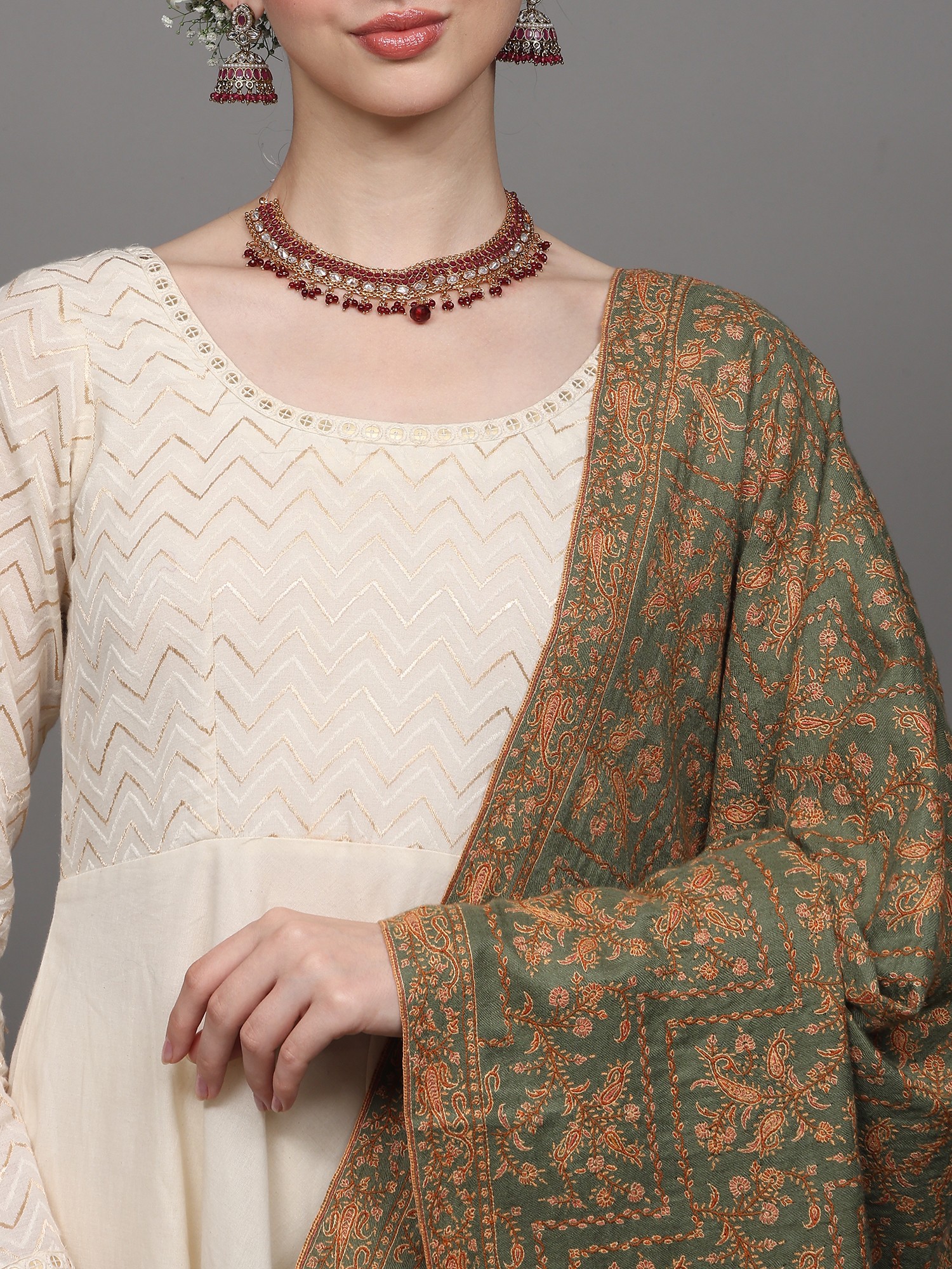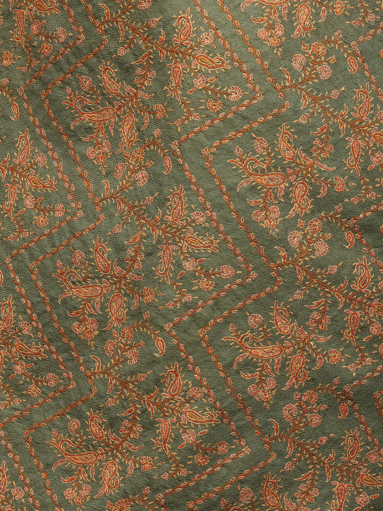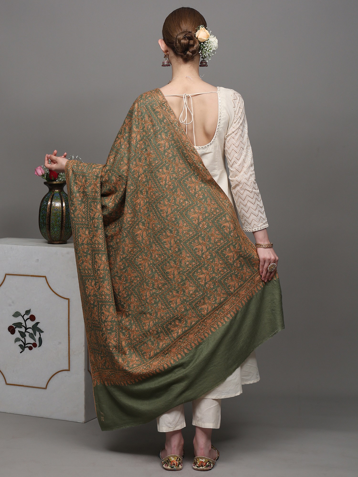 This is an alluring piece of Mineral-Green Kashmiri Shawl with Sozni Embroidered Paisleys. Sozni, a traditional Kashmiri hand-embroidery technique, adds a touch of opulence to this shawl. Its origins trace back to the Mughal era, cherished for its intricacy. The paisley motif, synonymous with Kashmiri art, tells a story of elegance. Today, this design harmoniously blends with contemporary fashion, making a bold statement. The mineral-green hue evokes serenity, while the meticulously embroidered paisleys showcase the unparalleled skills of Kashmiri artisans. Wearing this shawl is like draping yourself in history, a tribute to craftsmanship that has endured centuries.