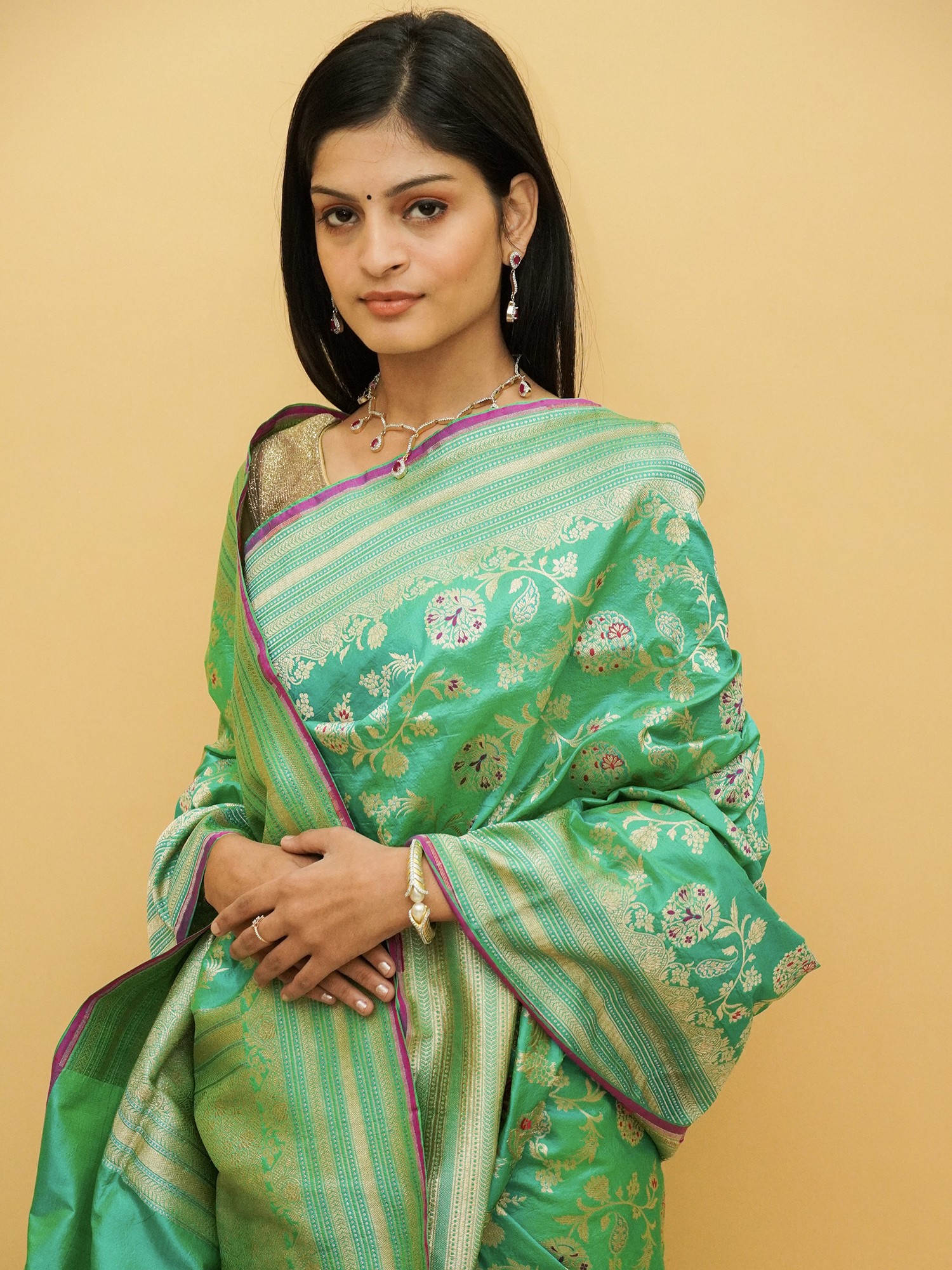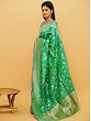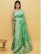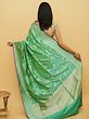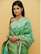 The traditional pure silk Banarasi saree has been given a touch of chic by the use of a refreshing mint green shade, complemented by purple tinges. Complex floral patterns are seen on the pallu or endpiece of the saree, where a mind-blowing network of brocaded weaves is present. On the body of the sari are beatific patterns of blossoms, enhancing the freshness of the mint green sari with their fragrant presence. Wrapped in this festive Banarasi saree, you will turn more than a few heads on your next big day.
