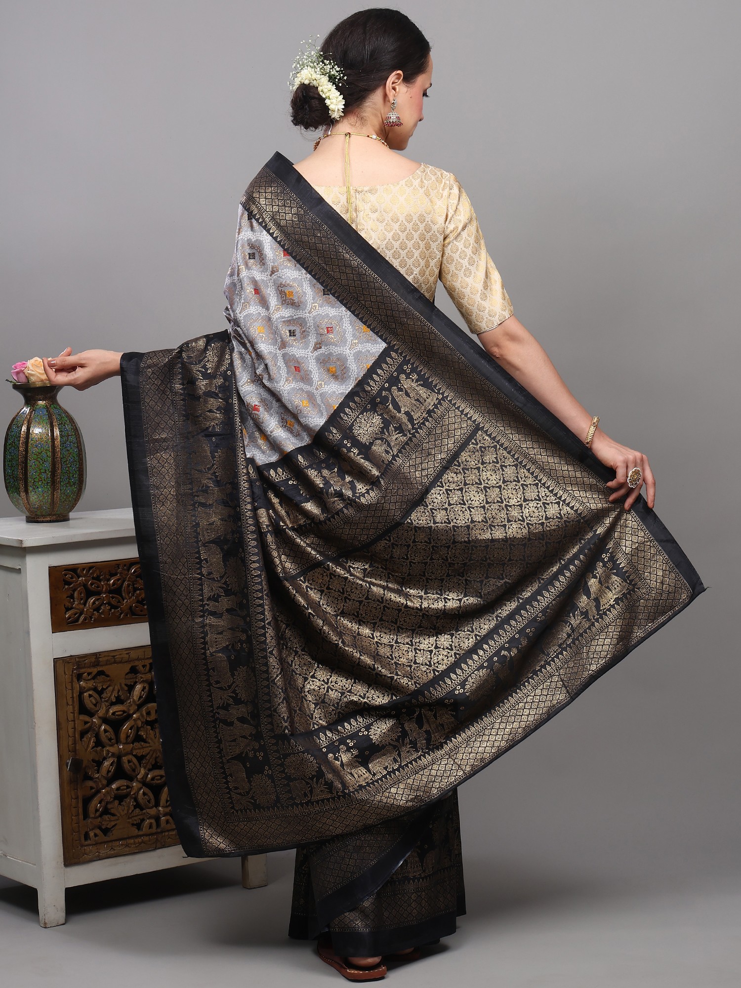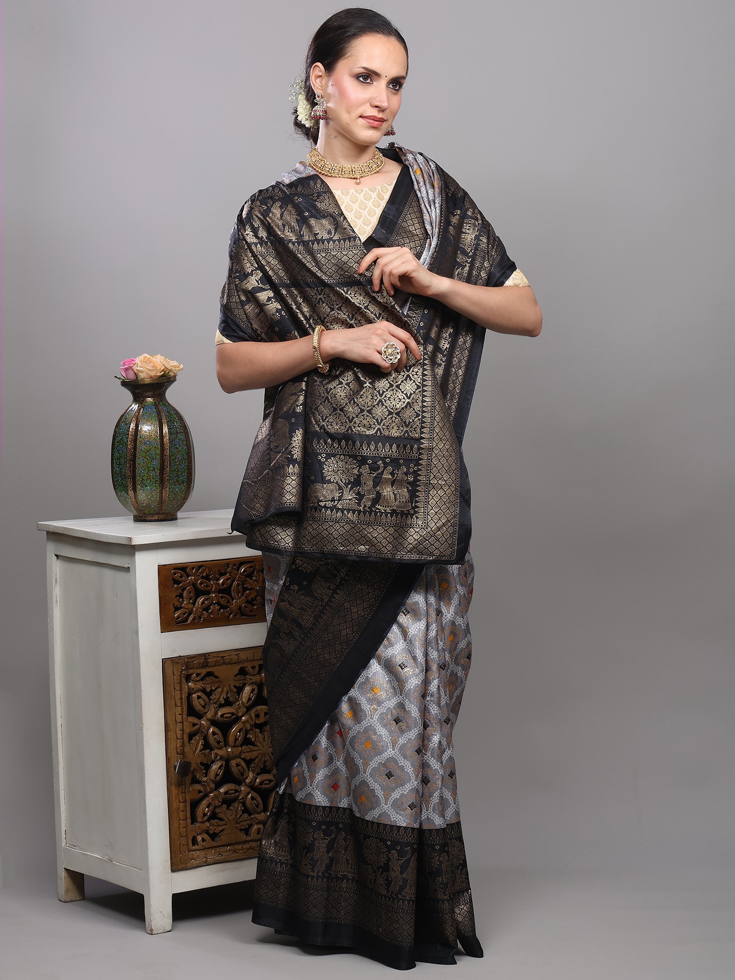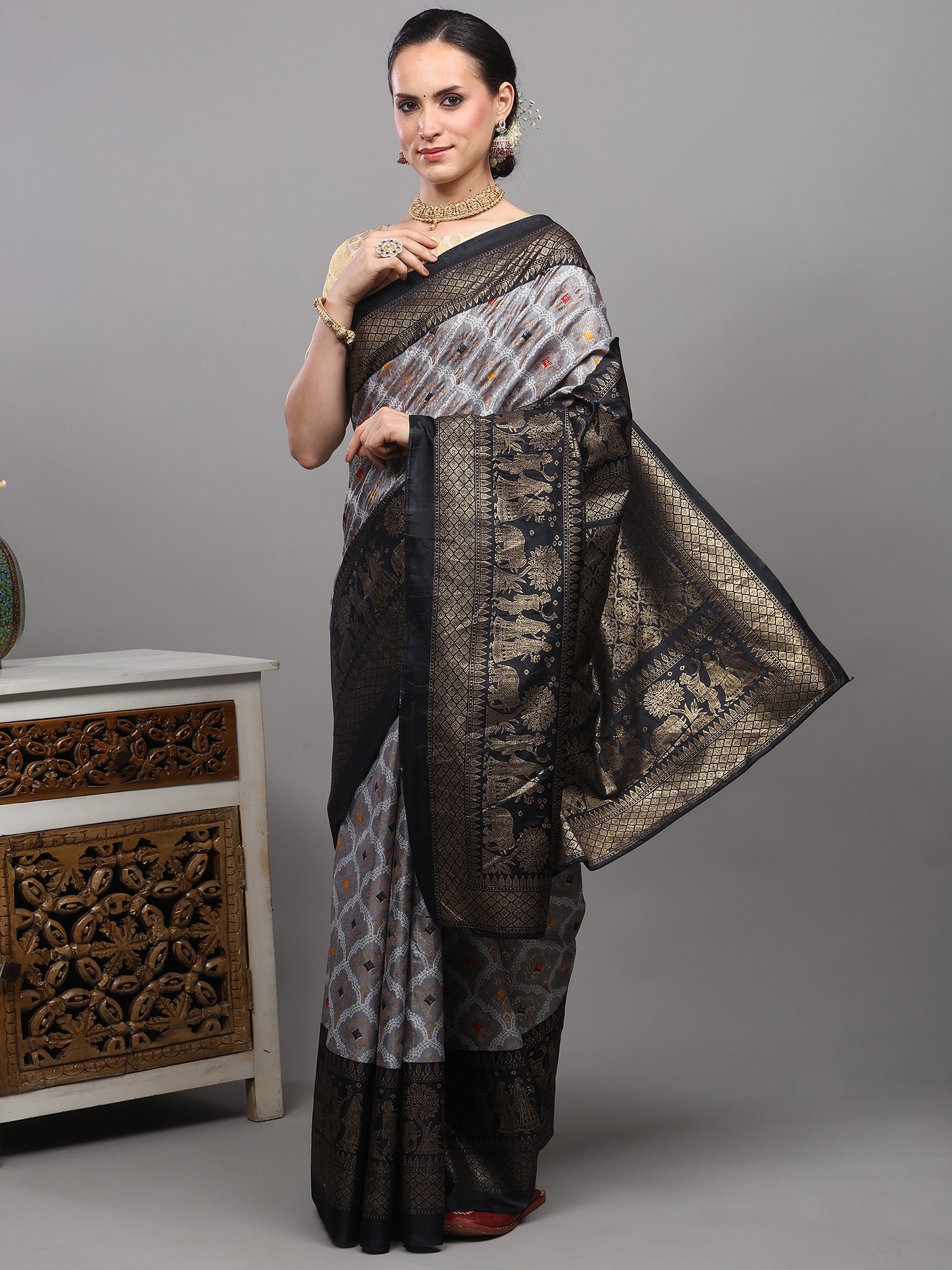 Platinum-Grey Pure Silk Saree with Zari woven Bootis and Contrast Border-Anchal from Bangalore