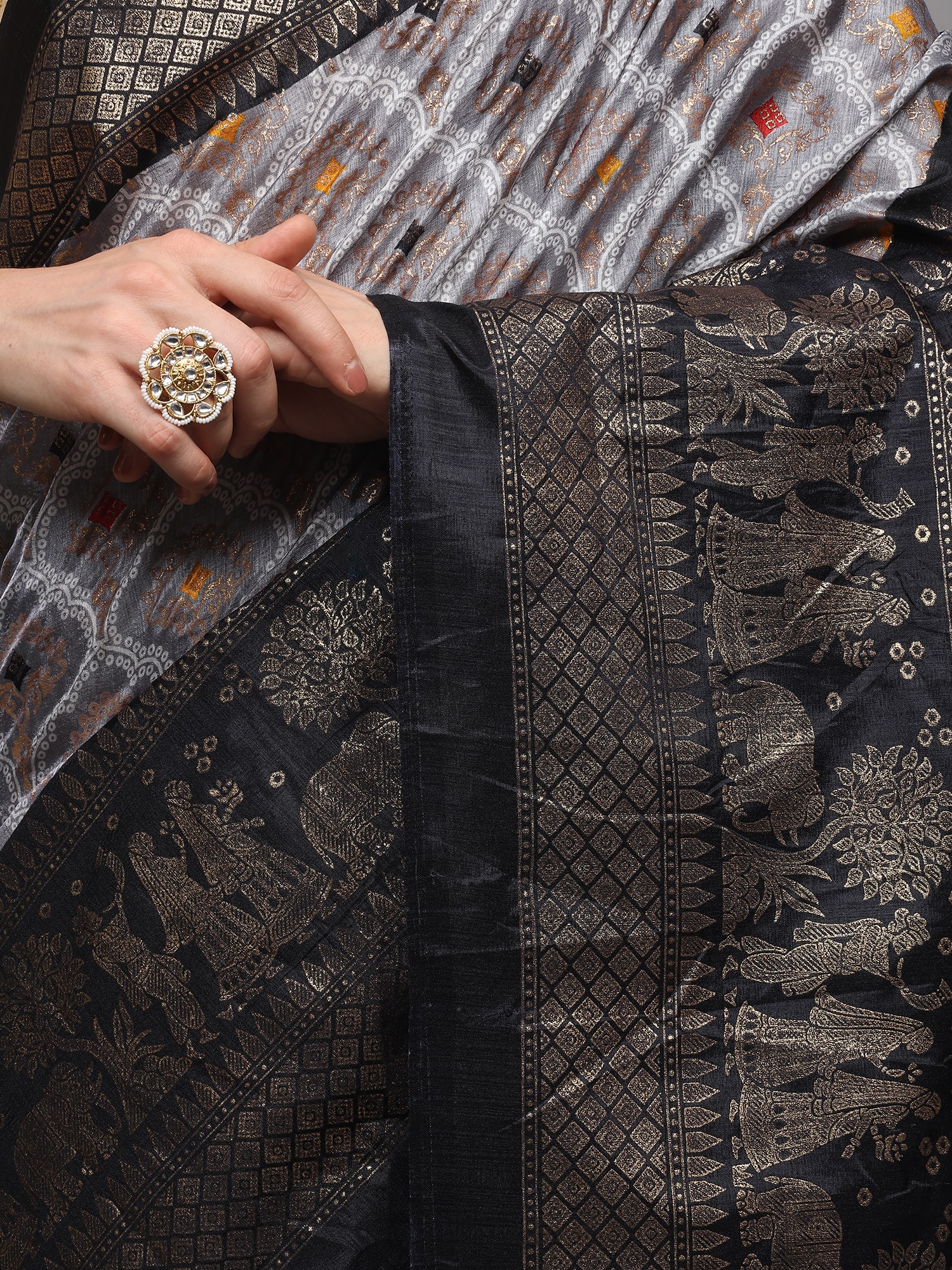 Grey Chettinadu Pure Cotton Saree With Elephant Motif Border And Butti Pattern Black Blouse