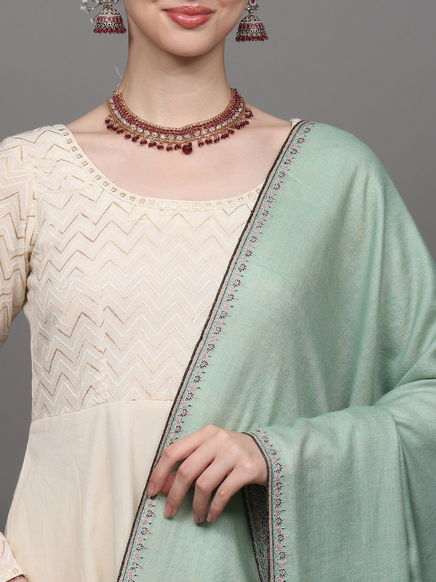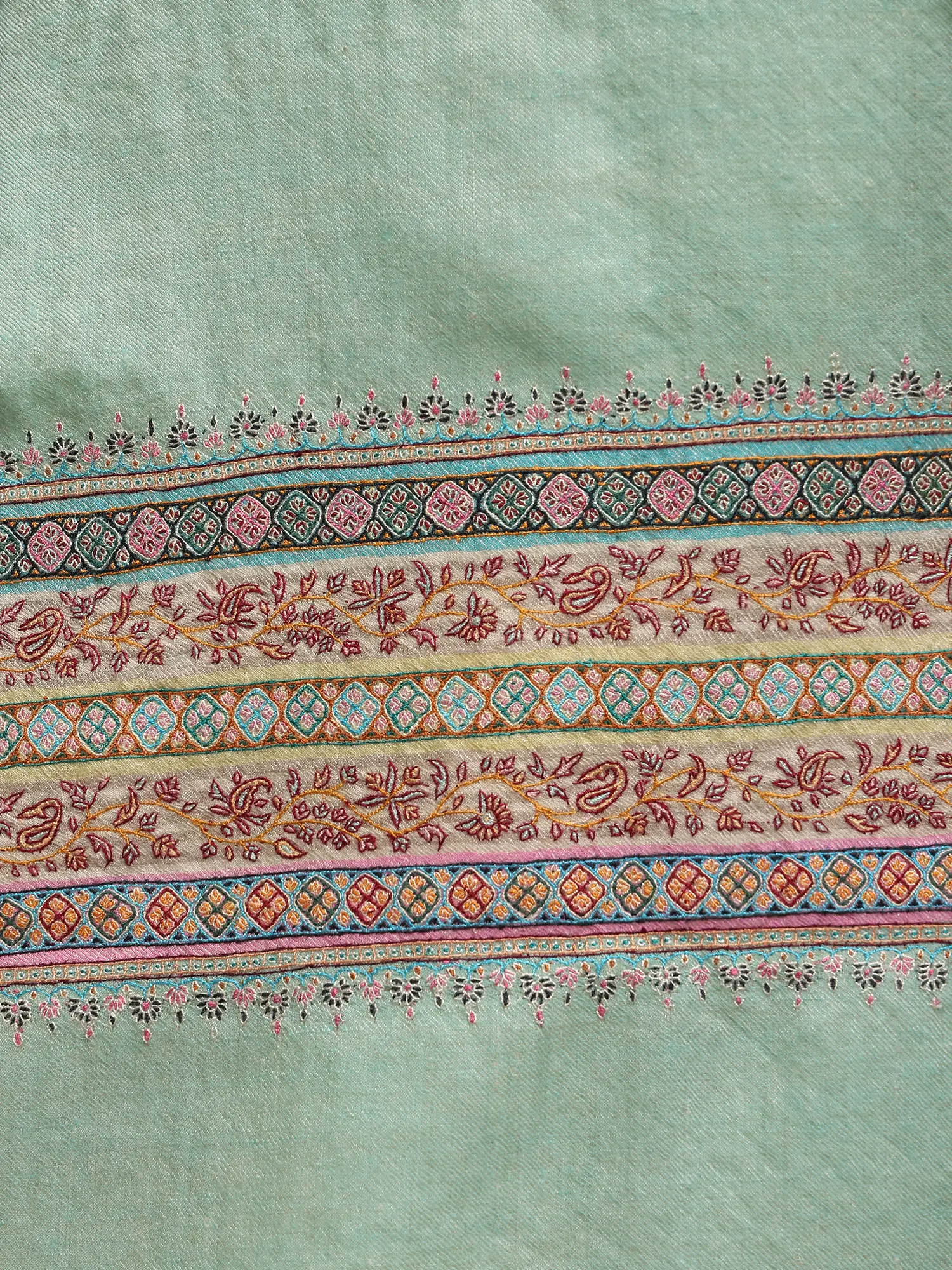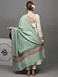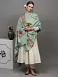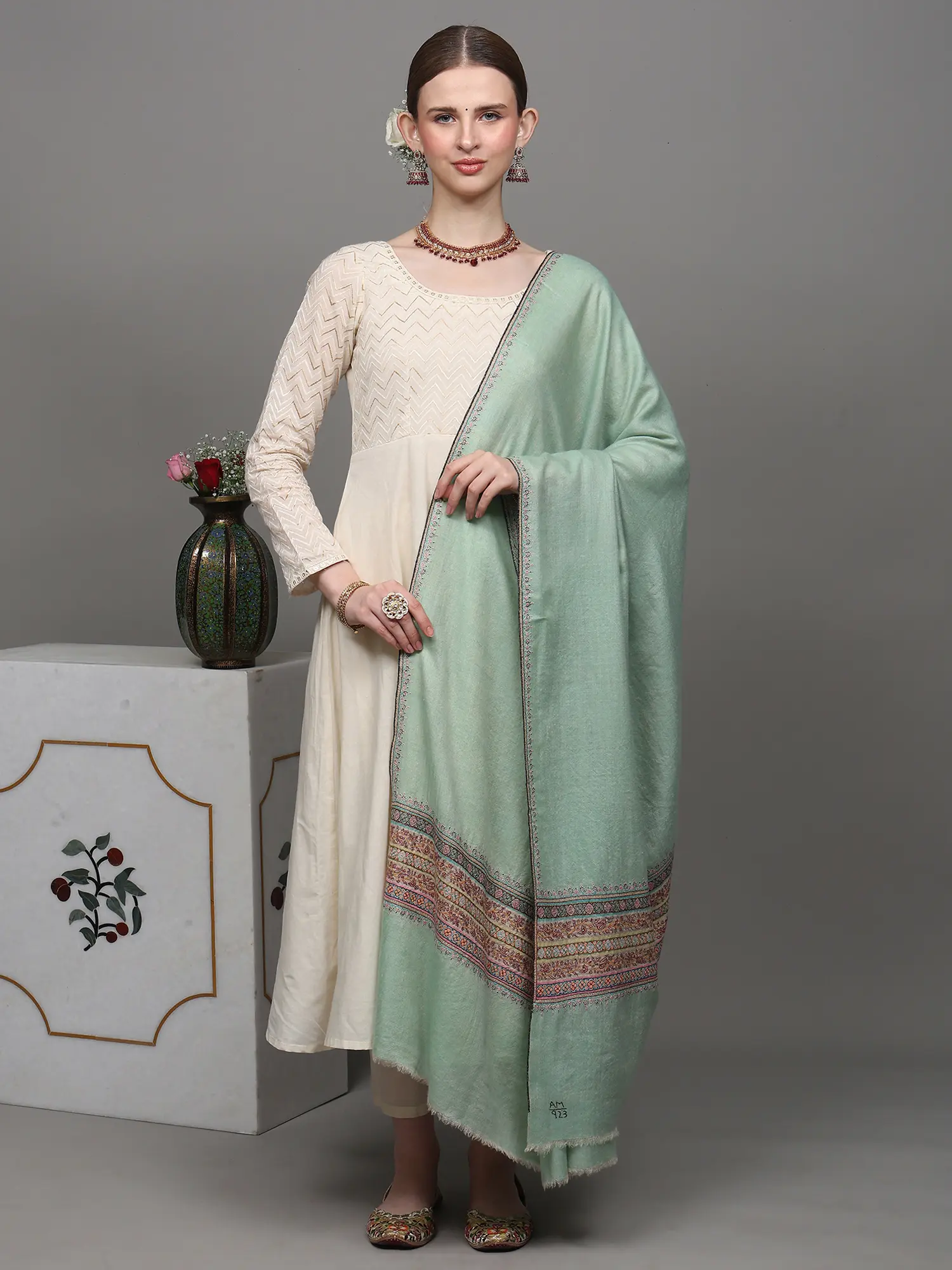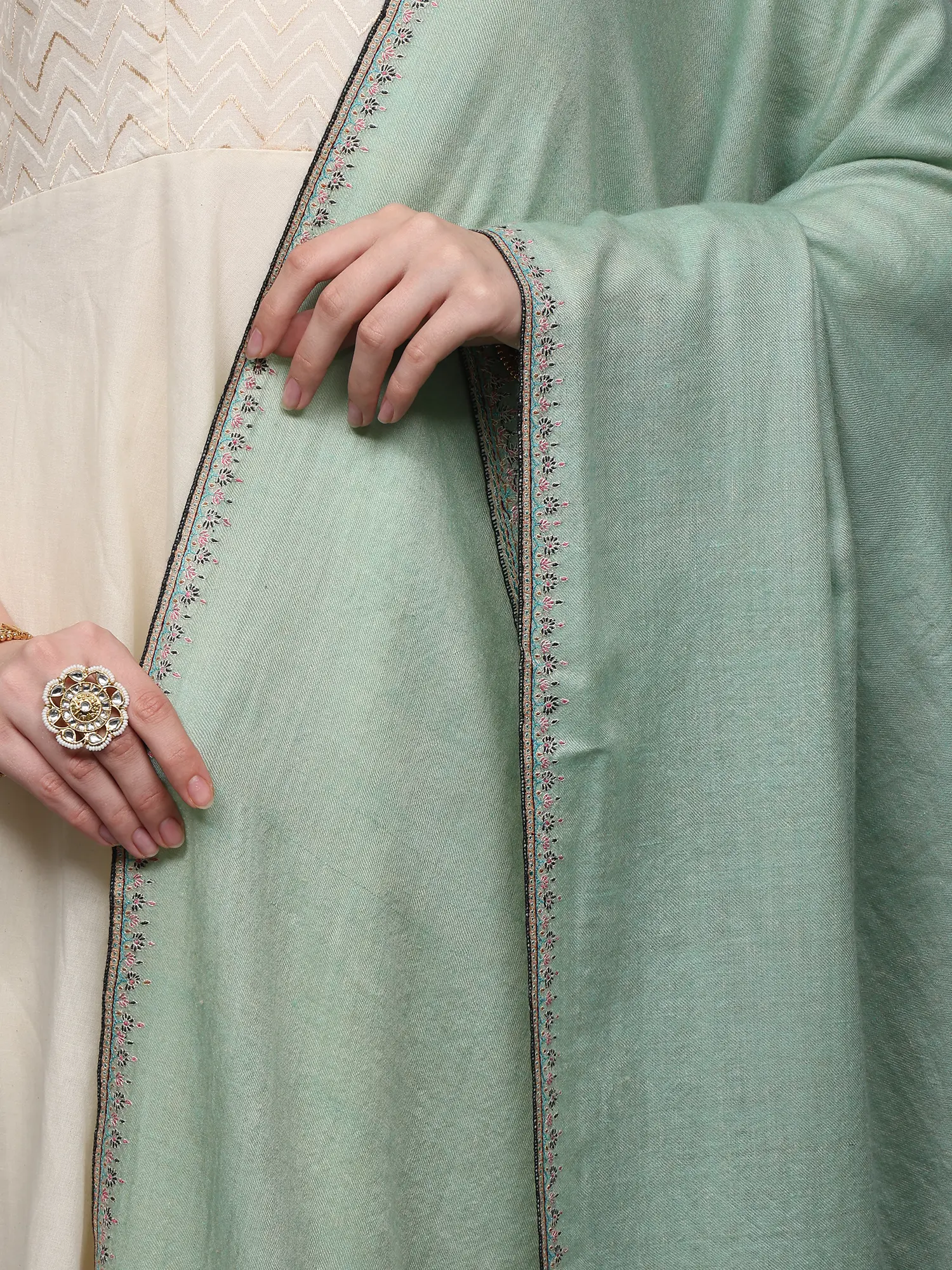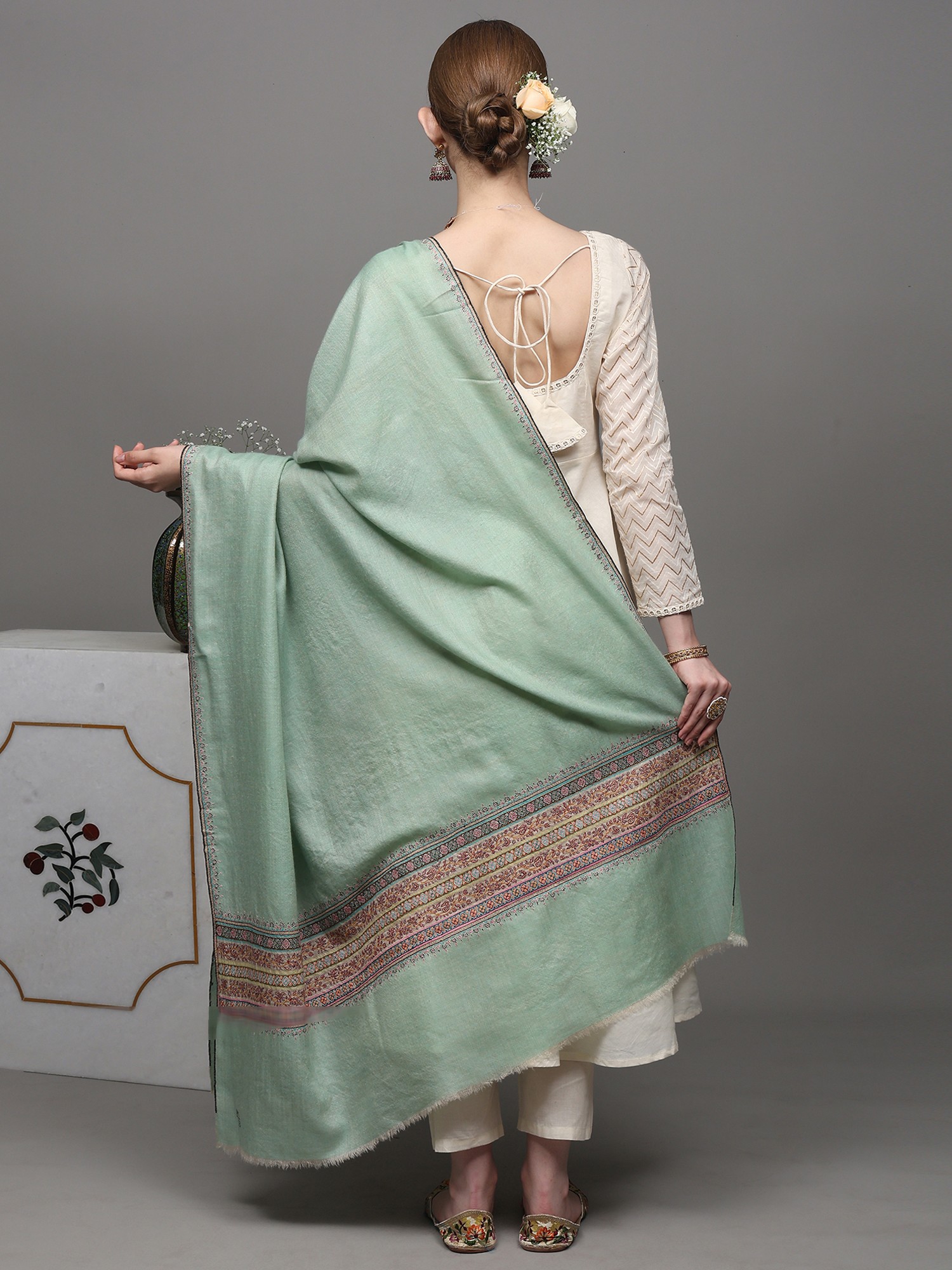 This “Pashmina Shawl”, a whisper of opulence draped in ethereal mist, captivates the senses with its unparalleled beauty. Crafted from the finest Cashmere, it embraces you like a gentle whisper of the Himalayan breeze. Its ethereal mist-green hue dances with the essence of spring, and the delicate embroidery along the border is a tribute to artisanal mastery, each thread a stroke of artistry. Draping it around your shoulders, you become an enchantress, a siren of style. The shawl is a sanctuary of warmth and luxury, where comfort meets sophistication. In its embrace, you are not just adorned; you are a canvas painted with the hues of refinement.