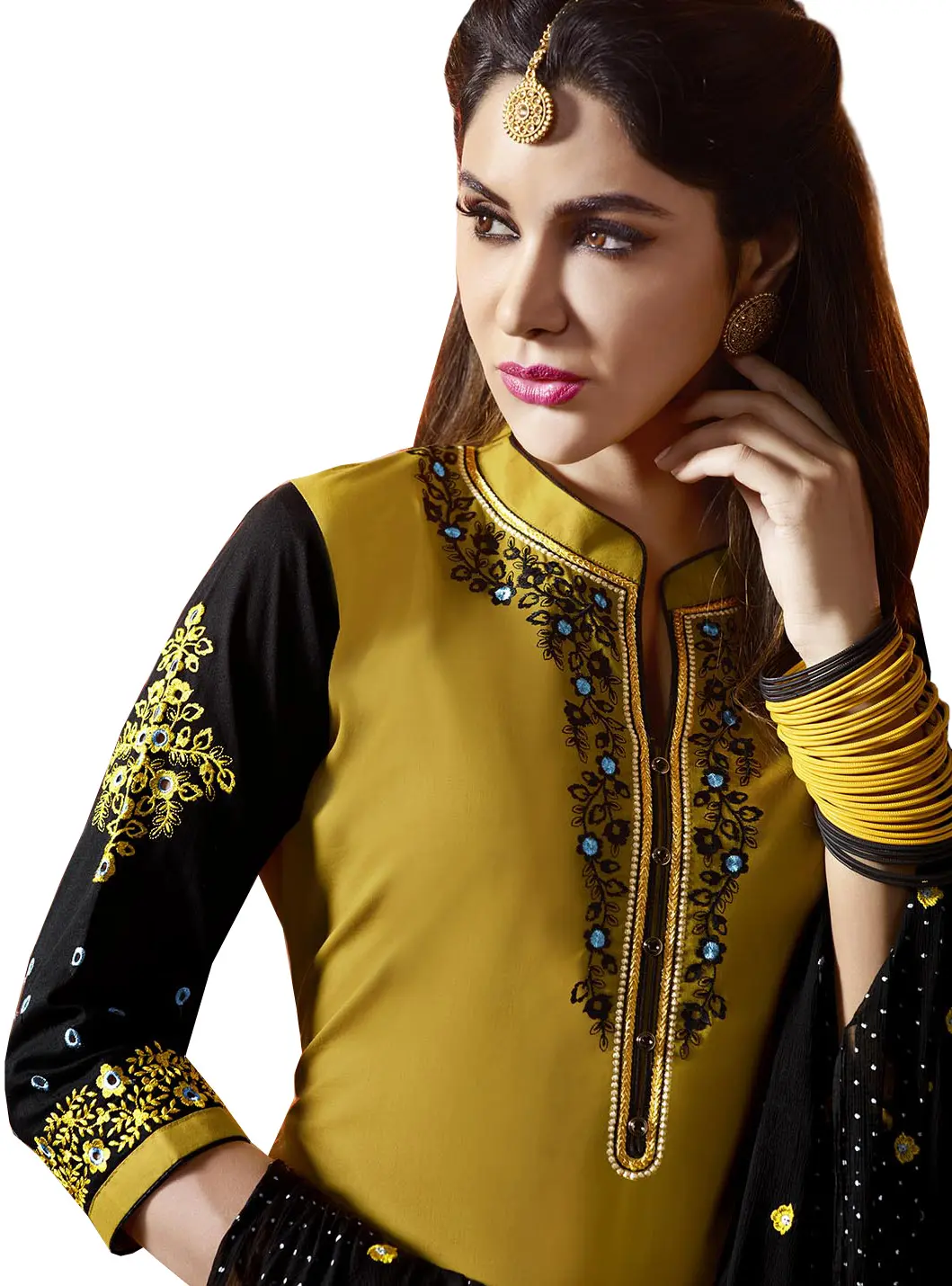 Misted-Yellow and Black Embroidered Patiala Salwar Kameez Suit with Printed Chiffon Dupatta