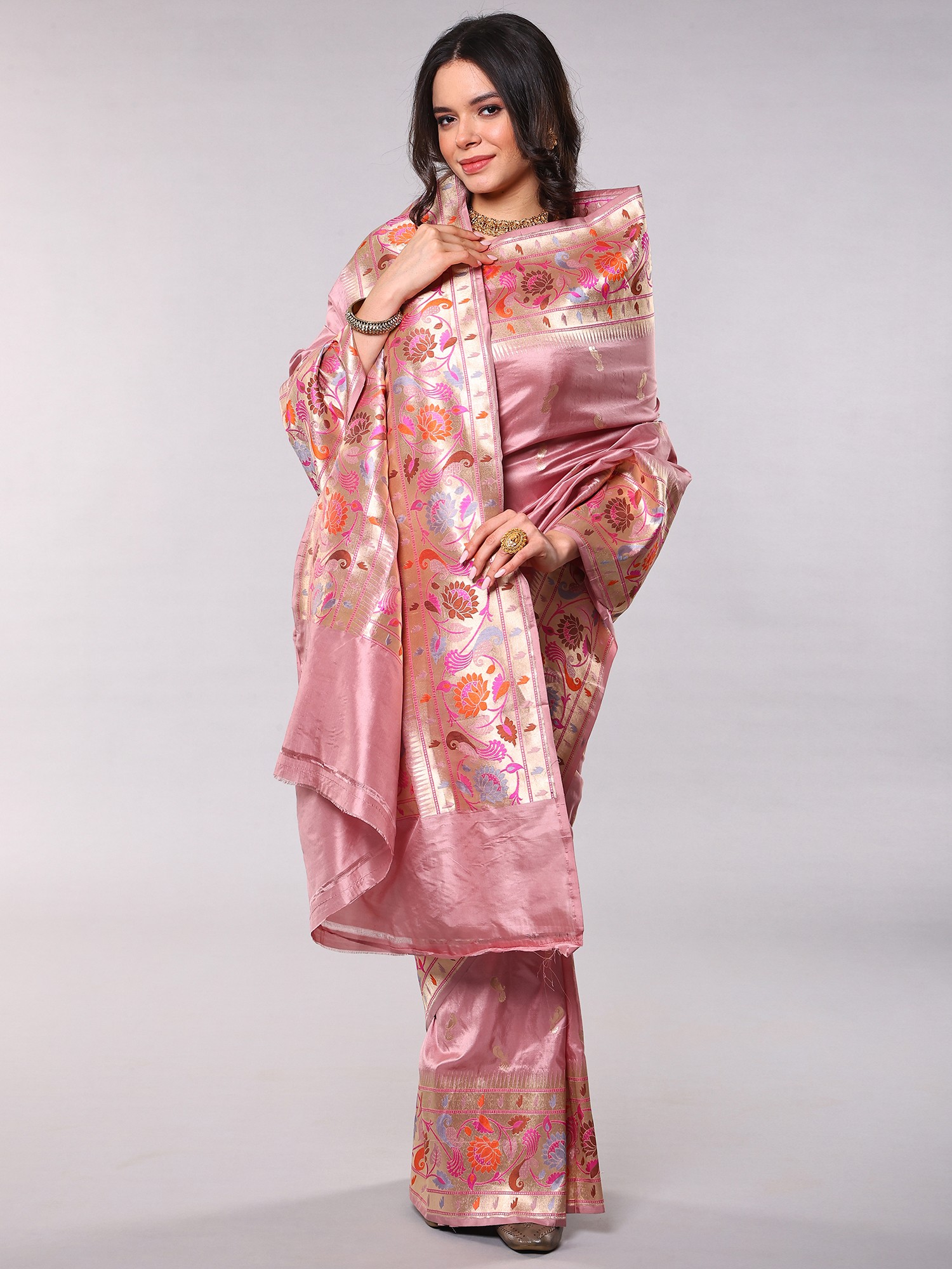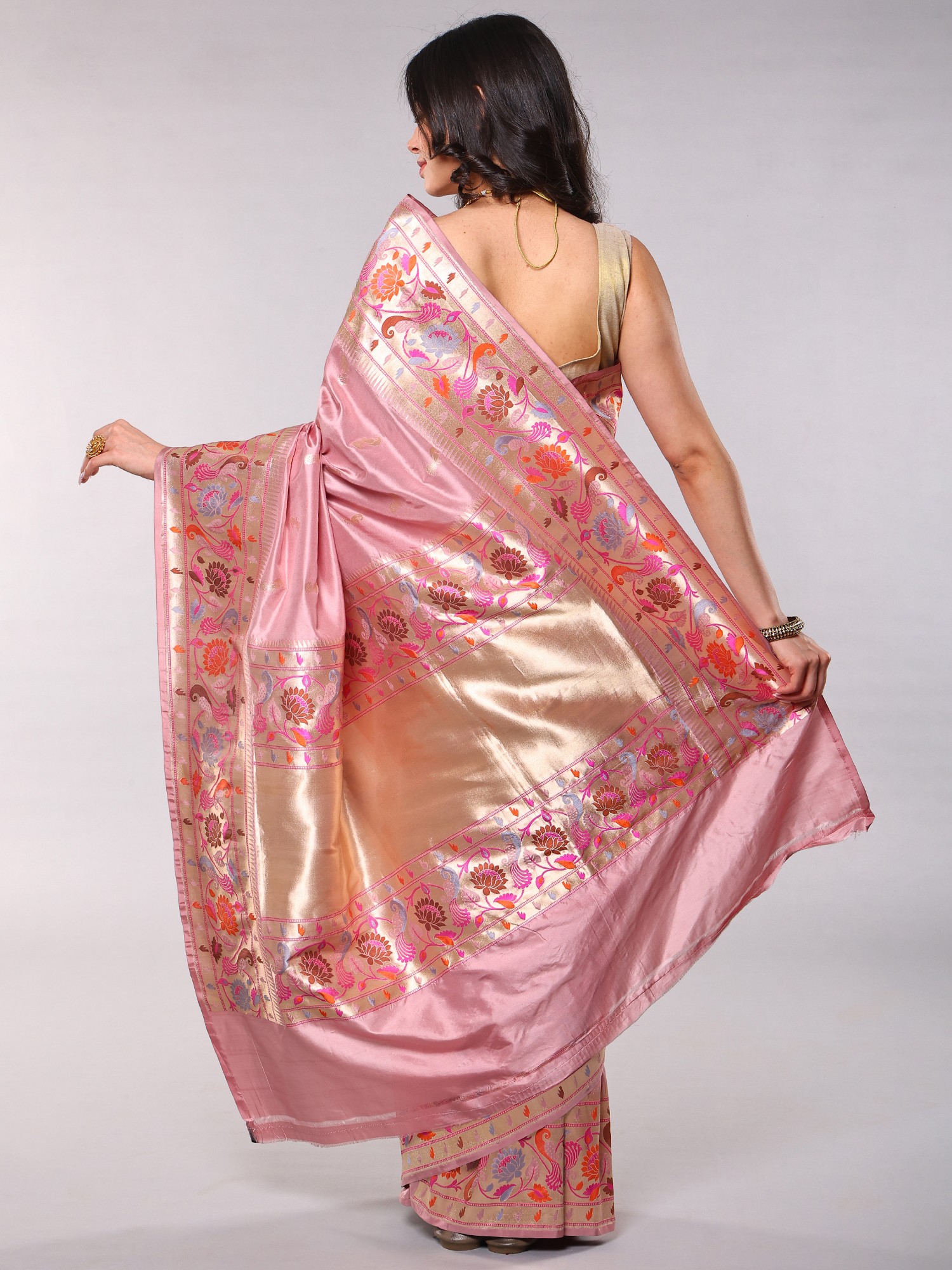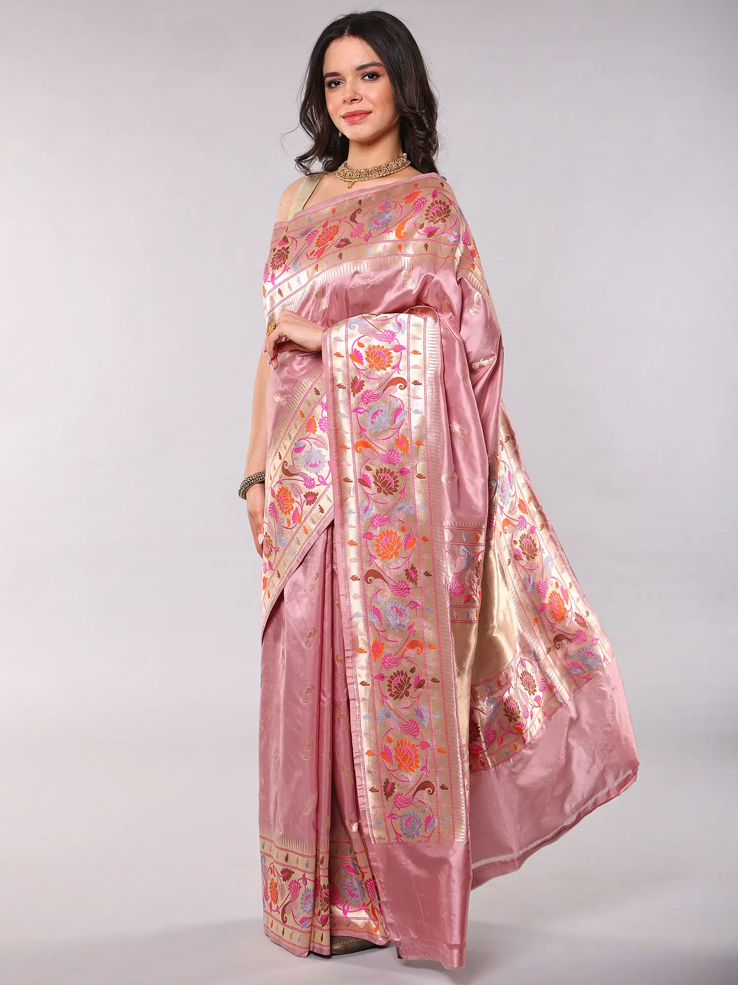 Vintage Pink Pure Silk Paithani Saree with Lavender Zari Border Traditional Big Mor Butta and Mor Kunda Motifs