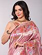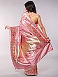 The soft, misty-rose hue provides a delicate canvas for the opulent golden embellishments. You'll appreciate the mesmerizing all-over golden thread work that shimmers with every movement, catching the light and drawing the eye. The border and pallu are adorned with motifs of majestic peacocks, rendered in vibrant threads that contrast beautifully with the silk. This rich detailing creates a visual symphony, making each viewing a new discovery of its exquisite artistry.