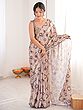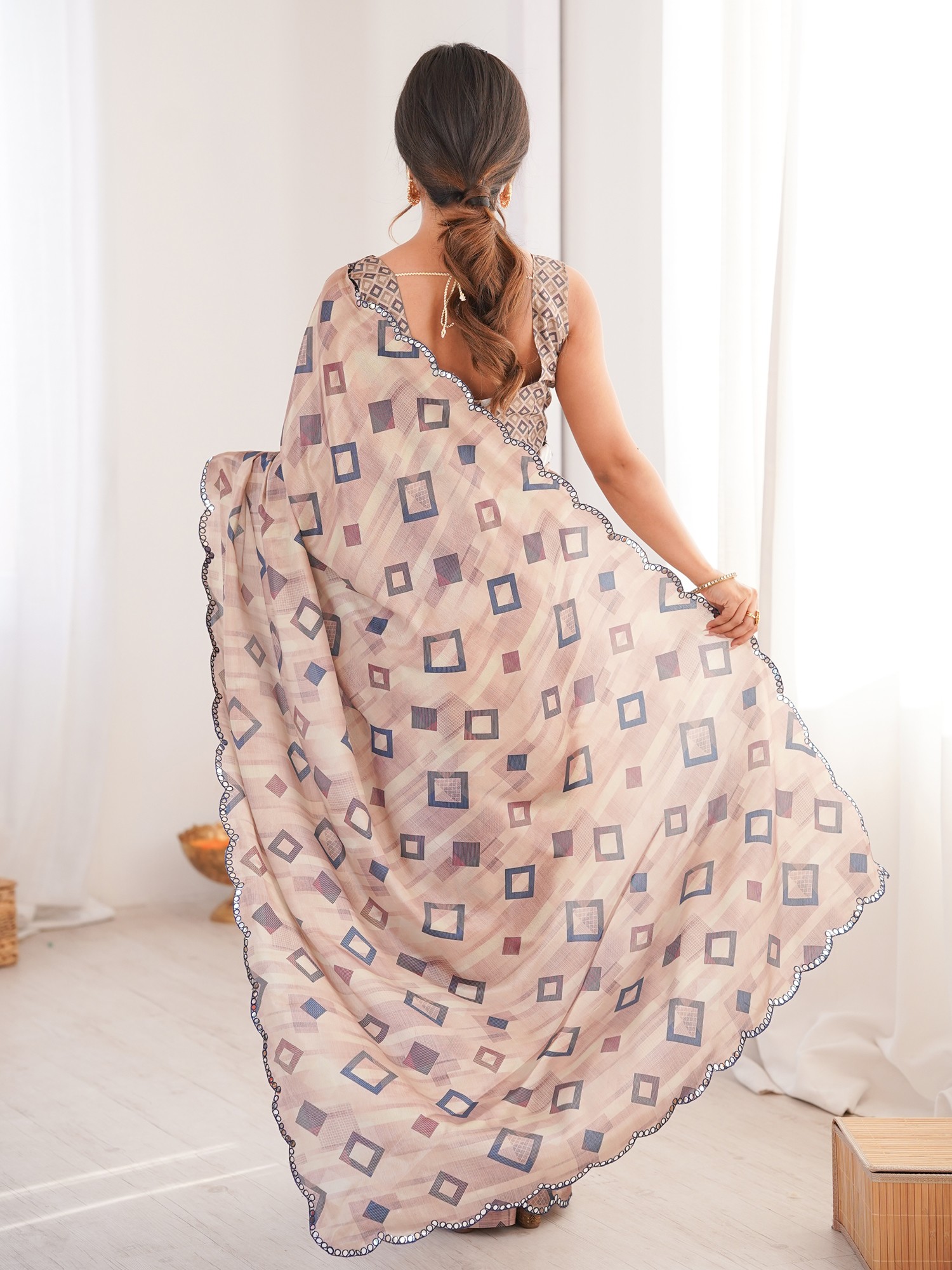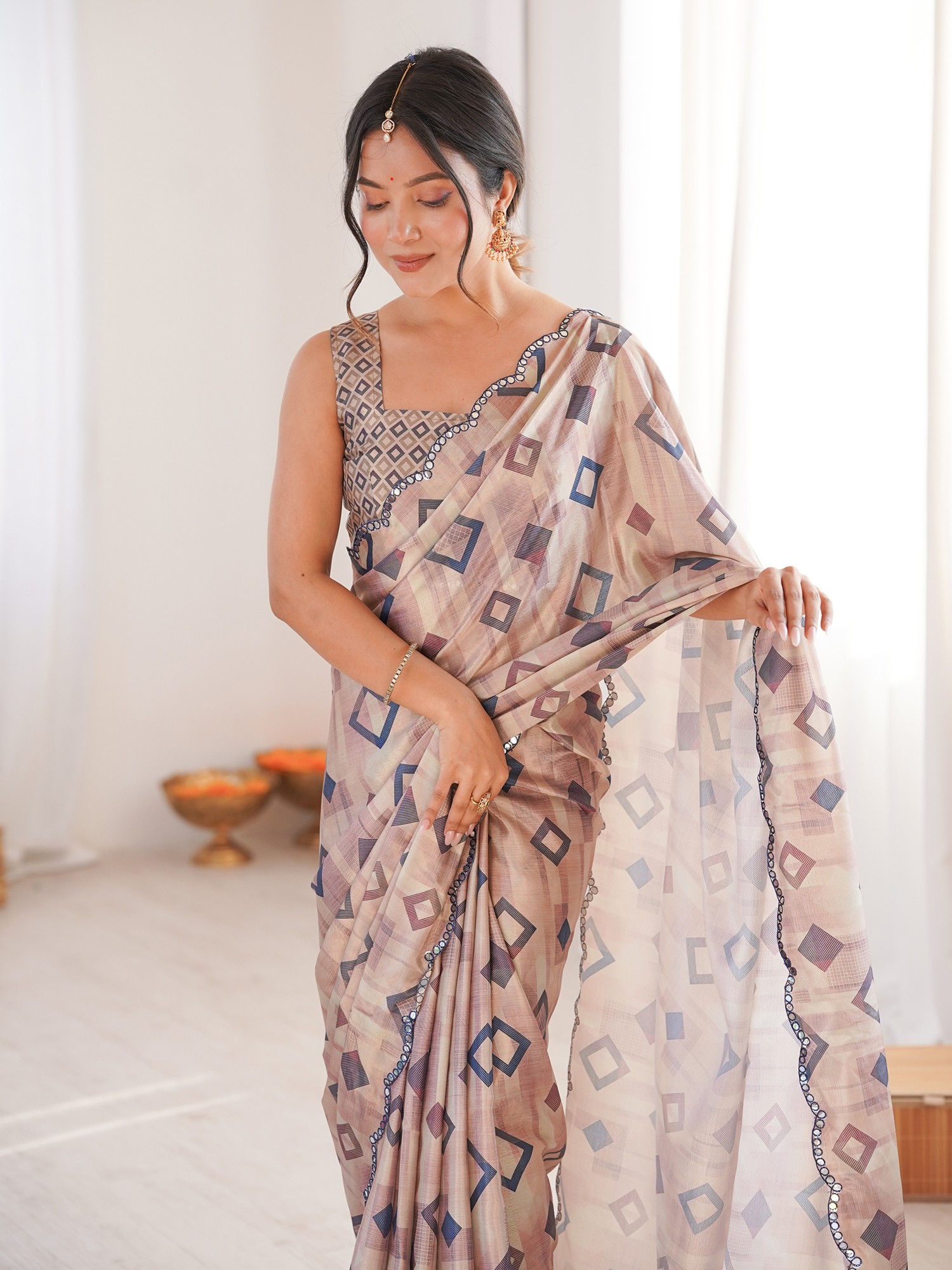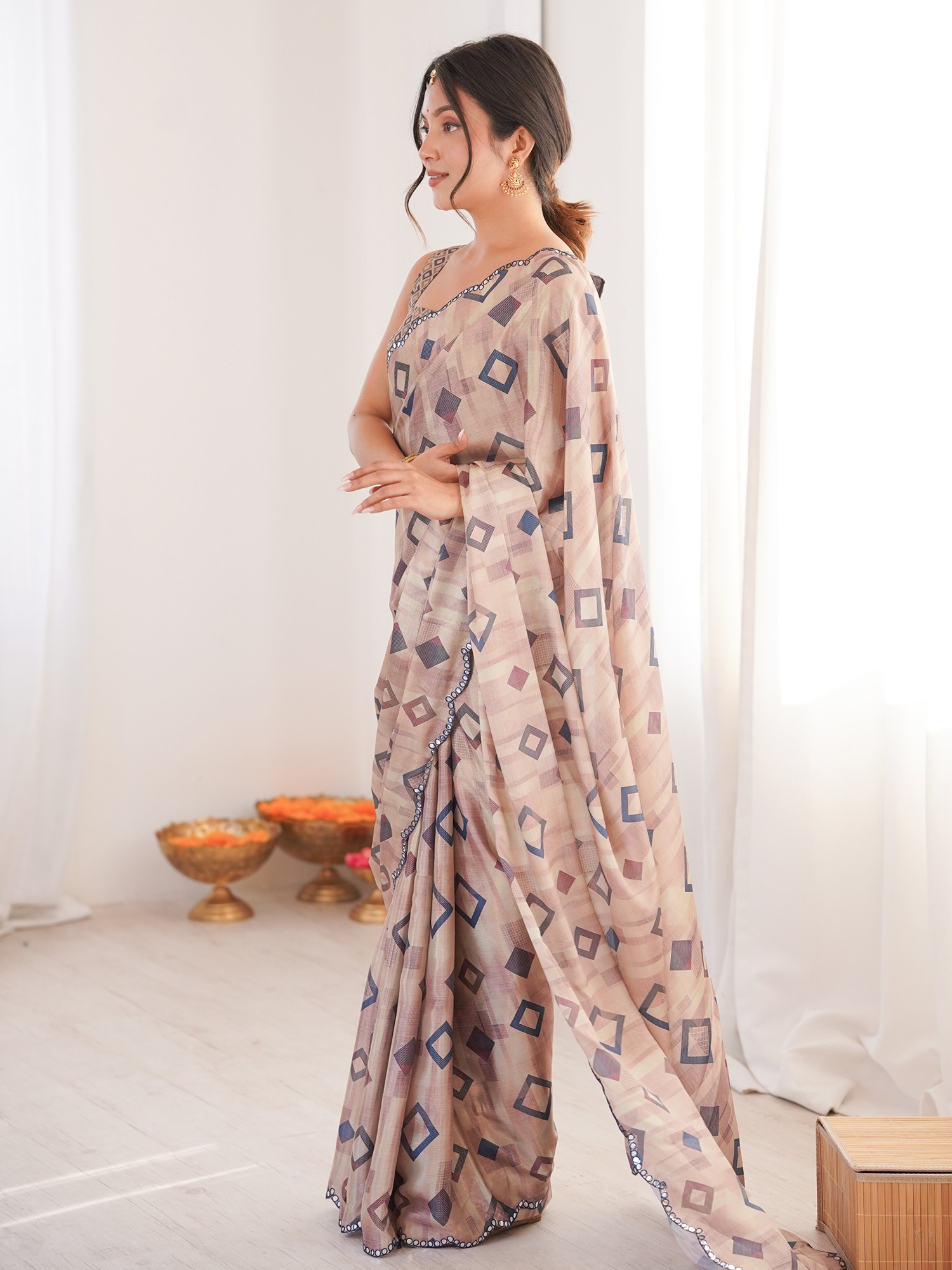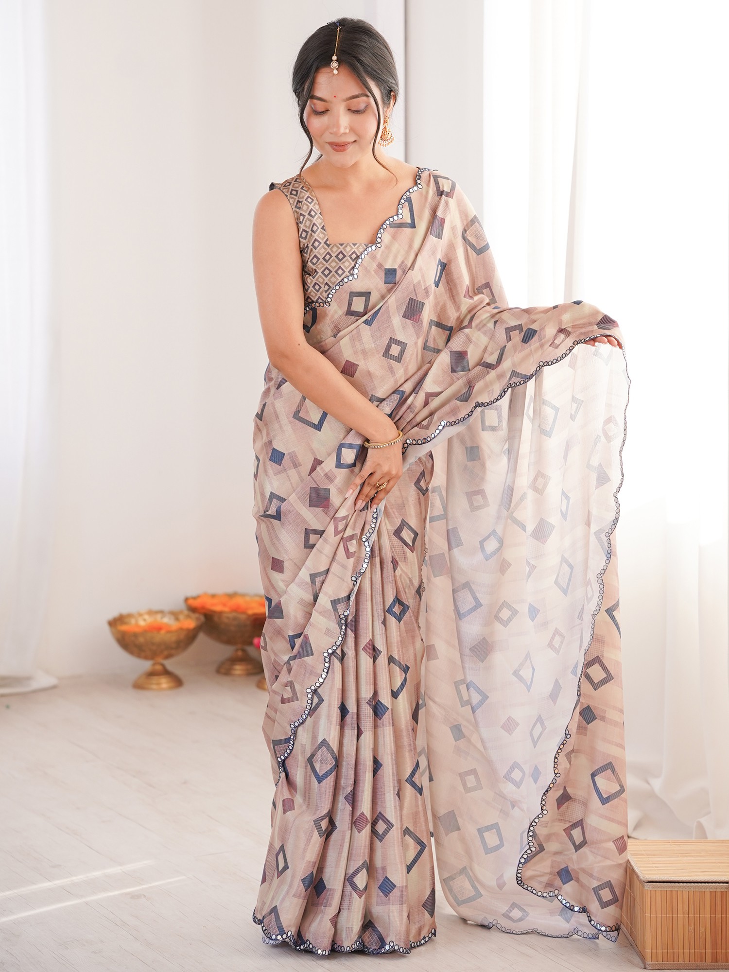 Modern Geometric Print Chinon Saree With Mirror Cut Work Ideal For Festive And Party Wear Elegant Traditional Saree For Women