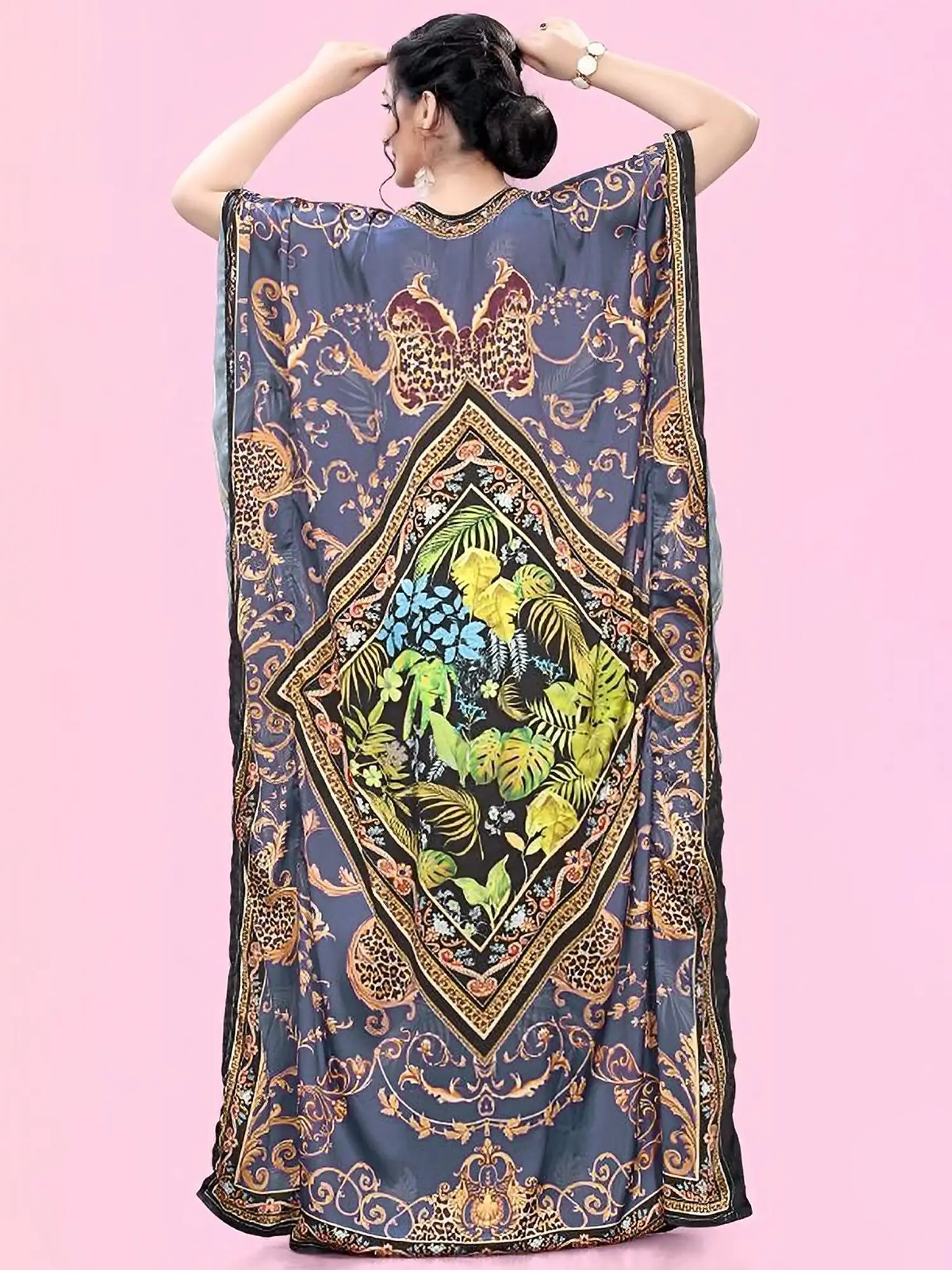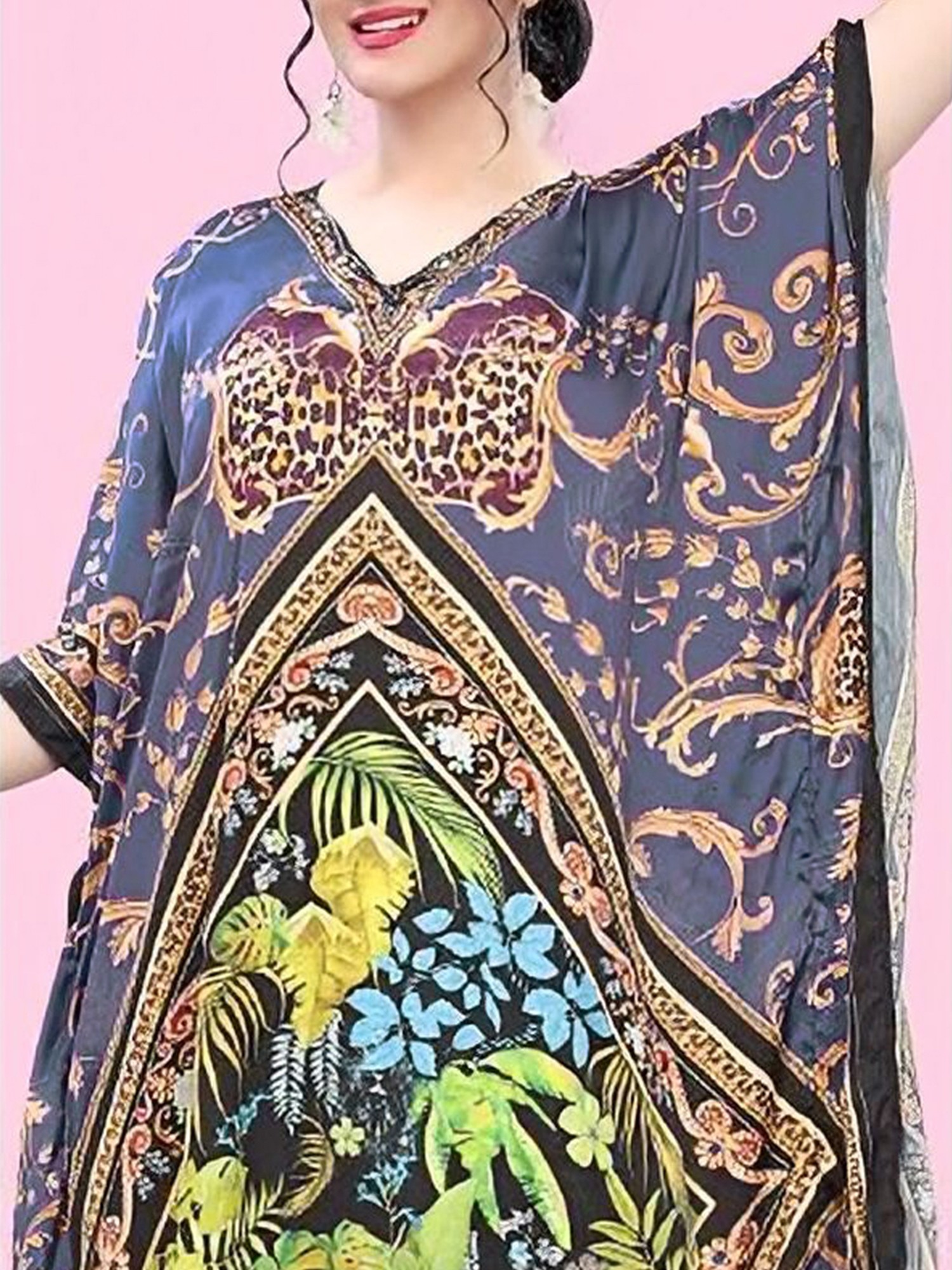 Multi-Color Printed V-neck Long Kaftan with Internal Drawstring