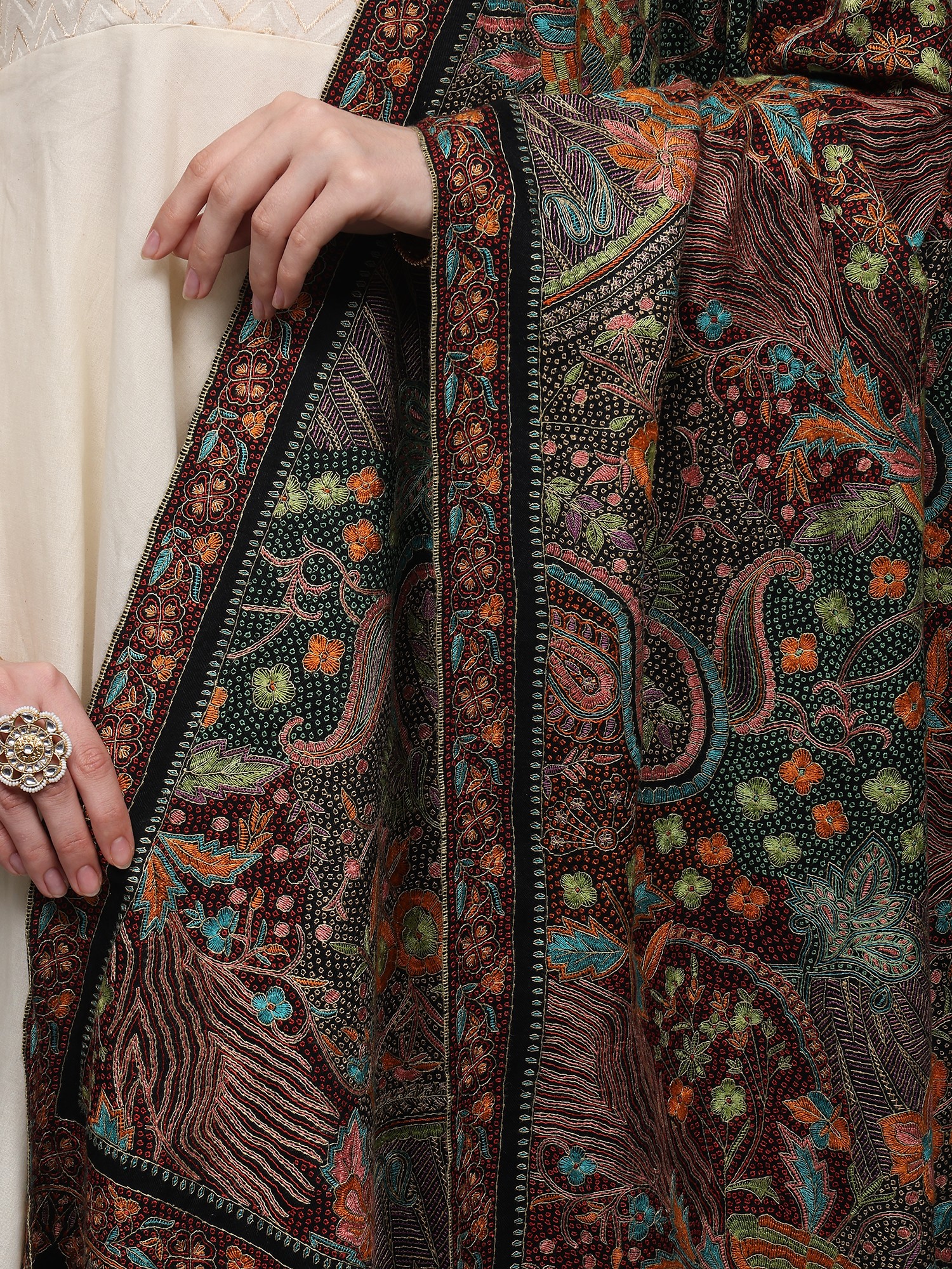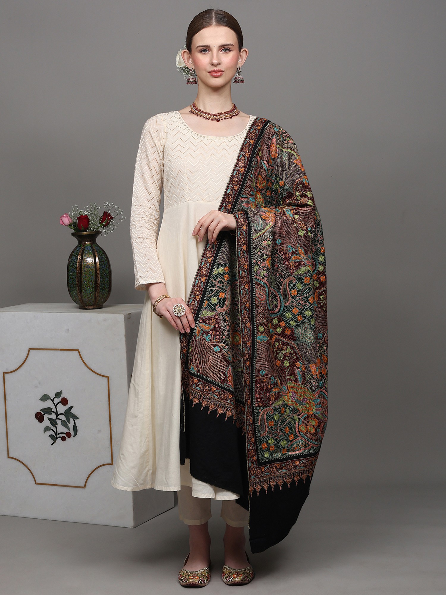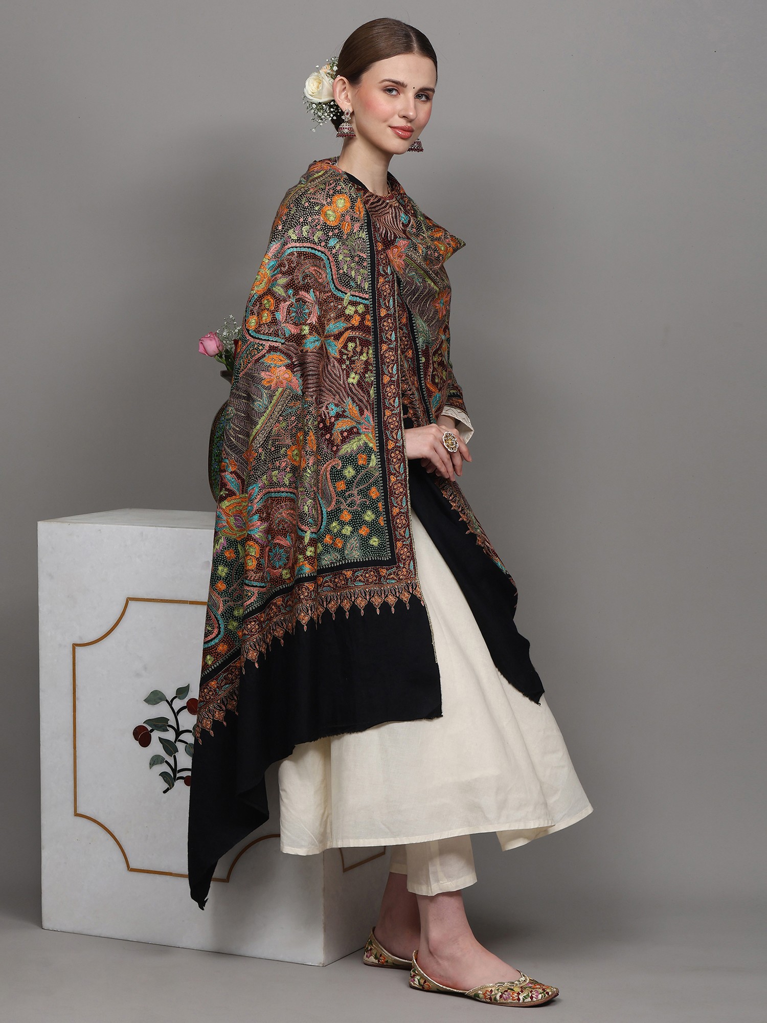 The luxurious allure of this Pashmina Moonless Night shawl is blinding as the shawl is a work of artisanship. Made from the finest Pashmina weave and Jamawar fine work, the shawl is a polyphony of details. A thick embroidery displays a multicolored range of hyacinth, yemberzal (narcissus), daisies, and beautiful paisley motifs. Lustrous multicolored silk threads convert into live landscapes on this woolen canvas. The brown, earthy, and greenish lush background might be confused as a painting is stitched into the fabric. It is one of the finest examples of needlework displayed by any craftsman. Also, the flowers are brought to life by vivid red, yellow, and pink threads. It is a wearable work of art that provides warmth with a tribute to the diversity of colorful nature.