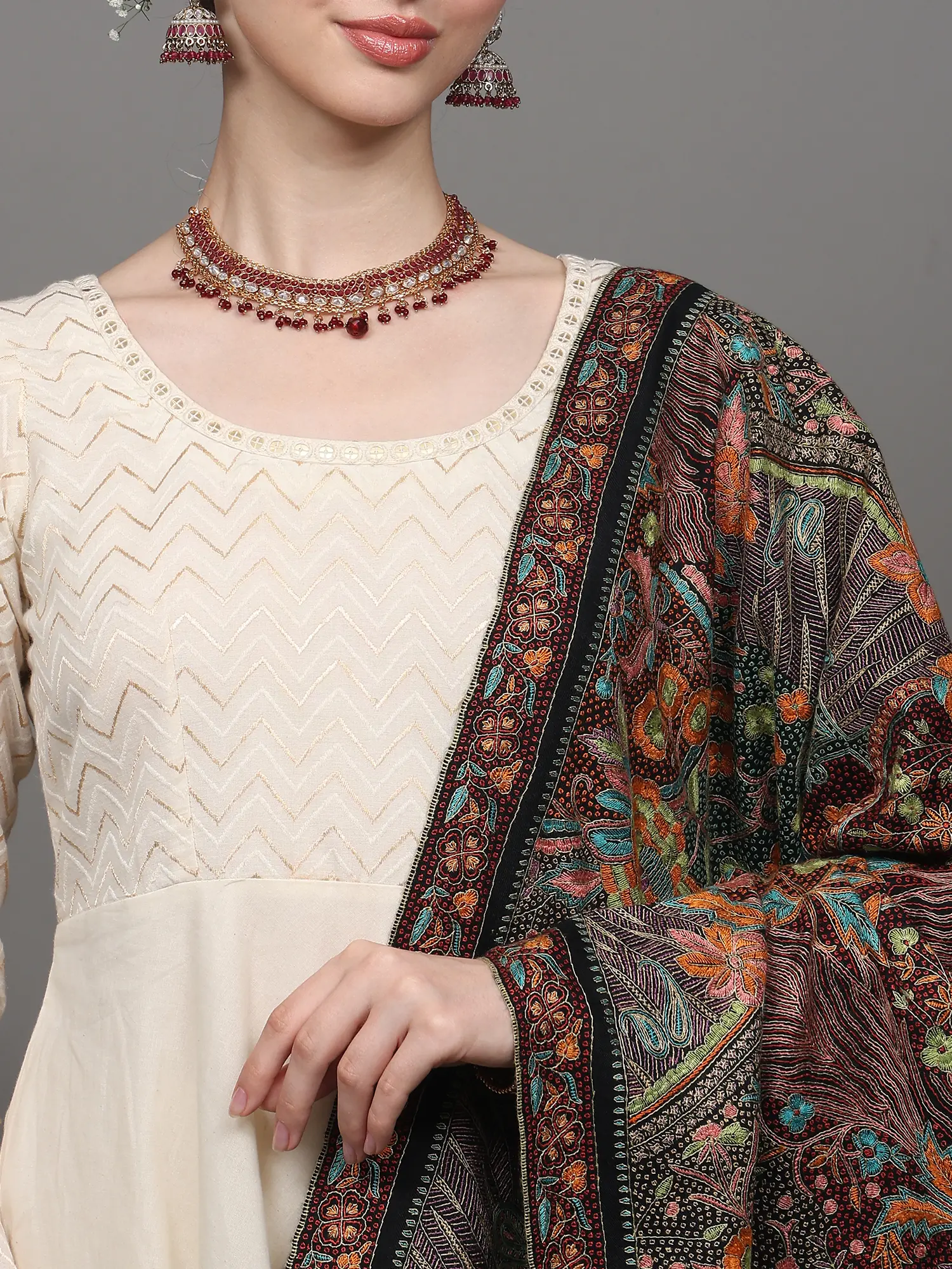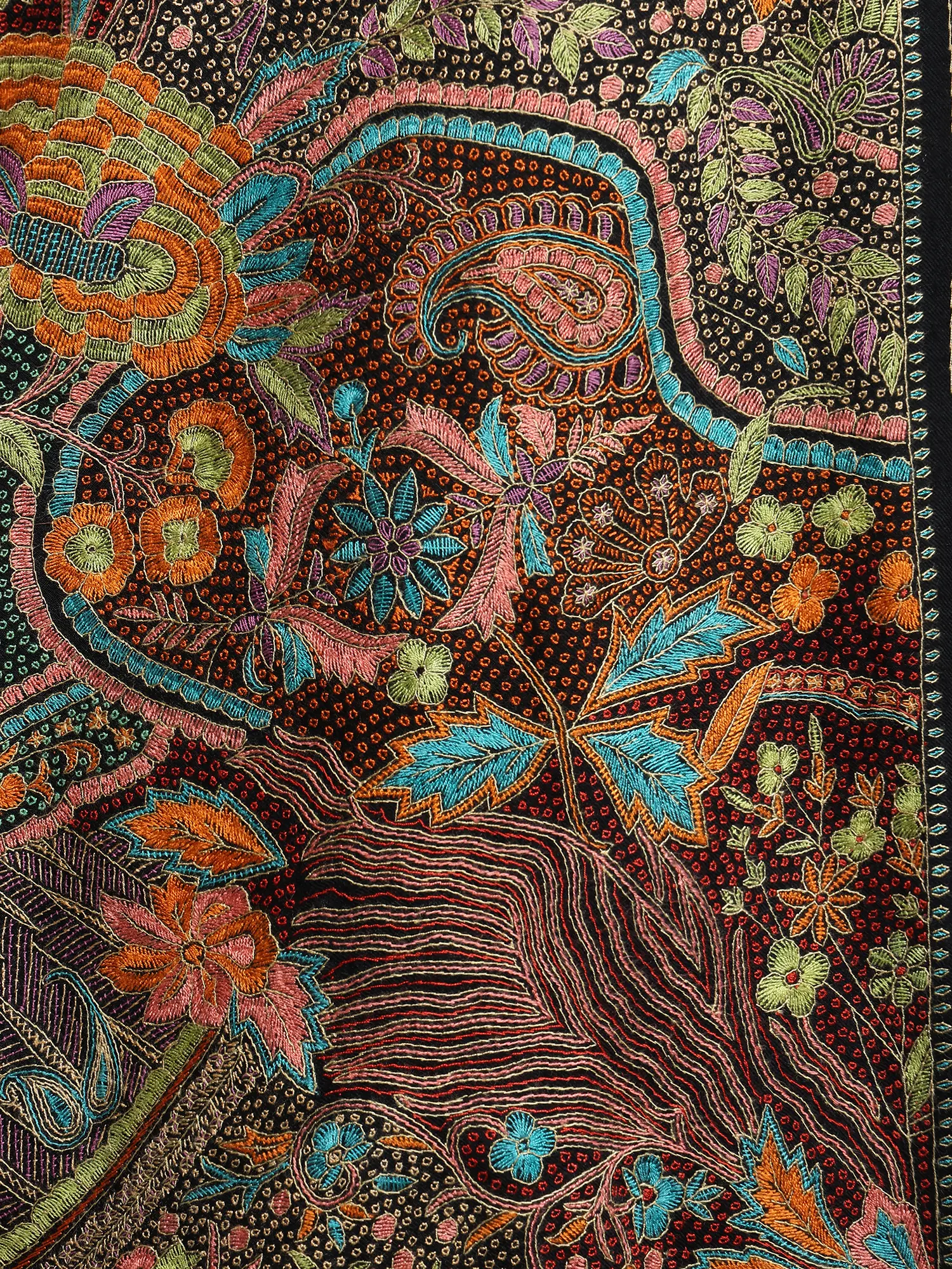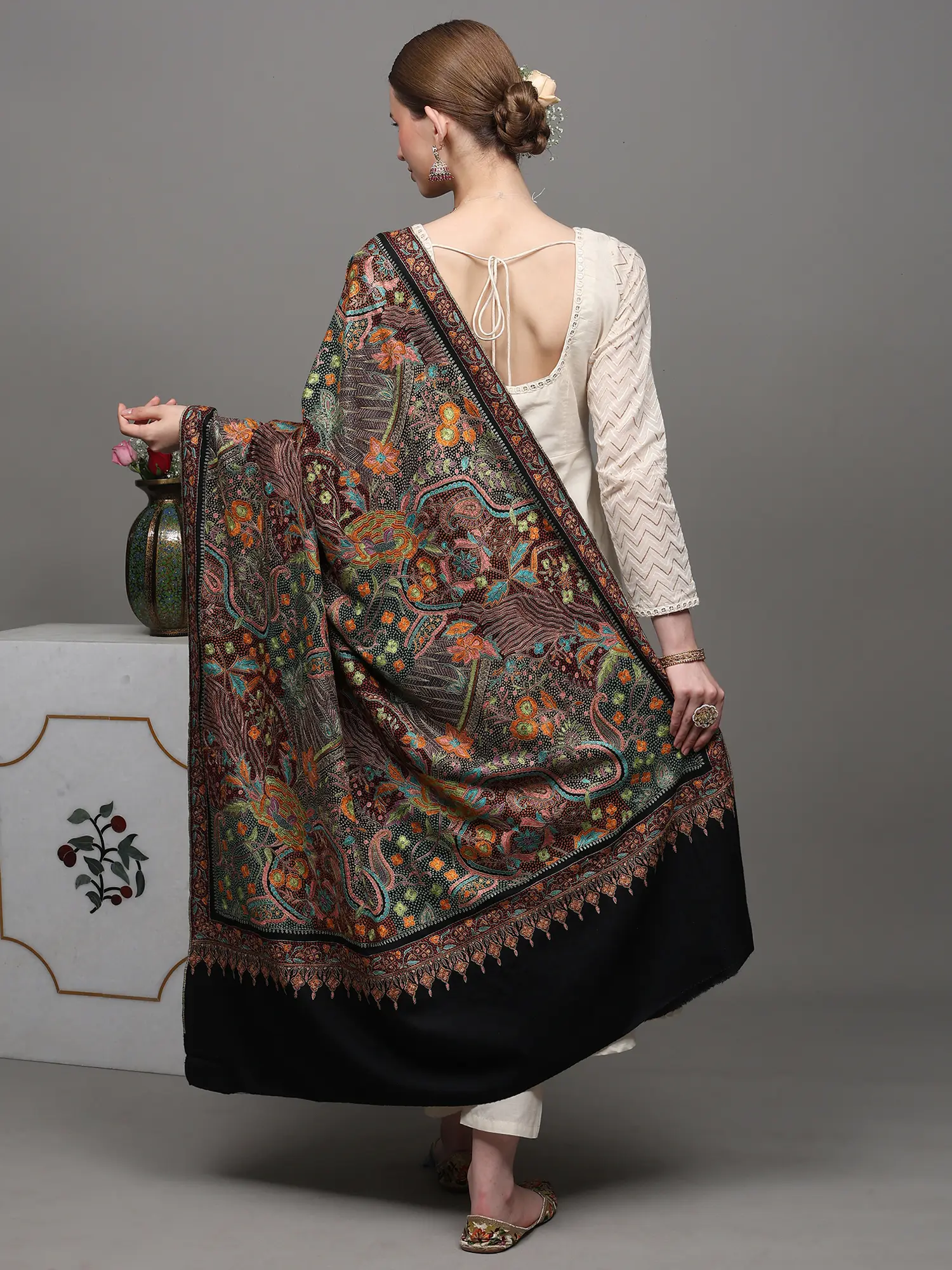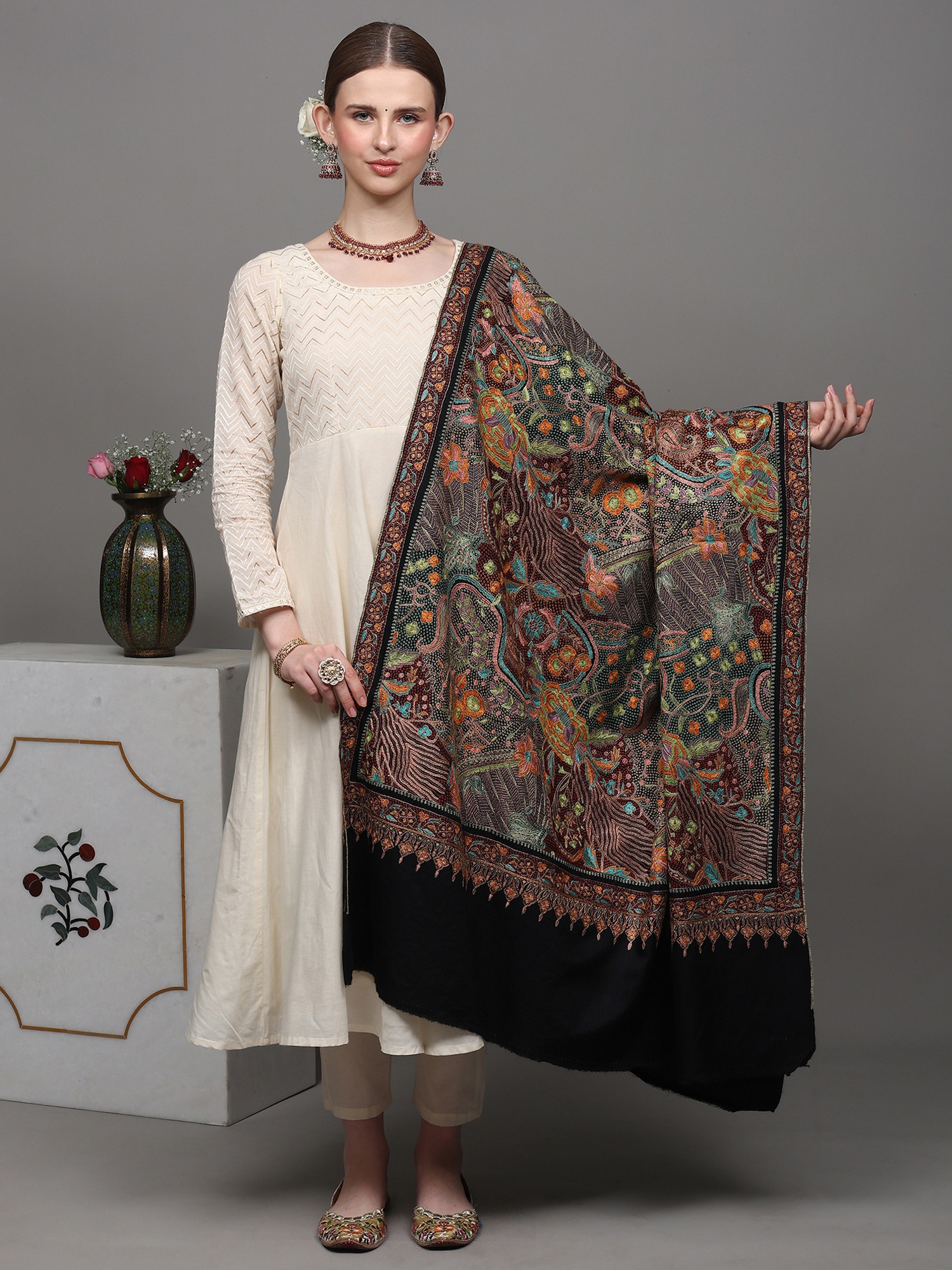 The luxurious allure of this Pashmina Moonless Night shawl is blinding as the shawl is a work of artisanship. Made from the finest Pashmina weave and Jamawar fine work, the shawl is a polyphony of details. A thick embroidery displays a multicolored range of hyacinth, yemberzal (narcissus), daisies, and beautiful paisley motifs. Lustrous multicolored silk threads convert into live landscapes on this woolen canvas. The brown, earthy, and greenish lush background might be confused as a painting is stitched into the fabric. It is one of the finest examples of needlework displayed by any craftsman. Also, the flowers are brought to life by vivid red, yellow, and pink threads. It is a wearable work of art that provides warmth with a tribute to the diversity of colorful nature.