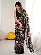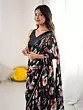 The fabric itself possesses a subtle sheen, allowing the intricately designed floral motifs to truly flourish. Against the profound black background, vibrant coral and delicate white blossoms intertwine with graceful greenery, creating a visual spectacle that is both bold and refined. You'll appreciate the delicate silver border that adds a touch of shimmer, framing the artistry perfectly.