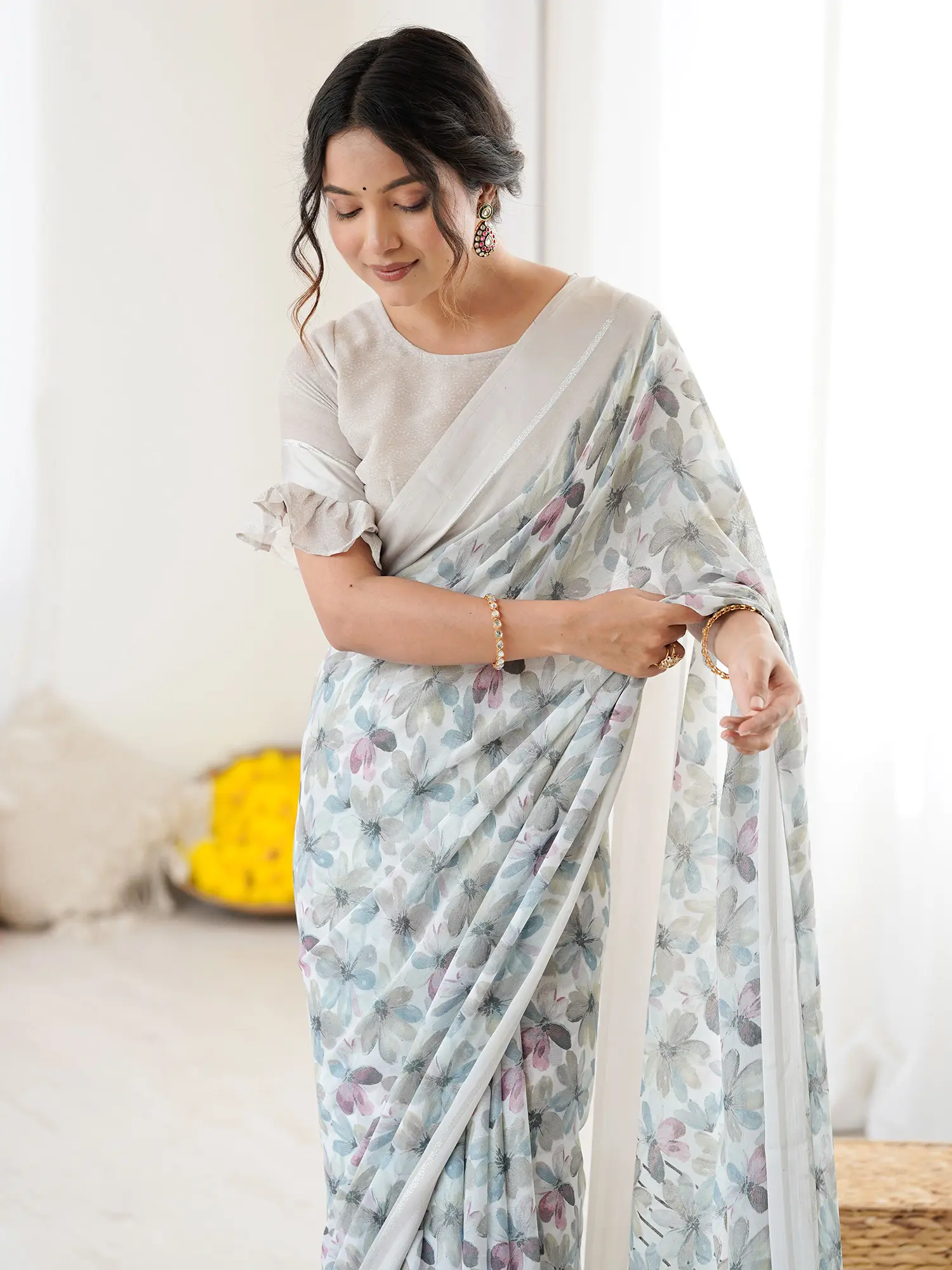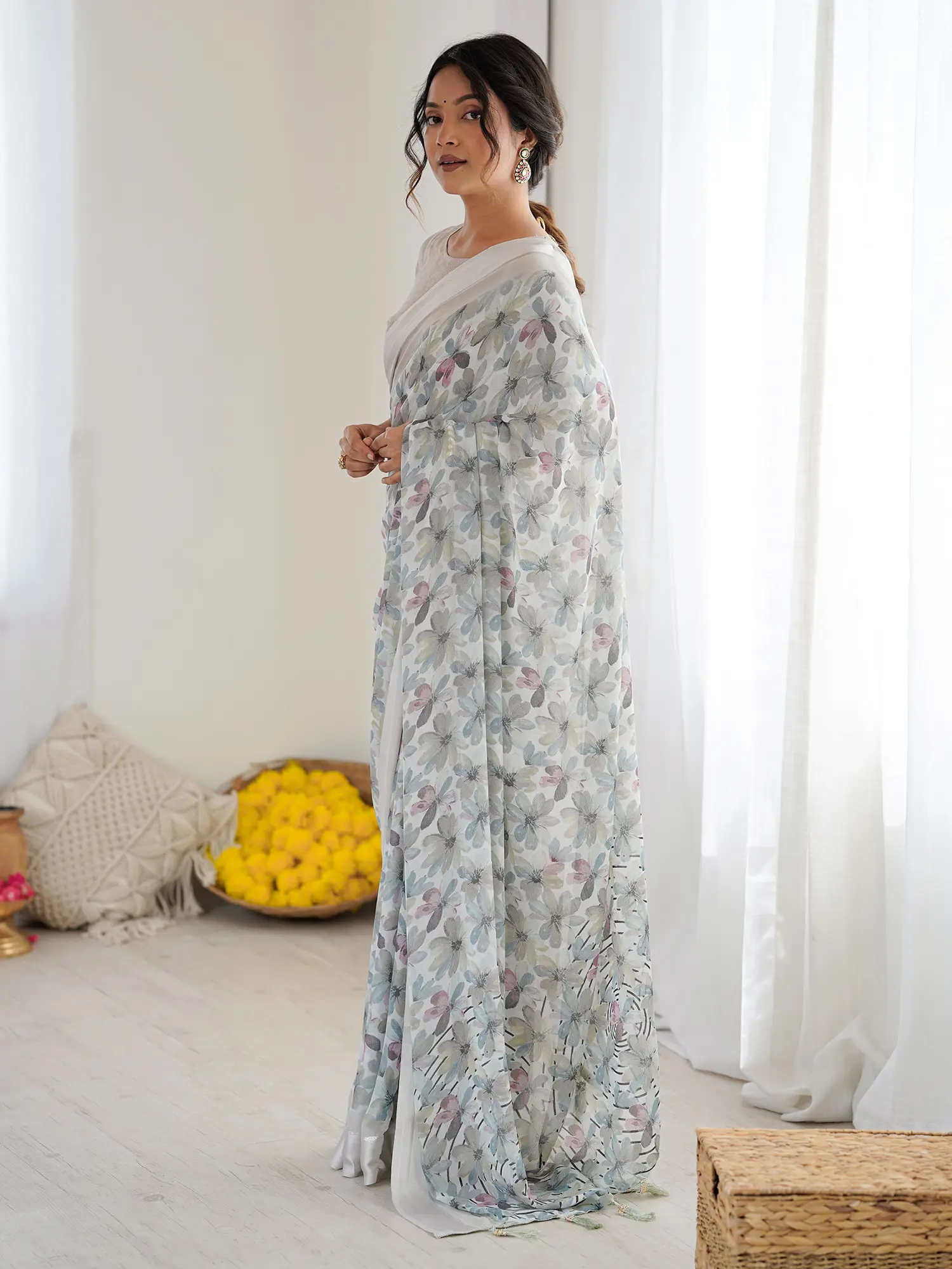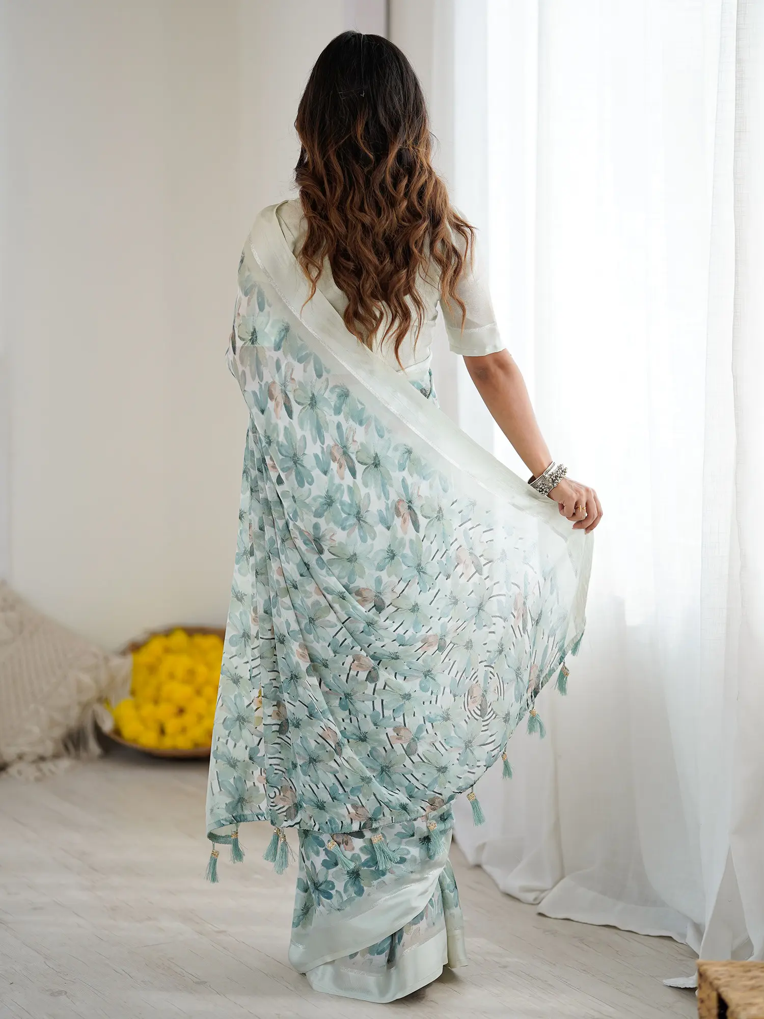 Slub Linen Saree with Floral Zari Border and Anchal