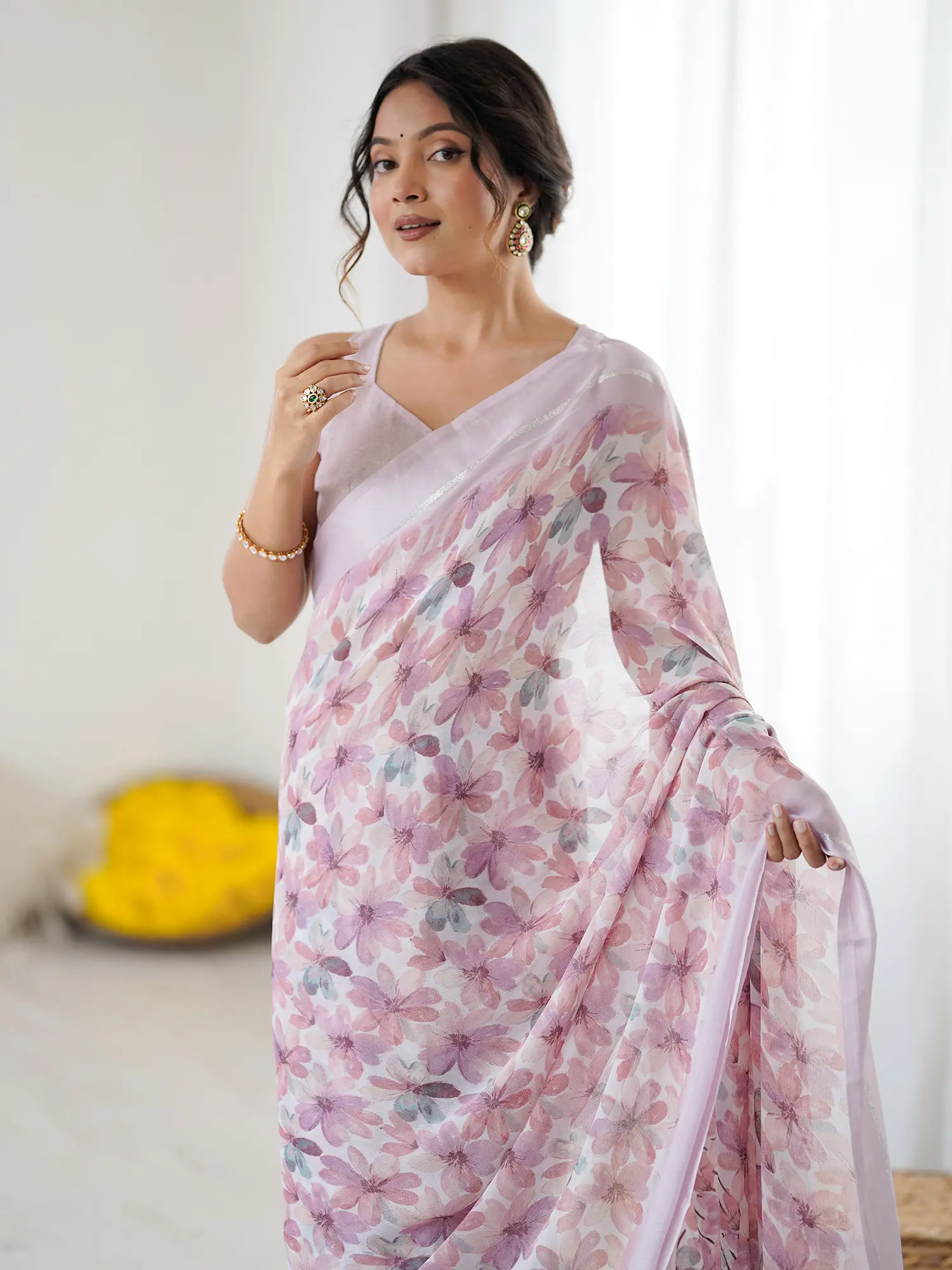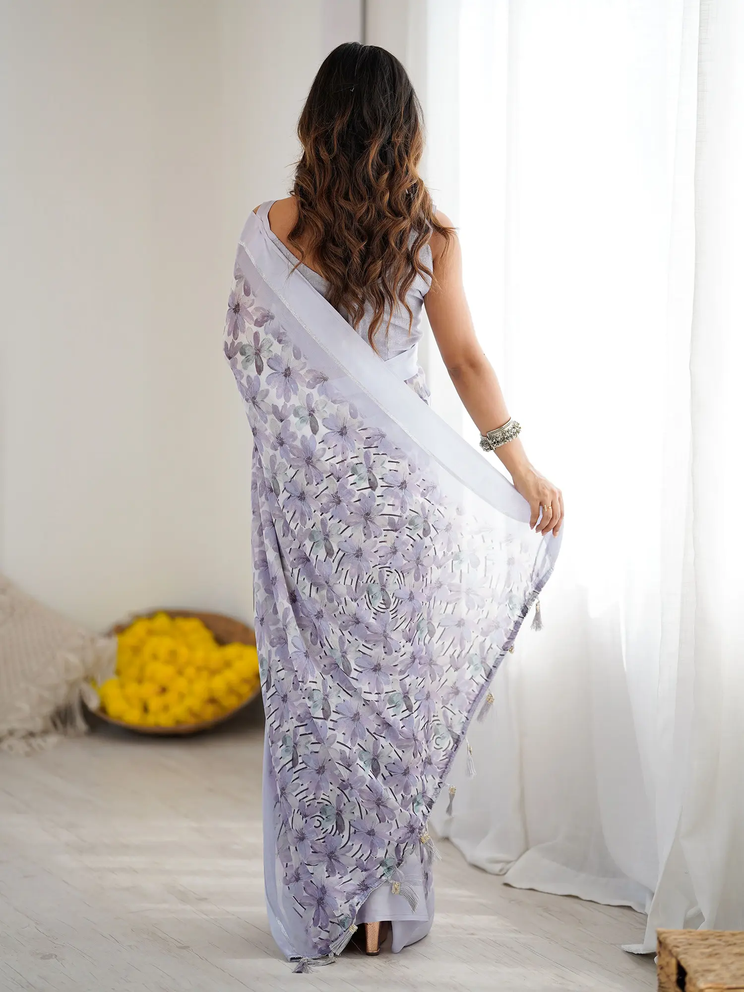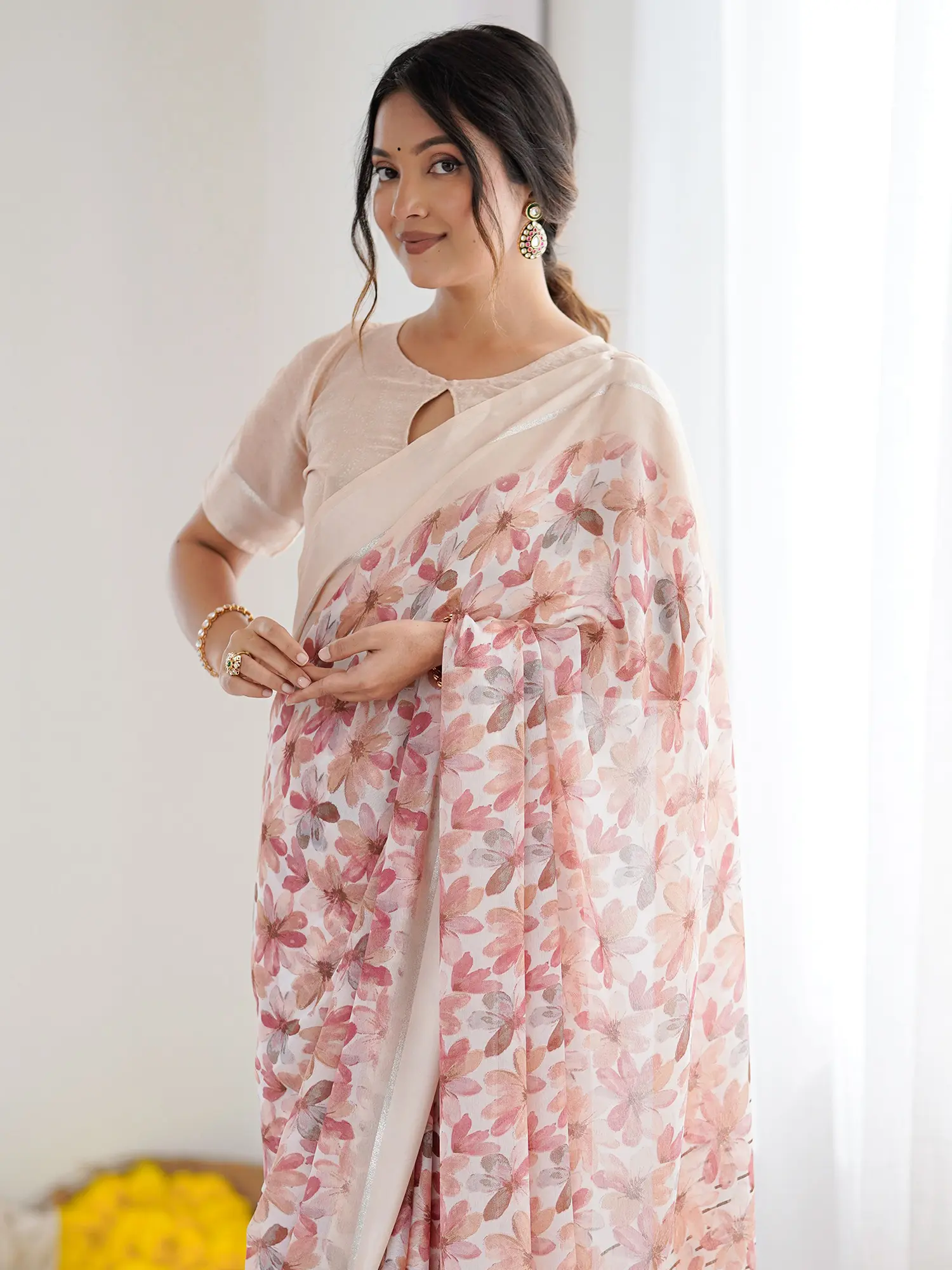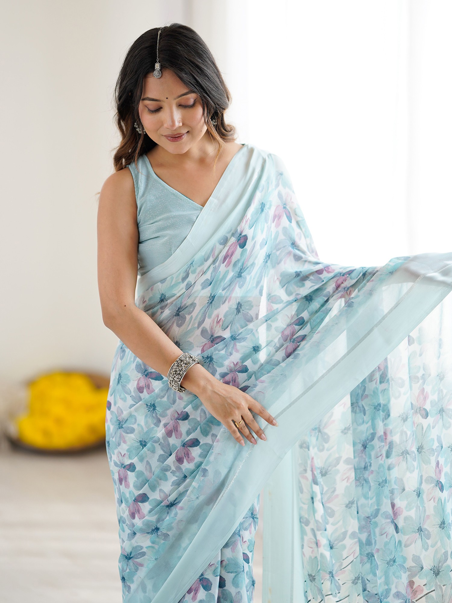 Elegant Designer Printed Mirror Cut Work Flowing Georgette Saree For Festive Party Ethnic Wear For Women