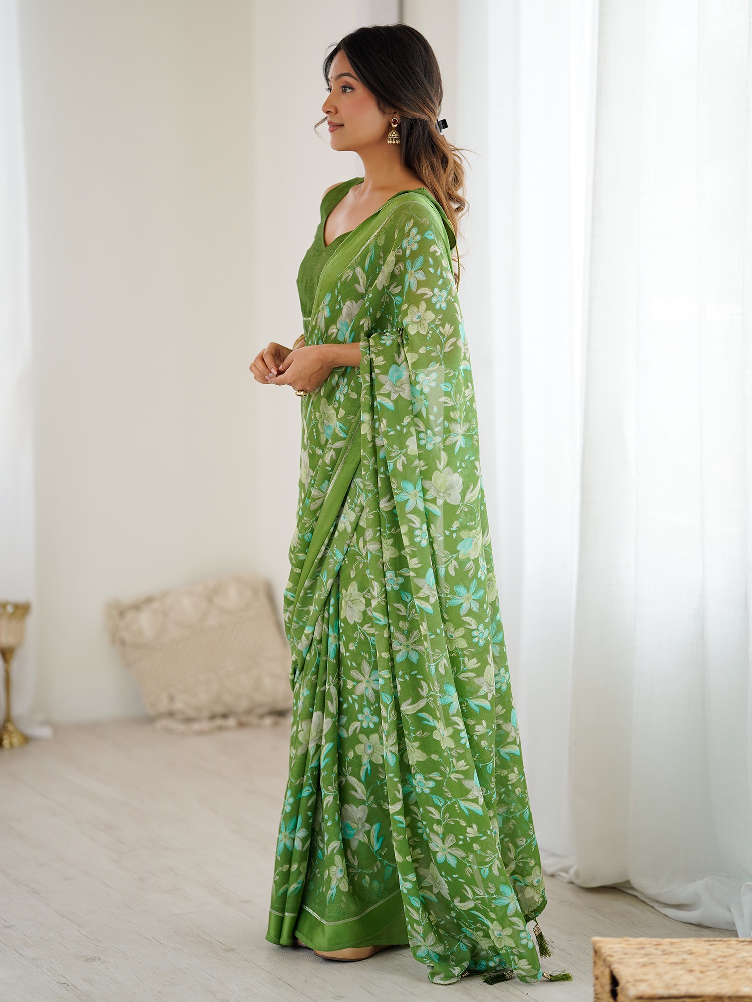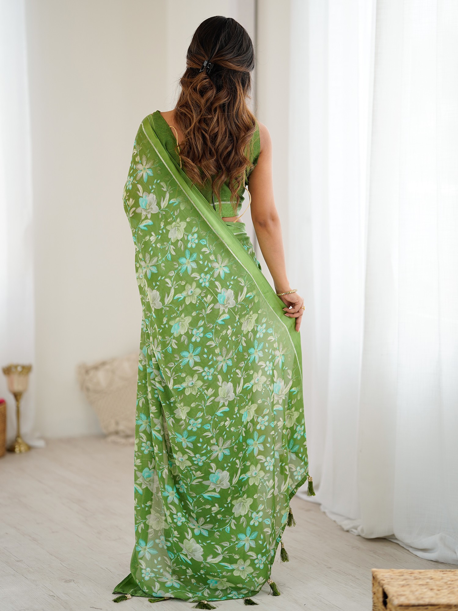 Moss Satin Patta Saree Featuring Woven Patta Designer Printed Floral Motifs Ideal For Partywear Wedding And Festive Celebrations