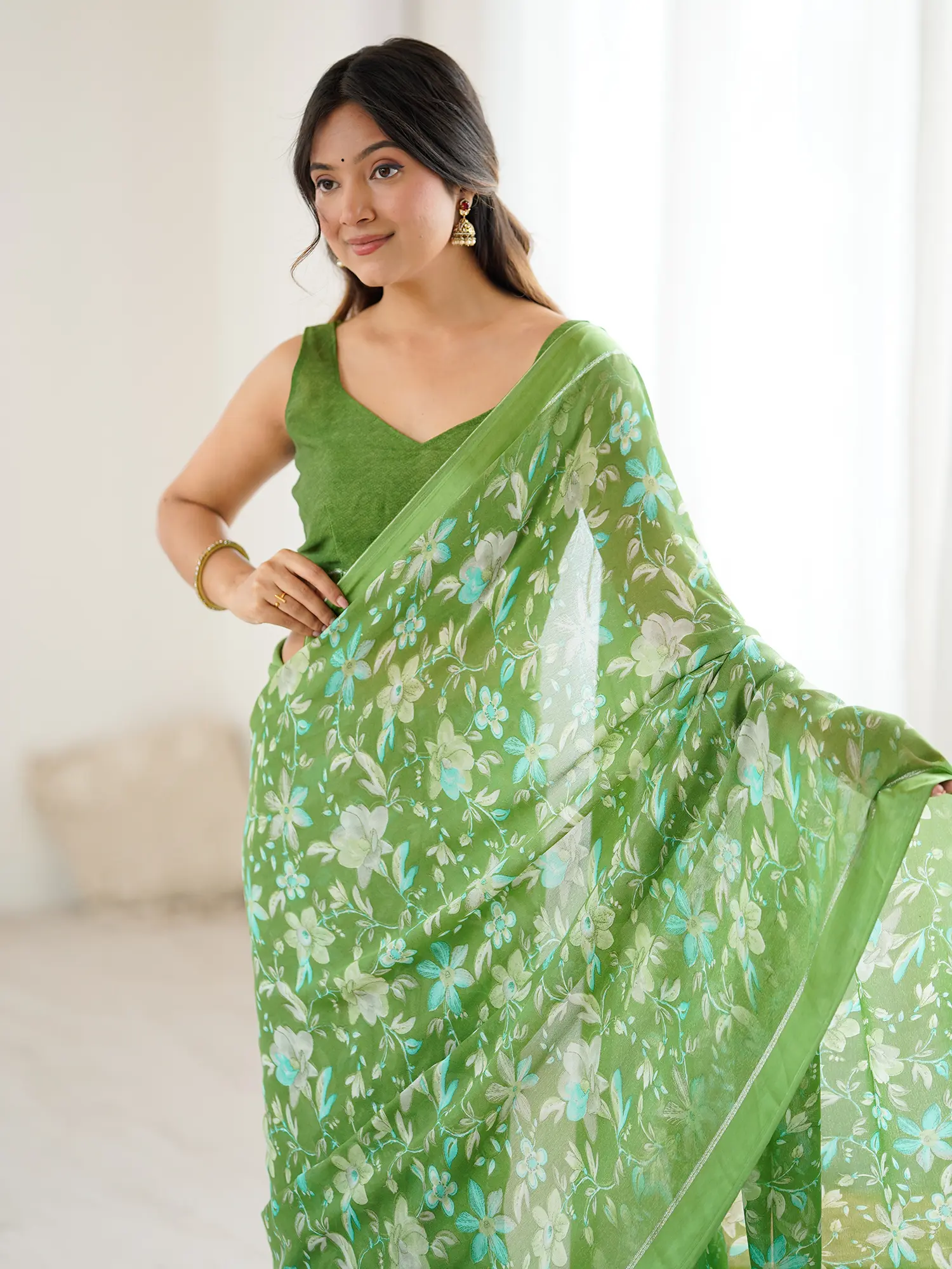 The vibrant green hue serves as a perfect backdrop for the delicate, intricately woven patta designer printed work. You'll appreciate the subtle yet striking floral motifs that bloom across its expanse, lending an air of sophisticated charm. This visual poetry is further enhanced by a complementary blouse and underskirt, tailor-made to complete your ensemble with impeccable polish.