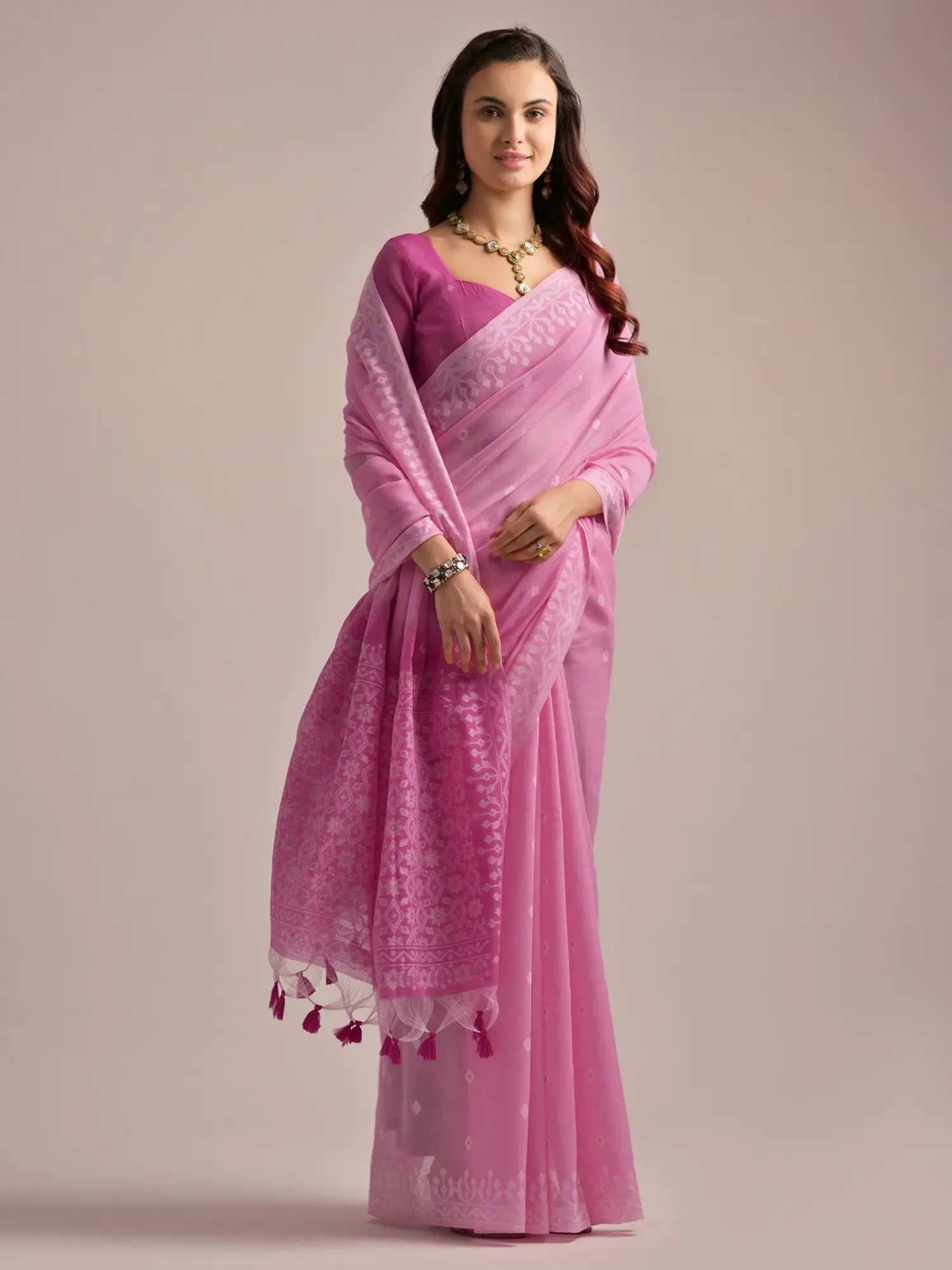 The serene base hue of this saree exudes a calming charm, making it a versatile addition to your wardrobe. The delicate print detailing lends a touch of sophistication, enhancing its overall appeal without overwhelming the senses. But the real magic lies in the contrasting pallu. This bold contrast adds a layer of depth and visual interest, transforming a classic cotton saree into a statement piece. Further enhancing the pallu are the playful tassels that add a youthful and vibrant finish.