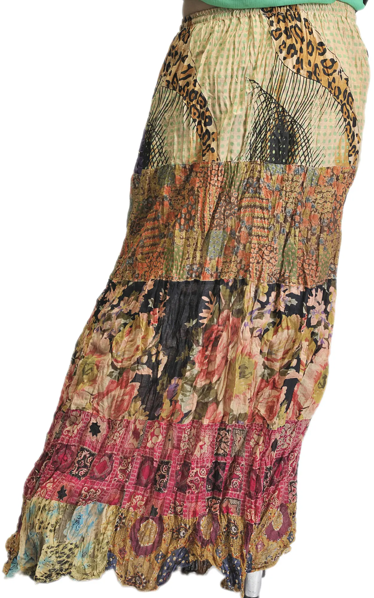The journey down the skirt unfolds into a delightful array of patterns. A textured section with earthy tones and intricate designs is followed by a bold floral panel featuring a dramatic black backdrop that makes the colorful blooms pop. Further down, a rich tapestry of traditional motifs in shades of pink, red, and black creates a sense of depth and cultural richness. The crushed elastic fabrication not only adds a unique, textured dimension but also ensures a comfortable and forgiving fit, allowing for easy movement and a relaxed silhouette. Delicate metallic threads are subtly woven throughout, catching the light and adding a touch of subtle shimmer, elevating the skirt from casual to captivating.