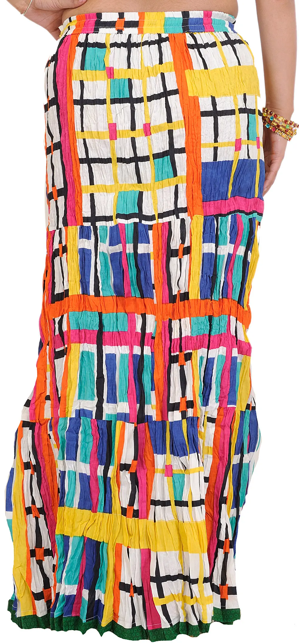 Immerse yourself in a world of vibrant energy with this stunning long skirt. Designed to capture attention and exude effortless charm, this piece is a true celebration of color. The eye-catching print features a dynamic arrangement of checks and stripes, rendered in a bold palette of yellow, white, blue, teal, orange, and hot pink. This energetic design is perfect for adding a playful yet sophisticated touch to any wardrobe.
