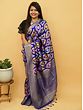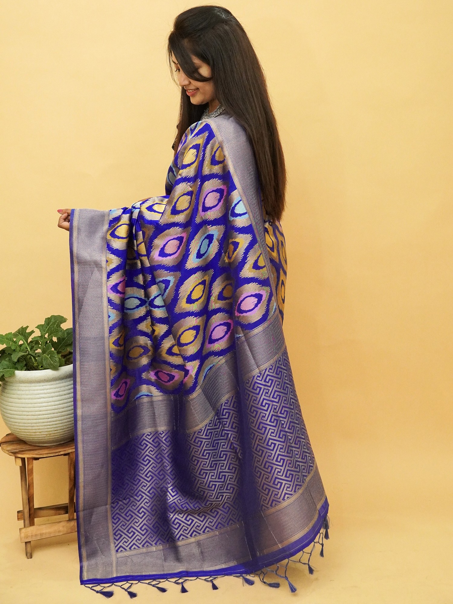 A contemporary turn is taken by this multi-silk Banarasi Saree which is ornamented by large ogee motifs created with Zari giving the drape a beatific appeal.